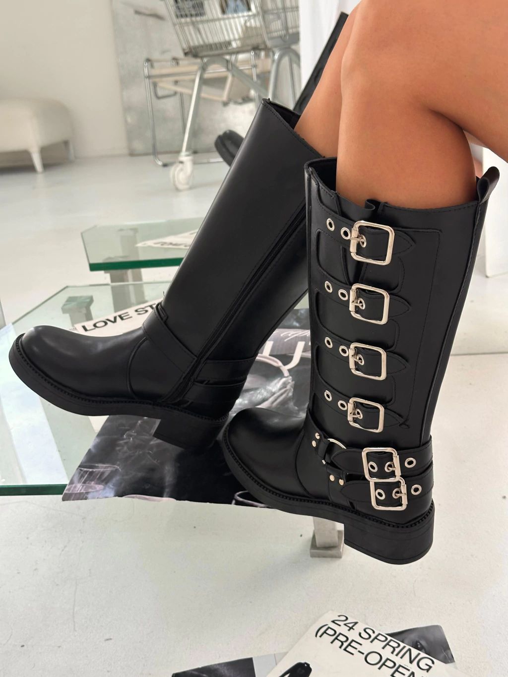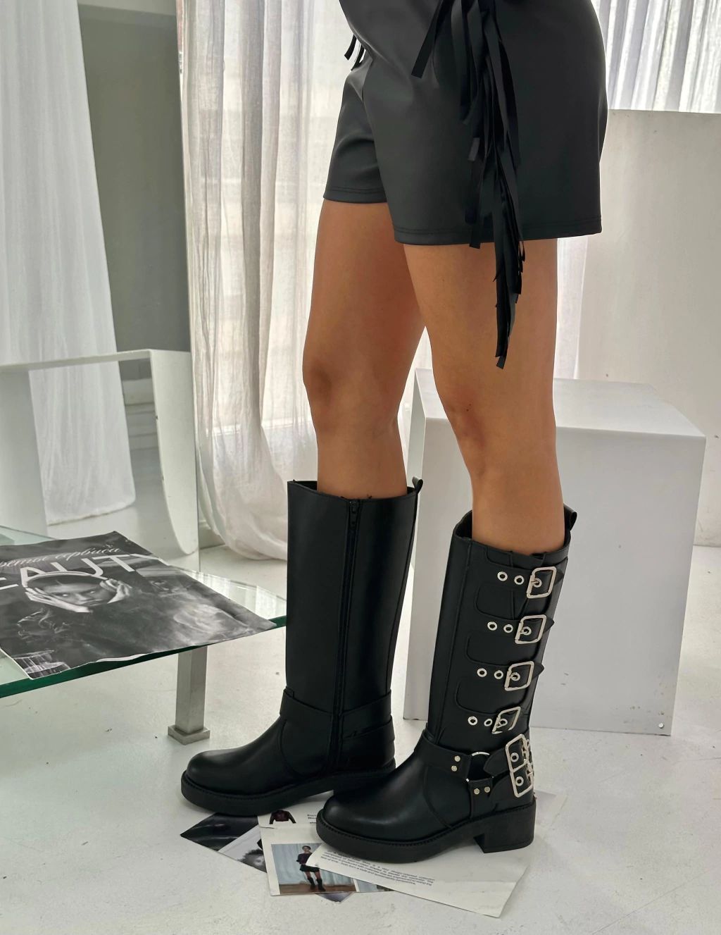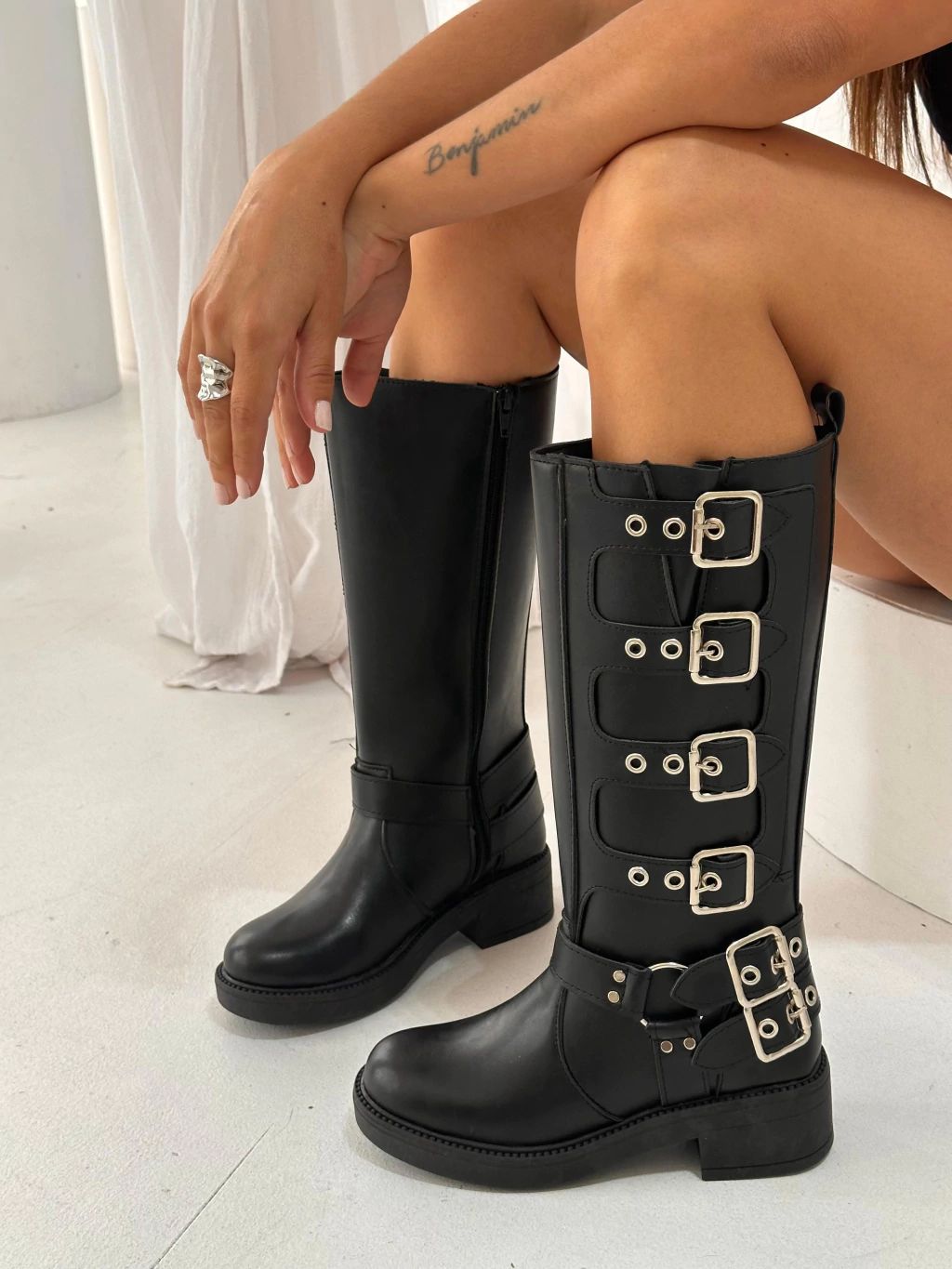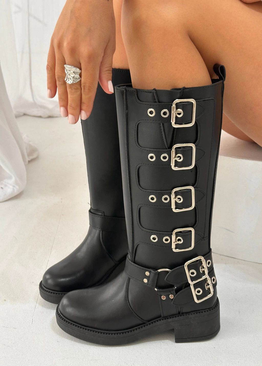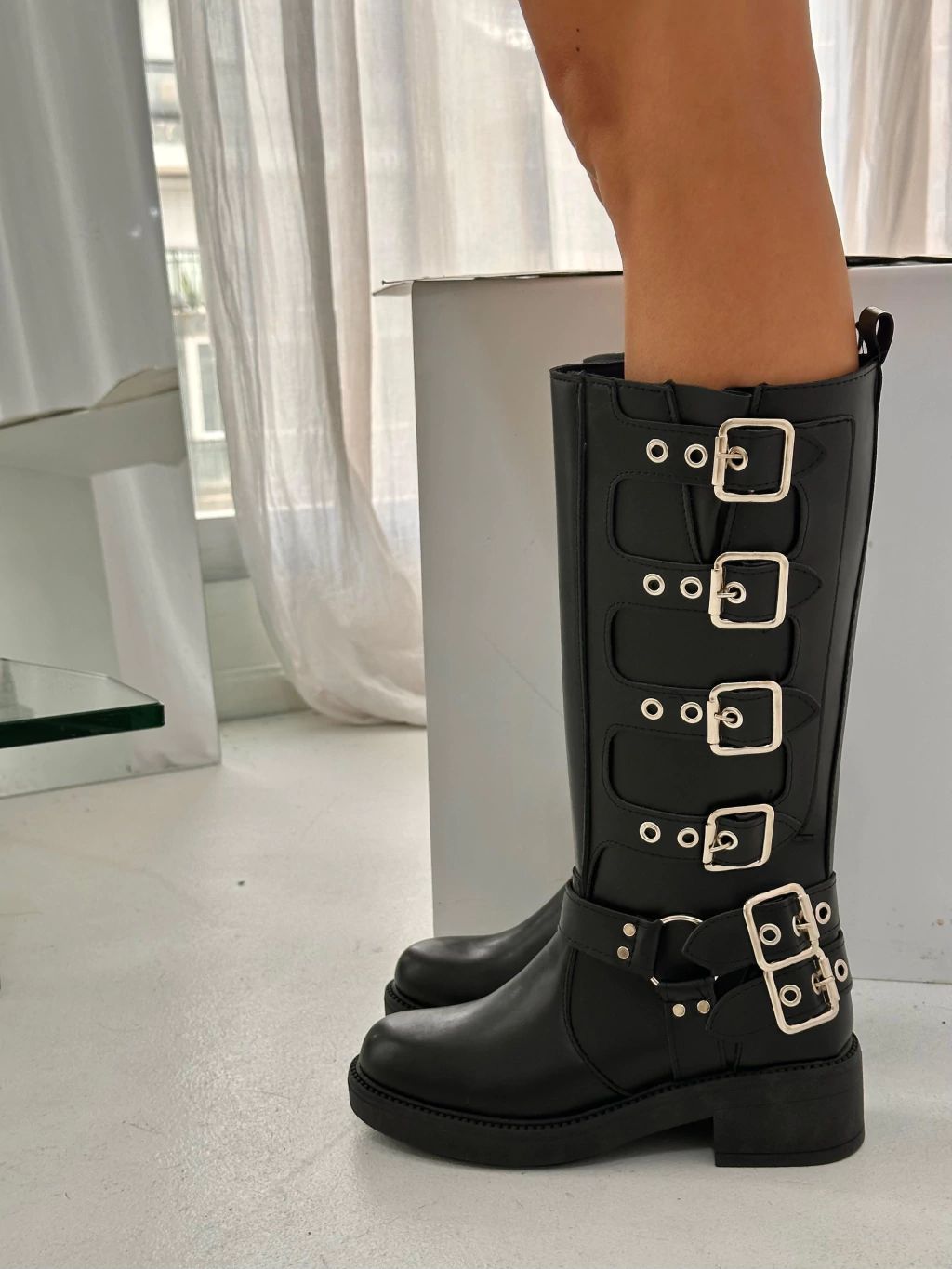 Bota de eco cuero con detalle de cintos y punta redonda.