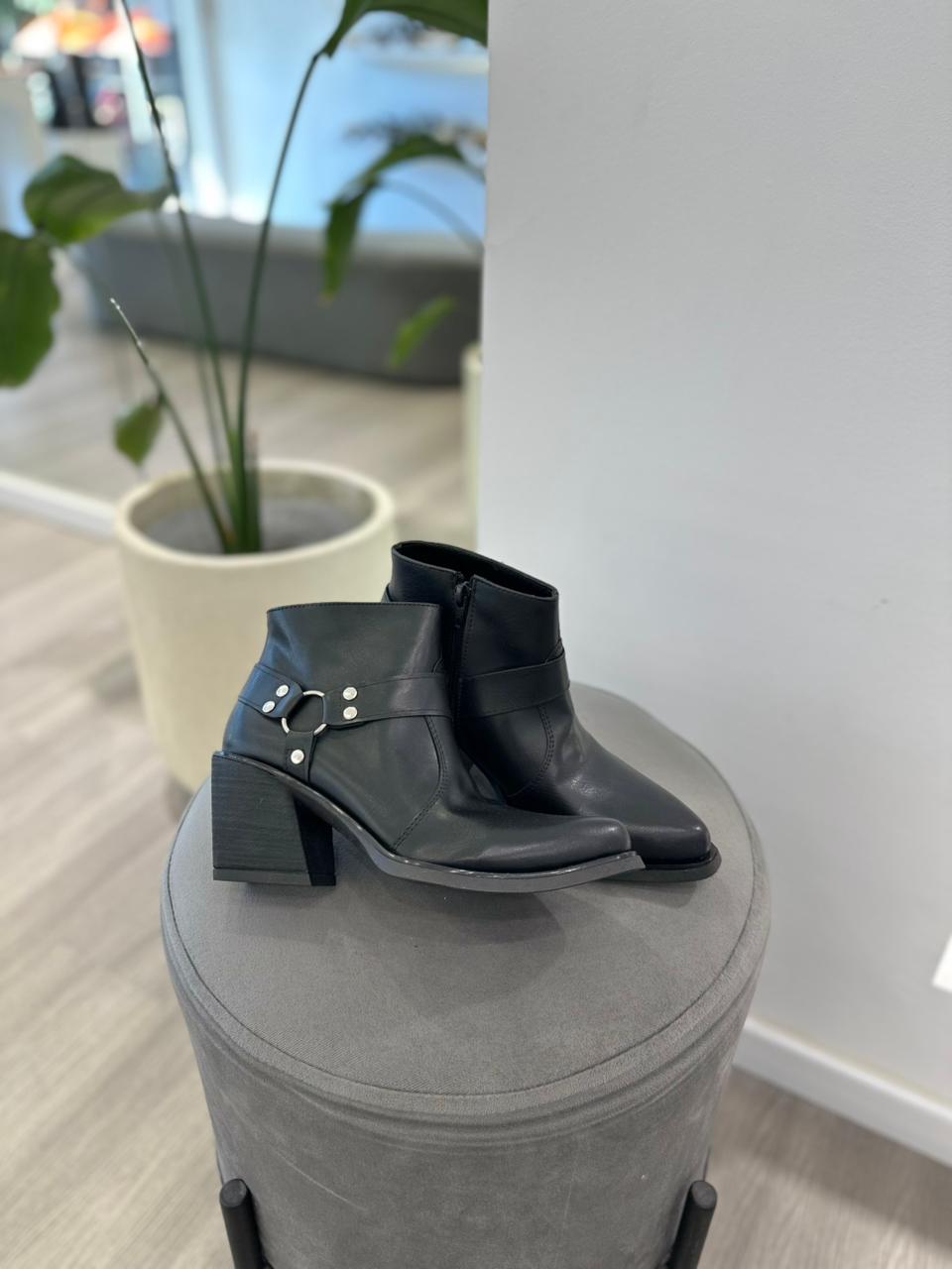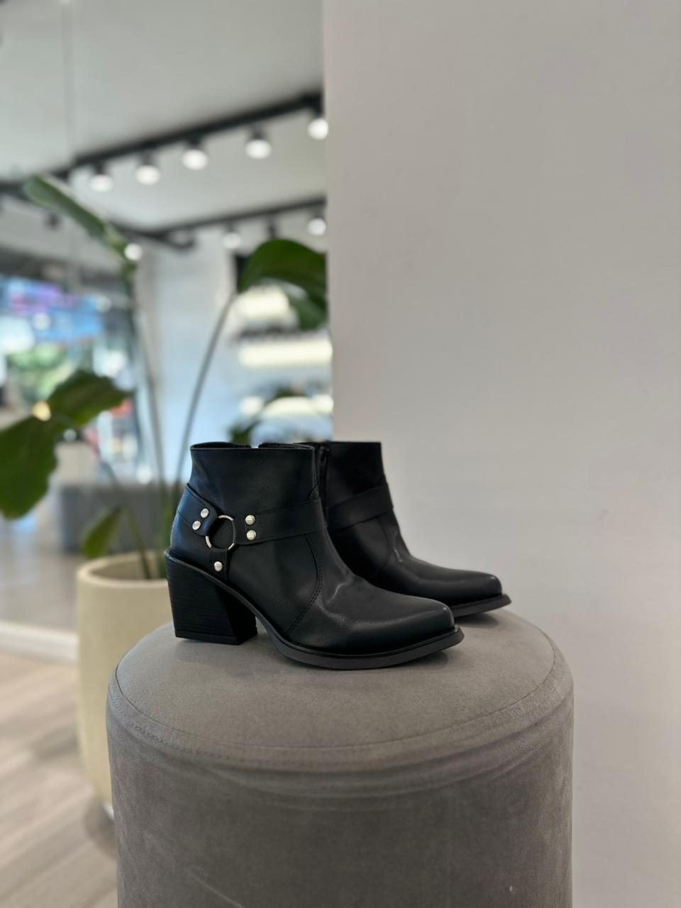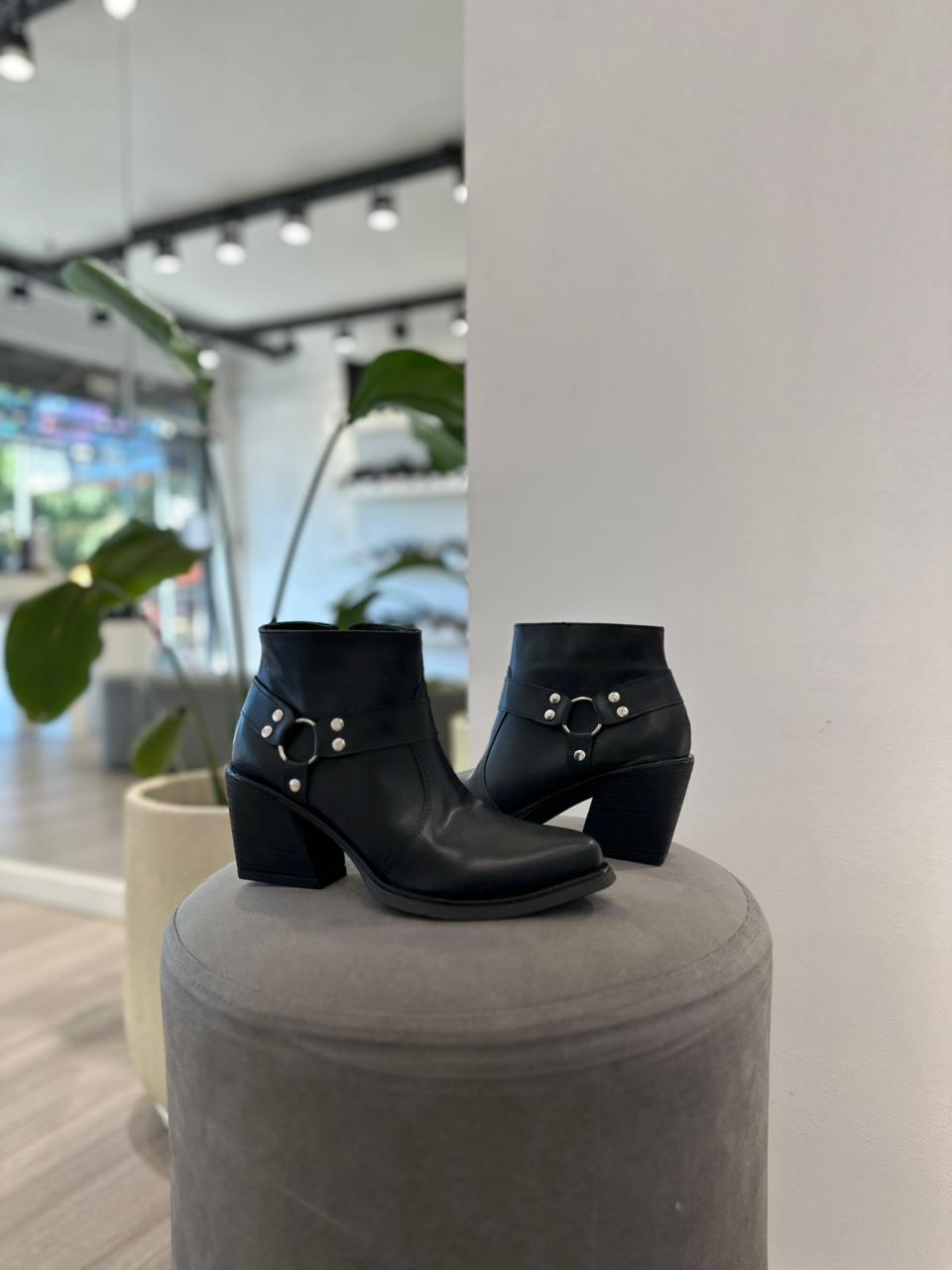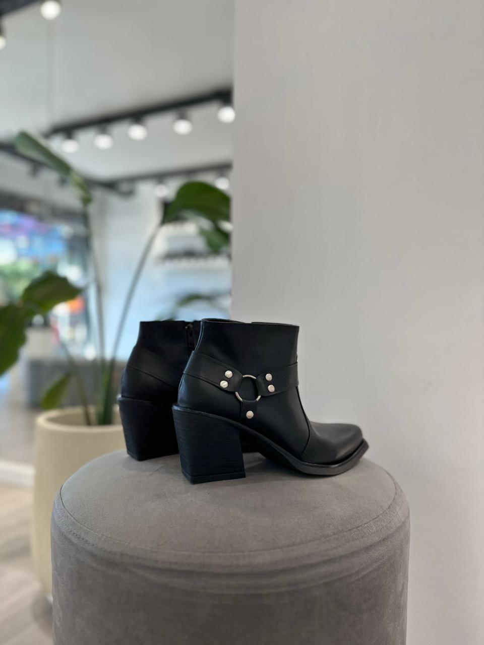 Botita de eco cuero con detalle de tiras y avío en color plateado.