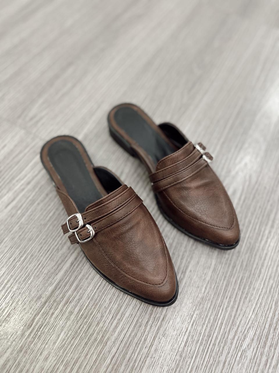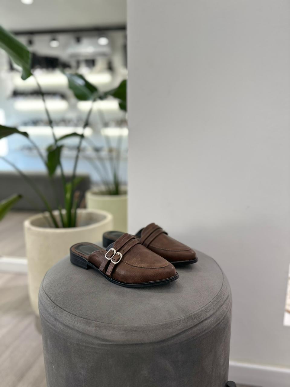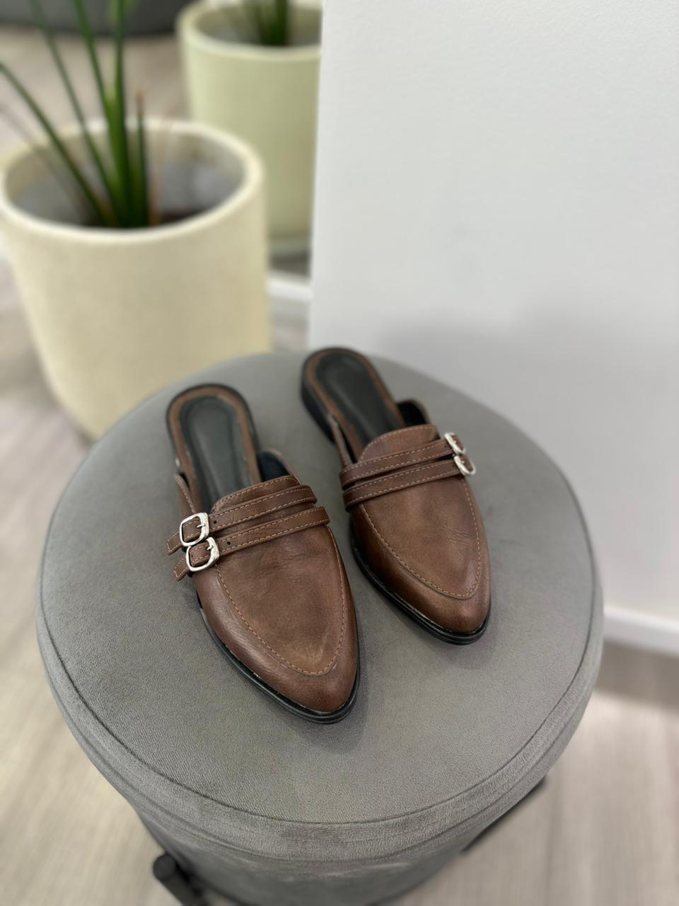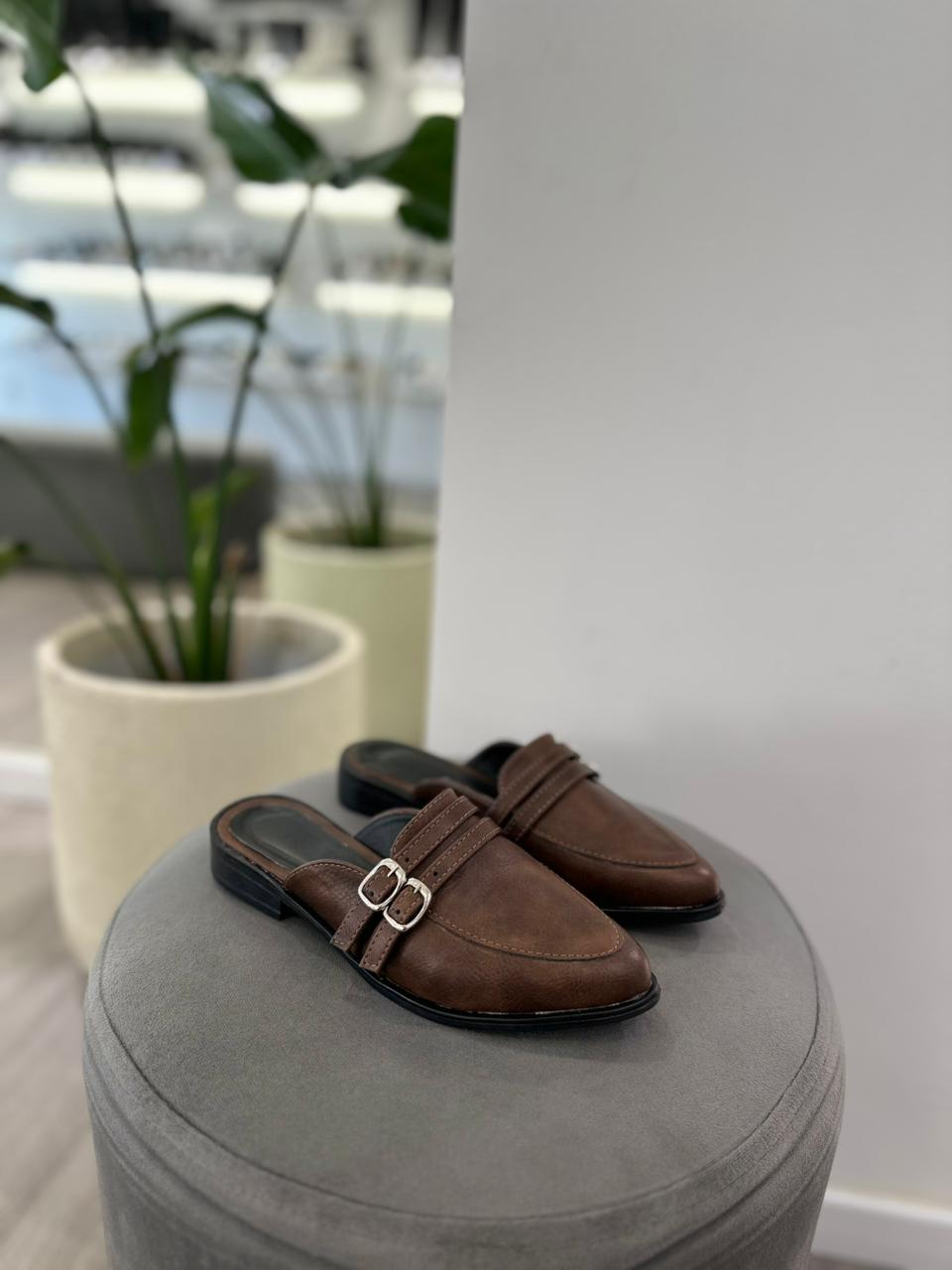 Slipper de eco cuero con detalle de hebillas y taco cuadrado.