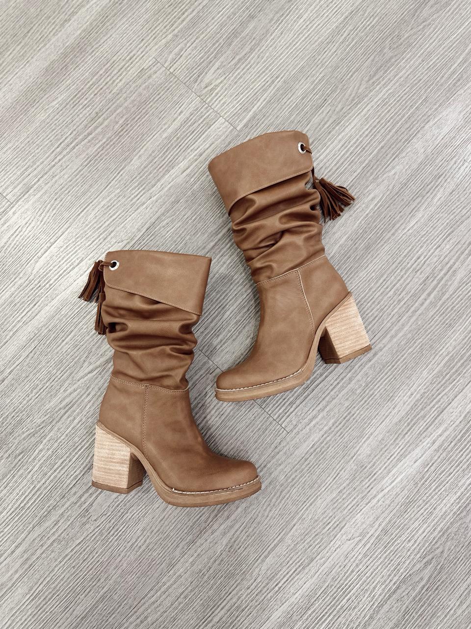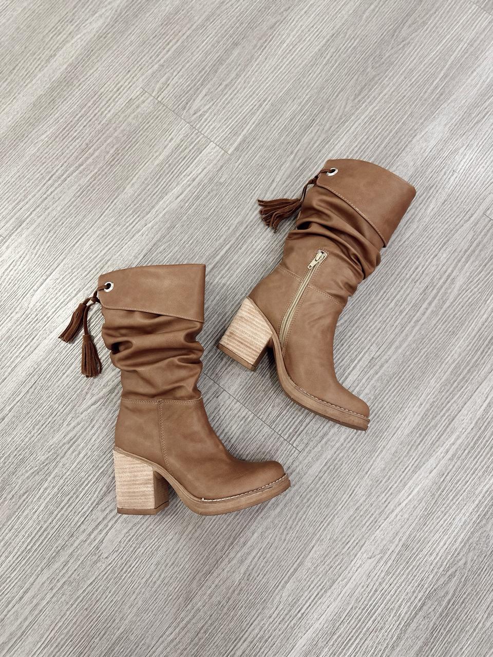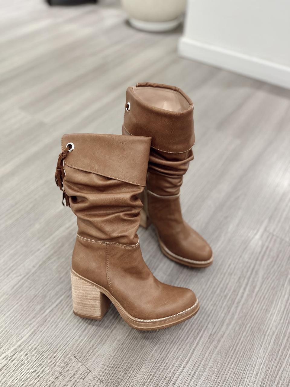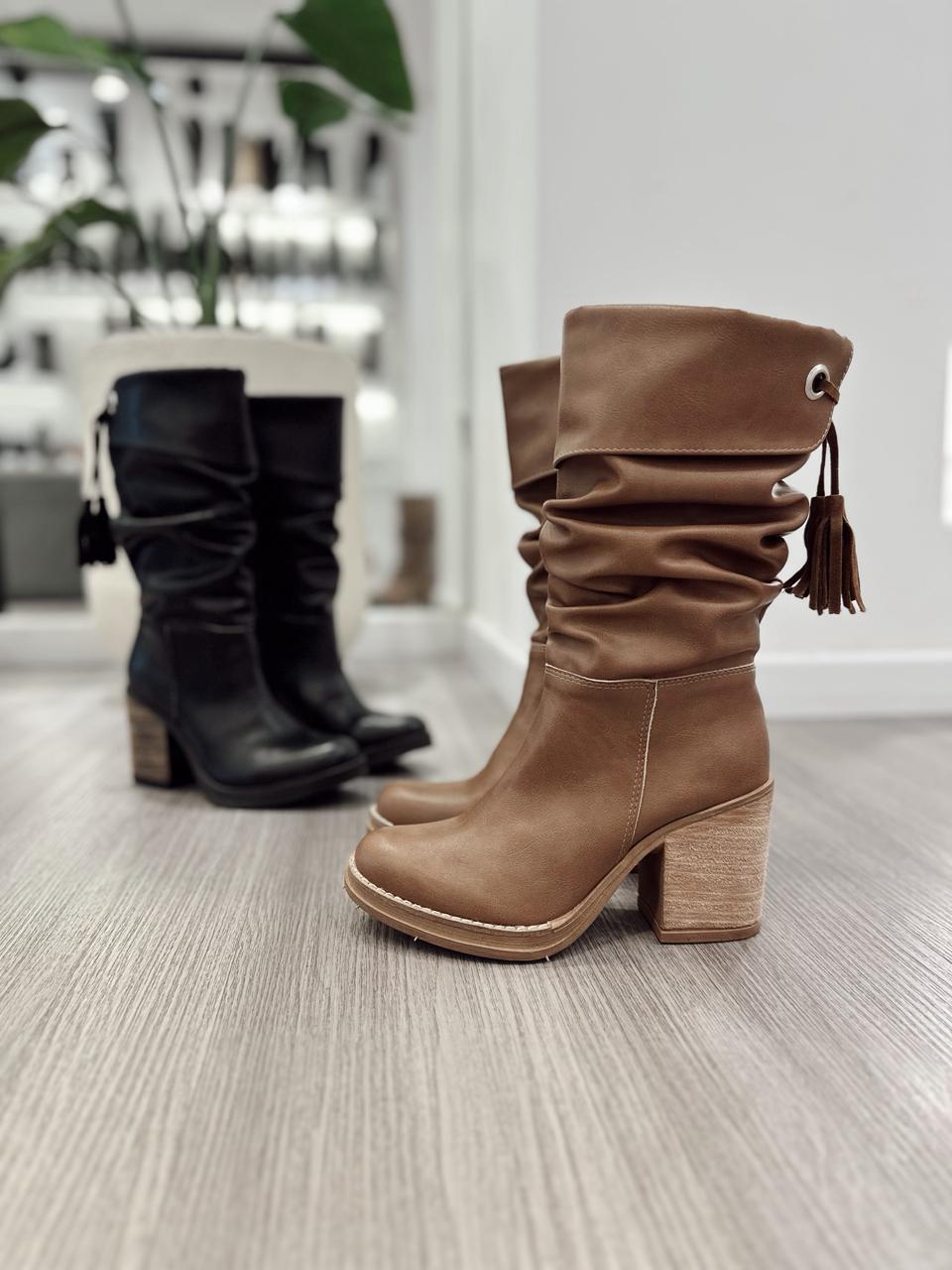 Bota de eco cuero con detalle arrugado y solapa no desmontable. Base de goma antideslizante y simil madera.