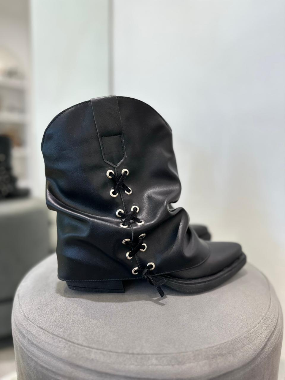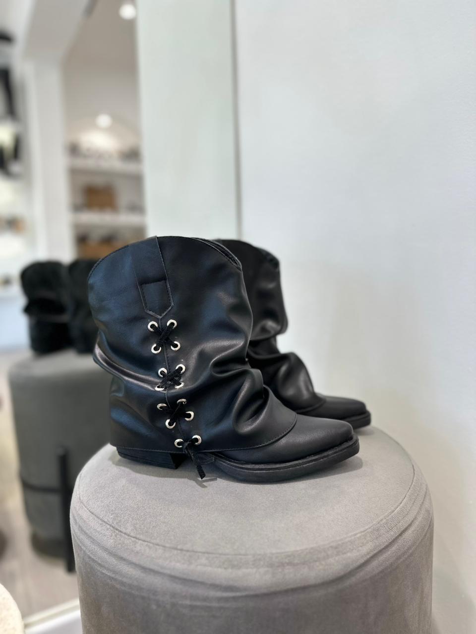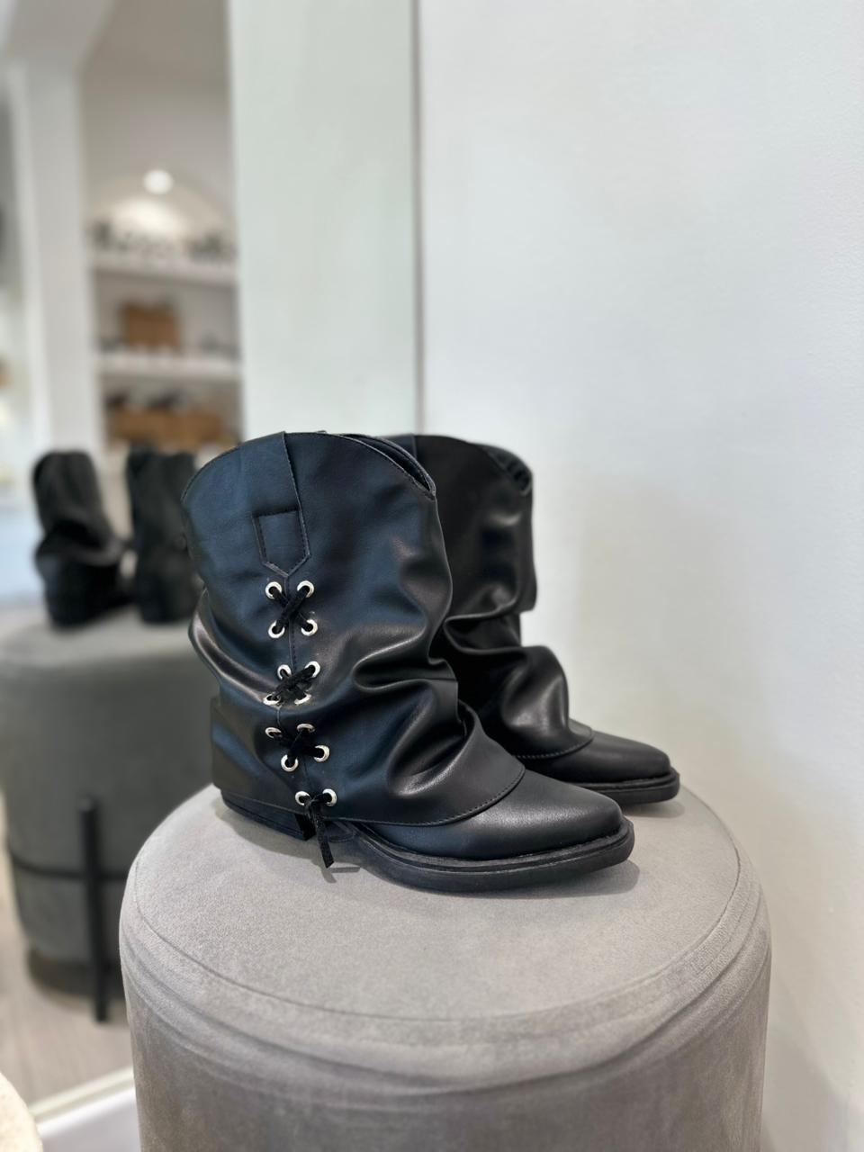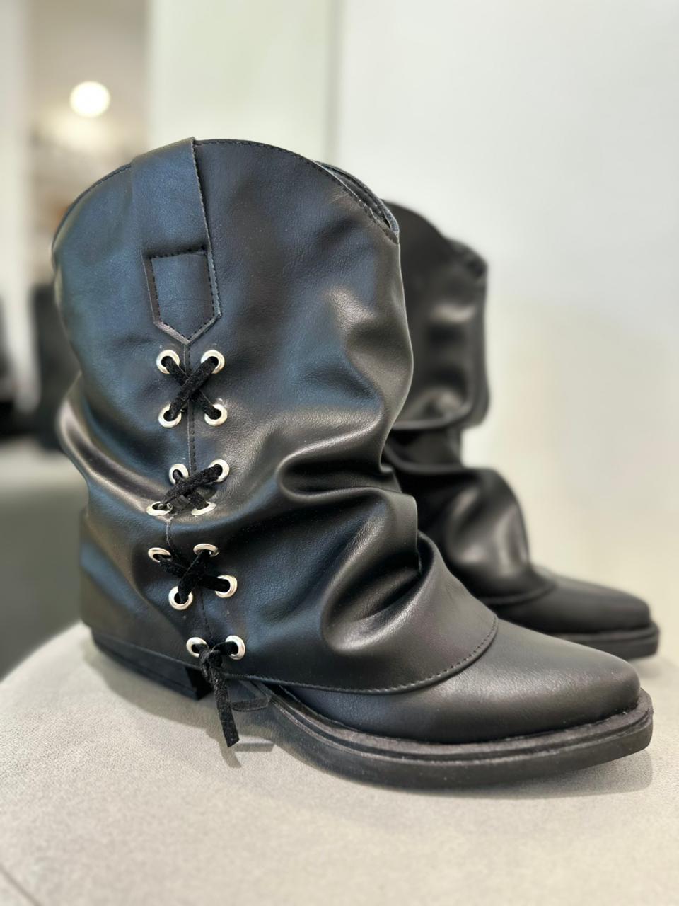 Bota de ecocuero con solapa arrugada y detalle de tiras cruzadas en gamuza (no desmontable).