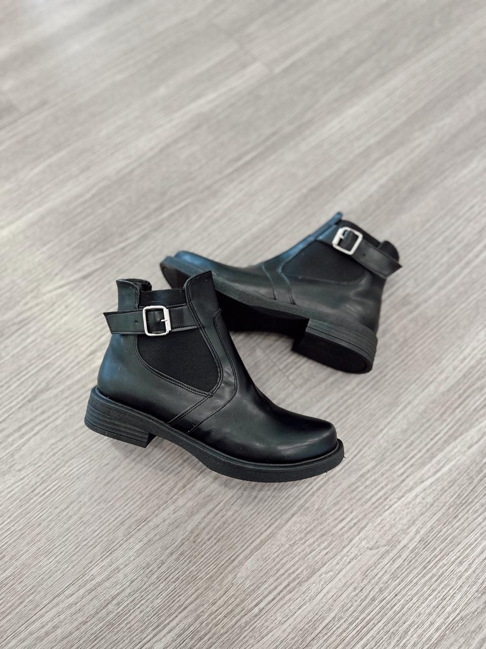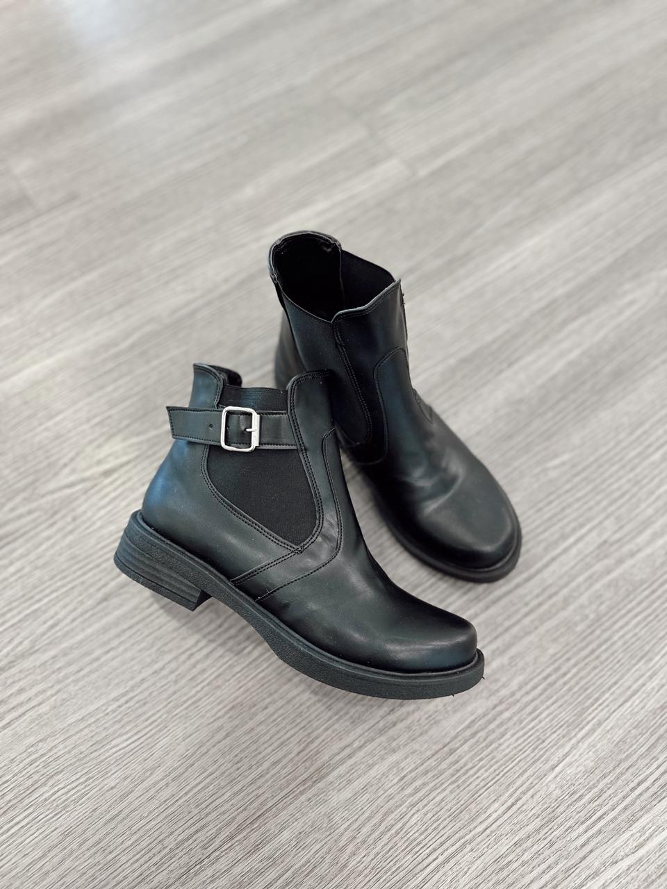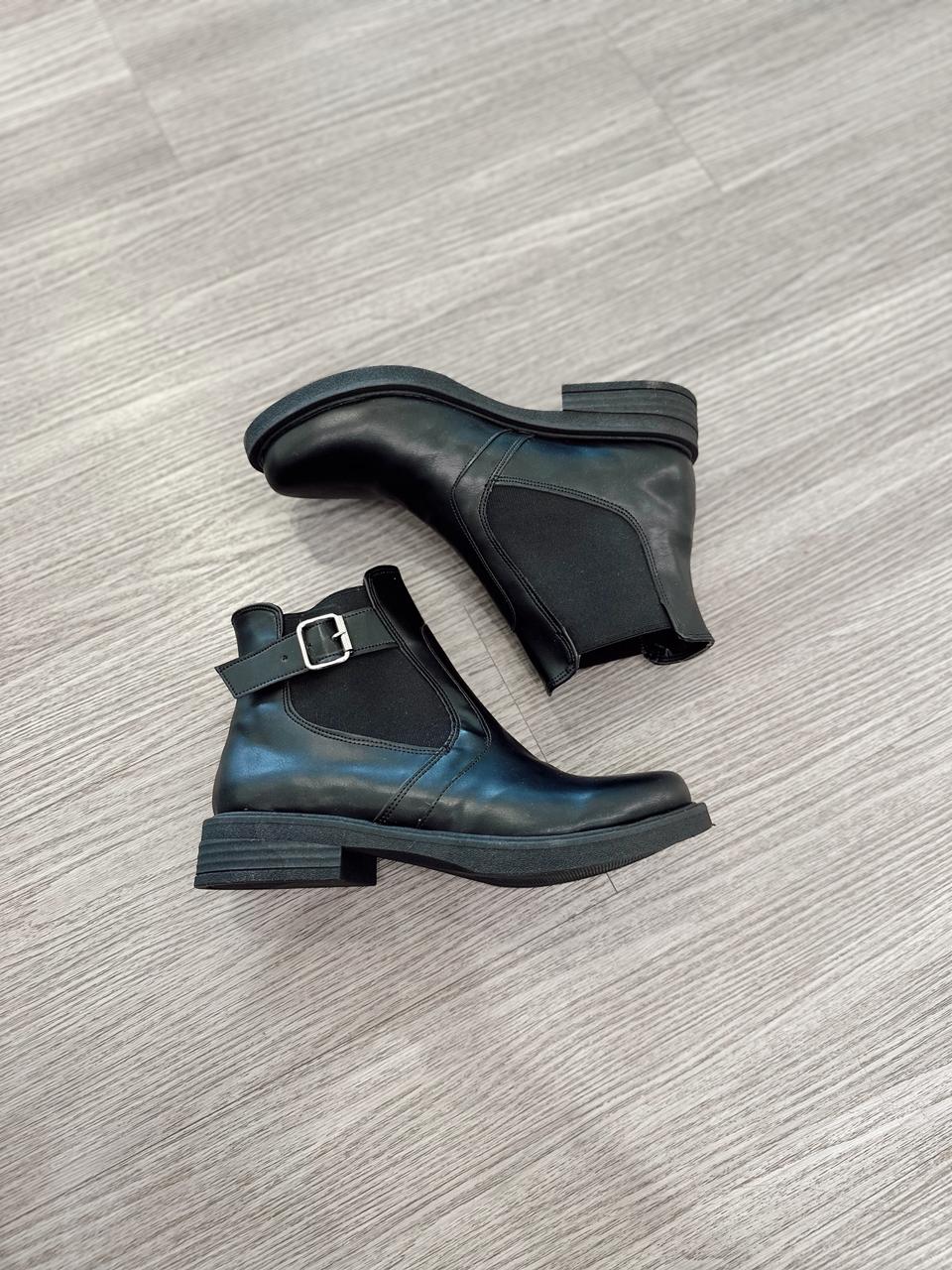 Bota de eco cuero con elastico en los costados, detalle de cinto y base de goma.
