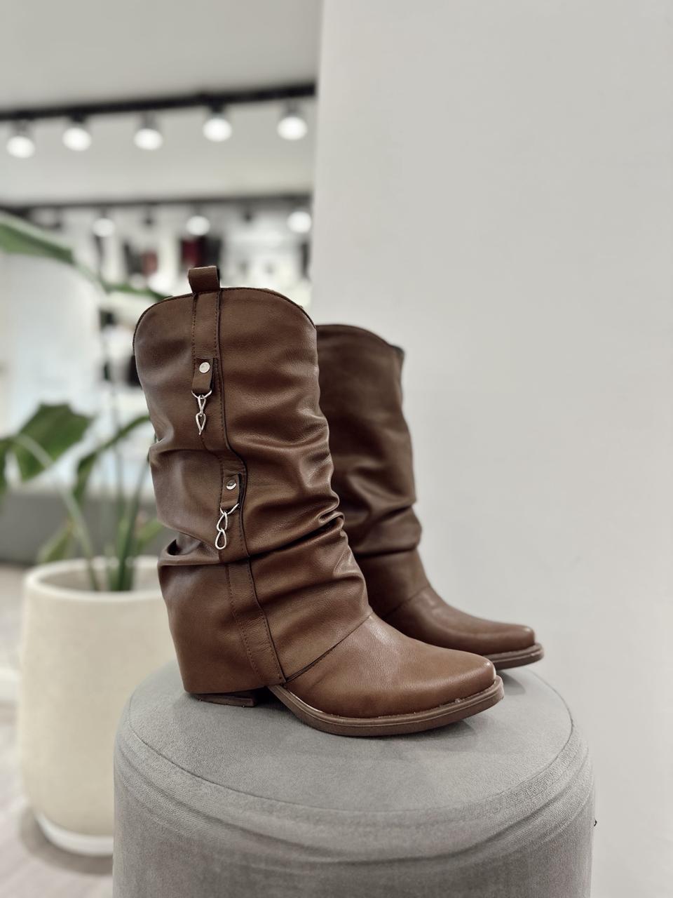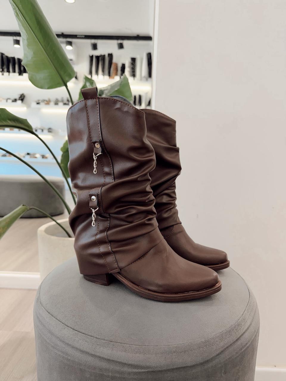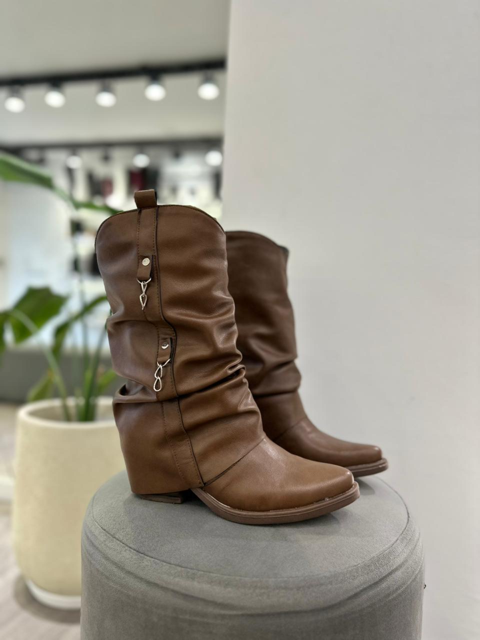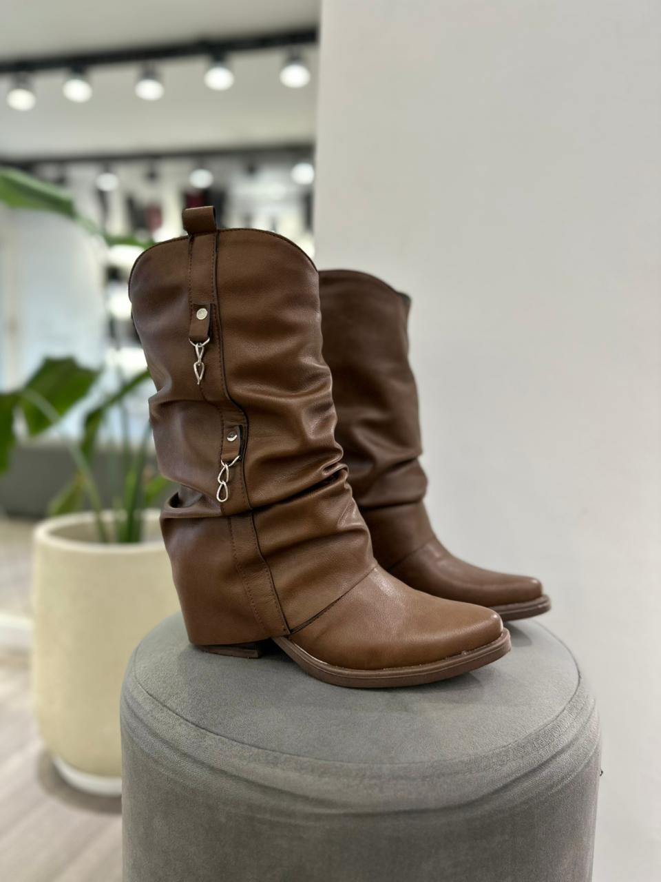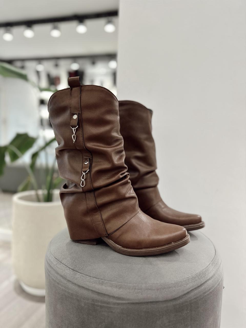 Bota texana con solapa arrugada (no desmontable) y detalle de cadenas.