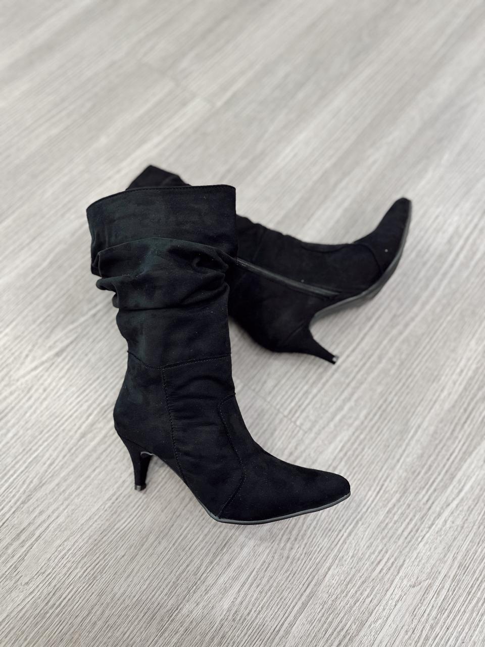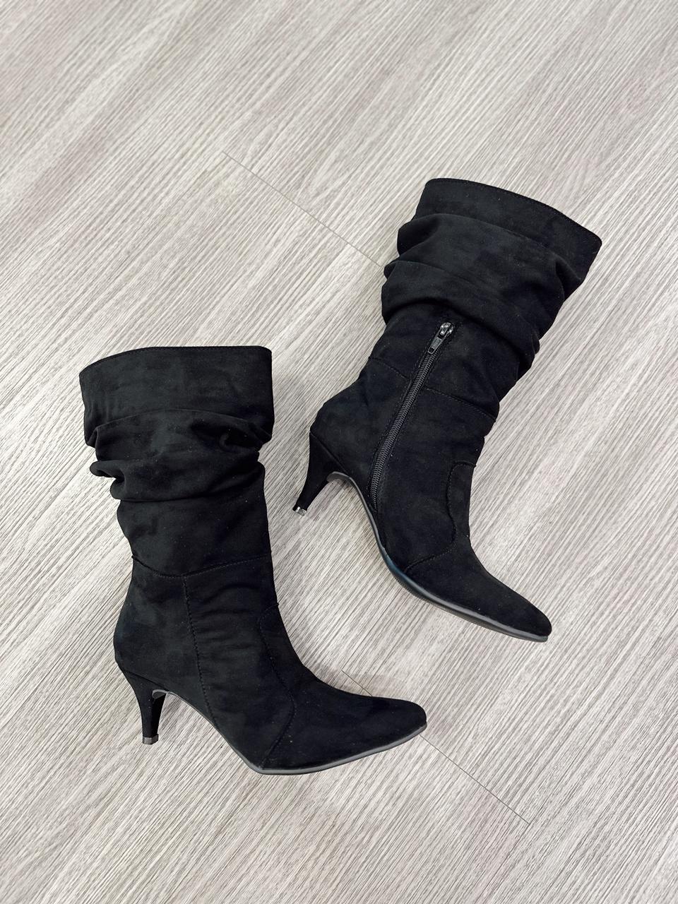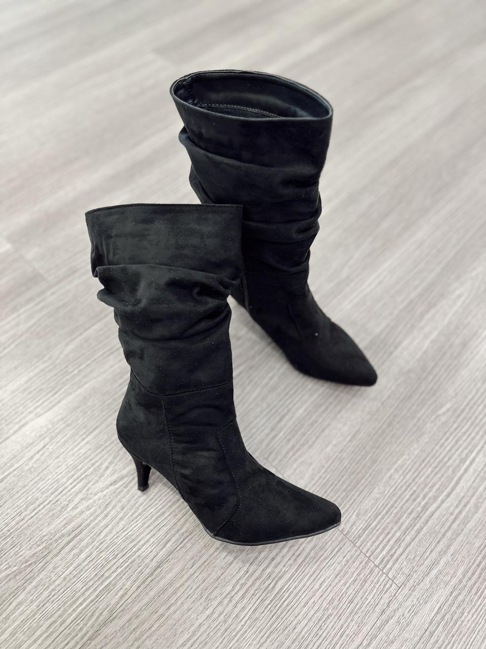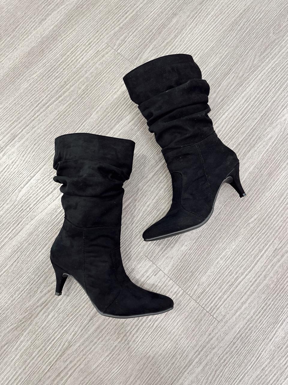 Botas arrugadas confeccionadas es gamuza, taco chupete y cierre hasta mitad de la caña.