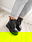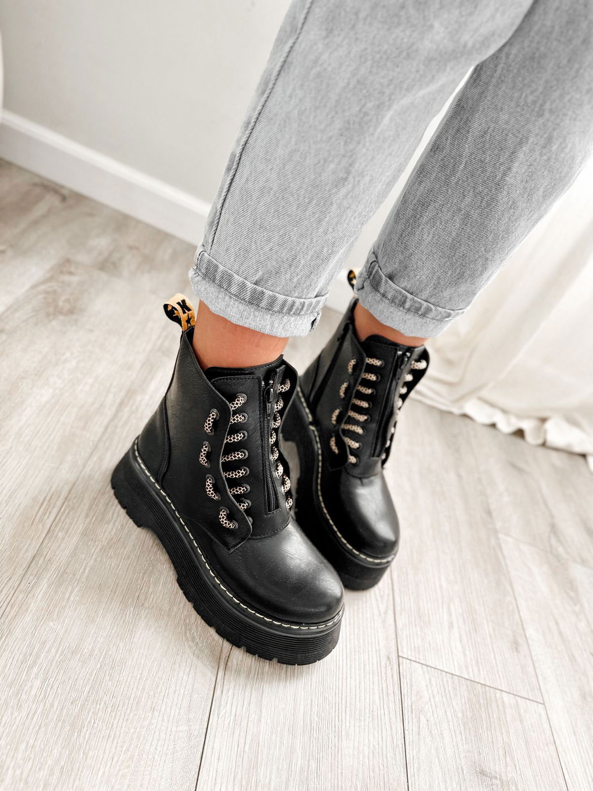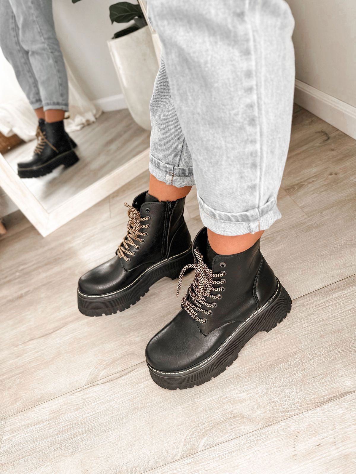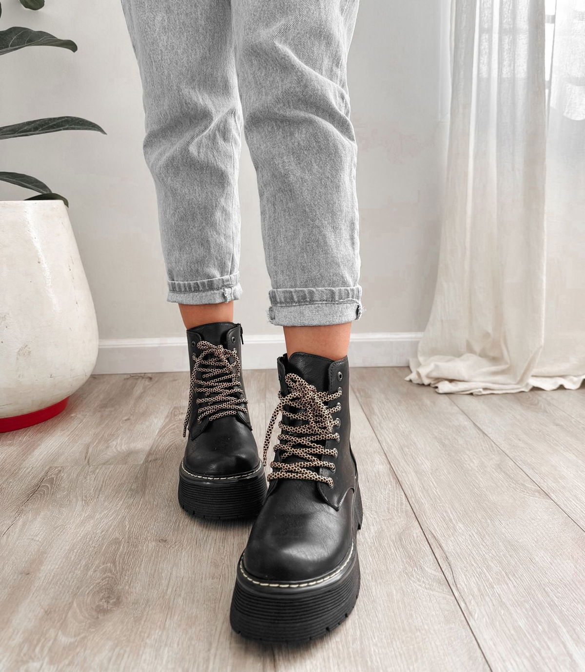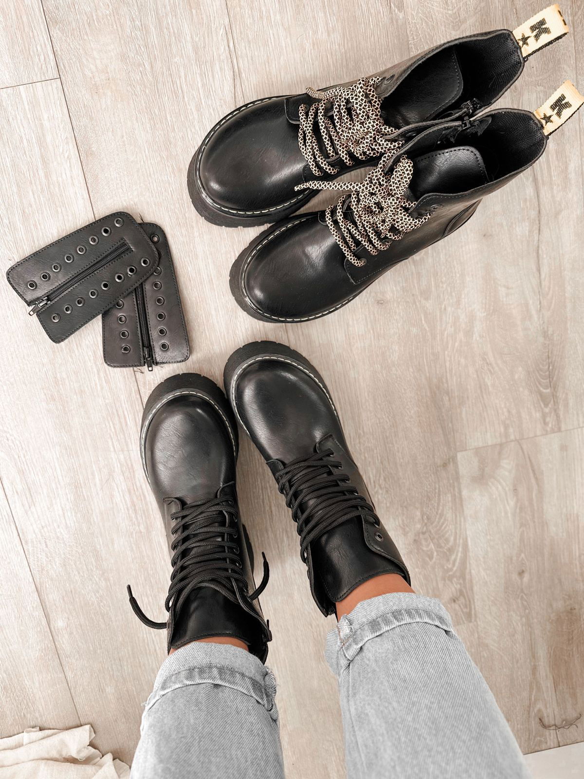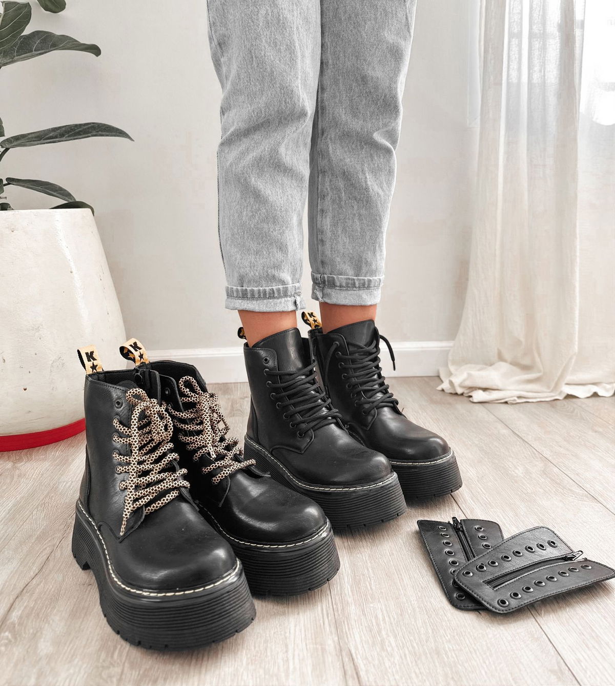 Borcegos de ecocuero con cordones amarillos y negro. Accesorio de cierre para que puedas intercambiarlo.