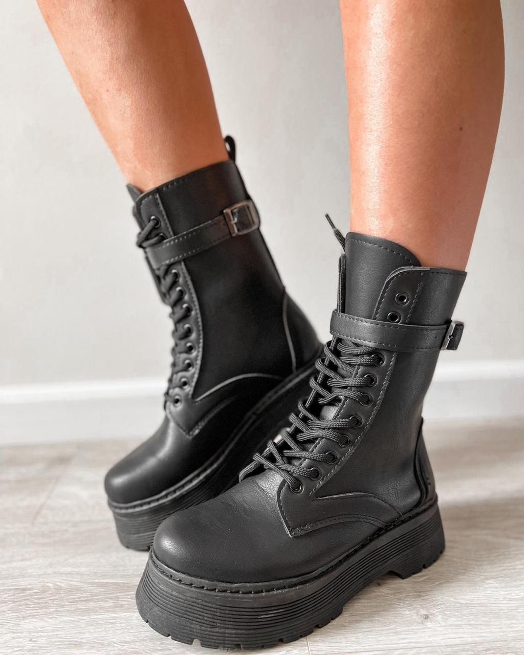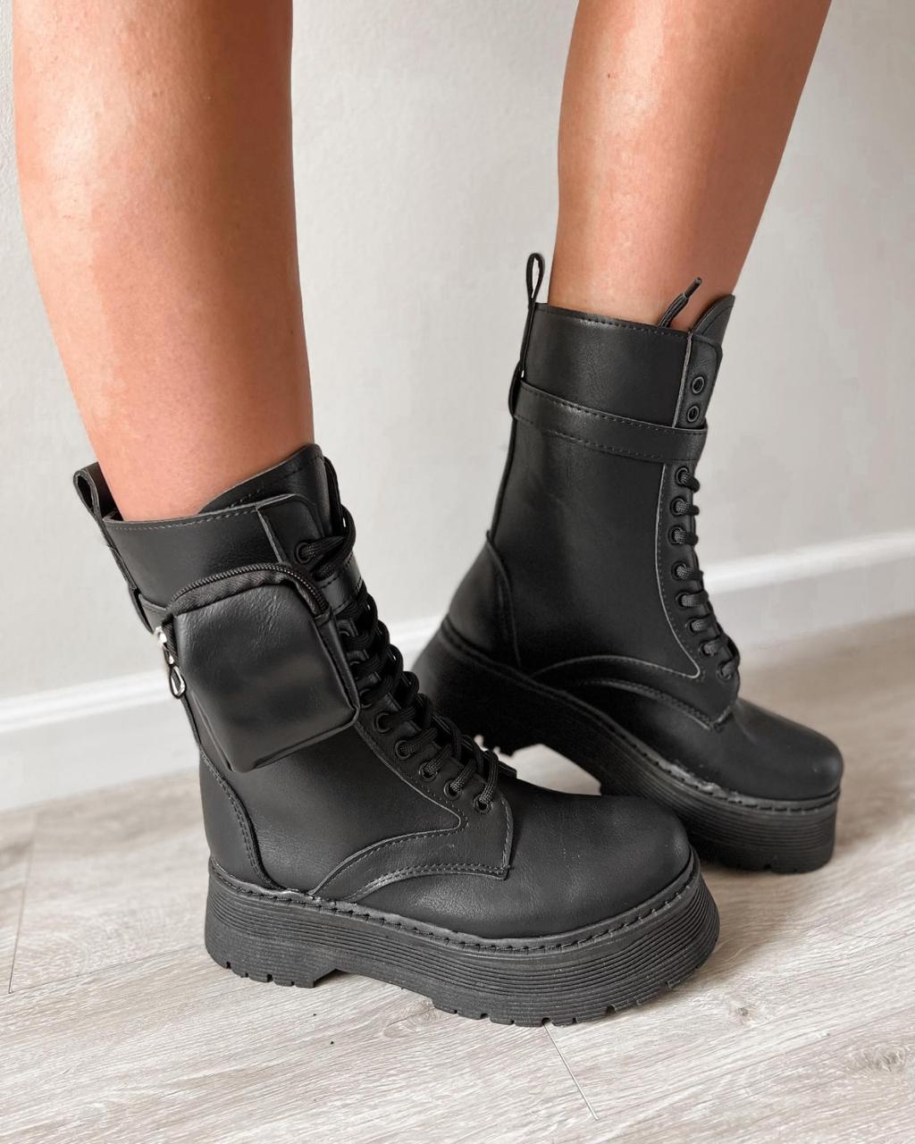 Borcego de eco cuero con cordones y detalle de cintito con bolsillo.