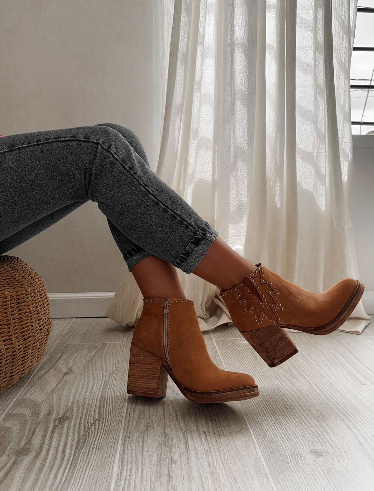 Botas de cuero con tachas, cierre interno y taco de madera.