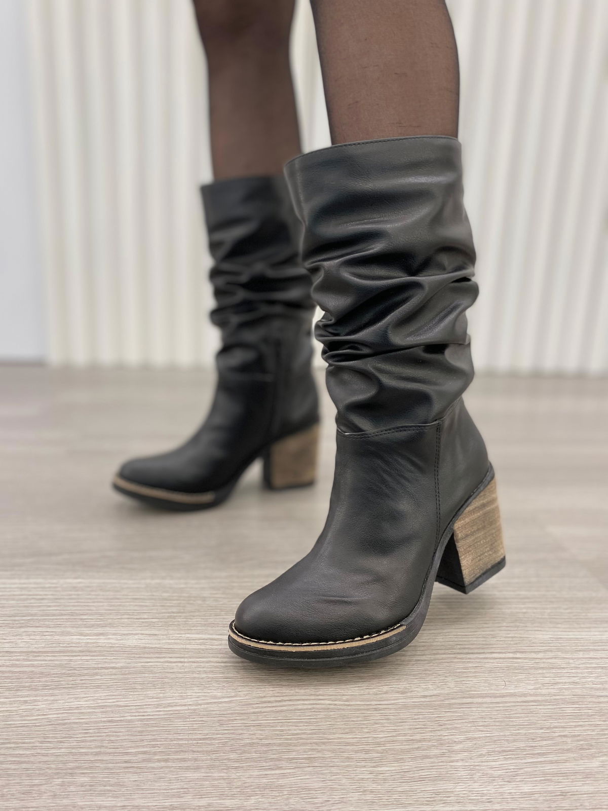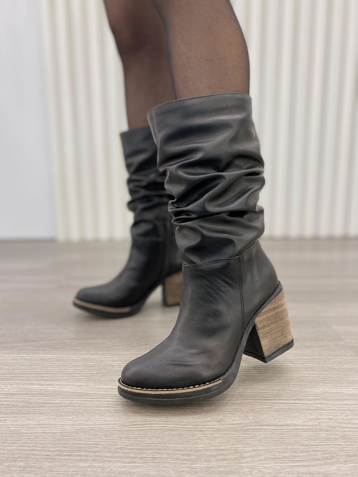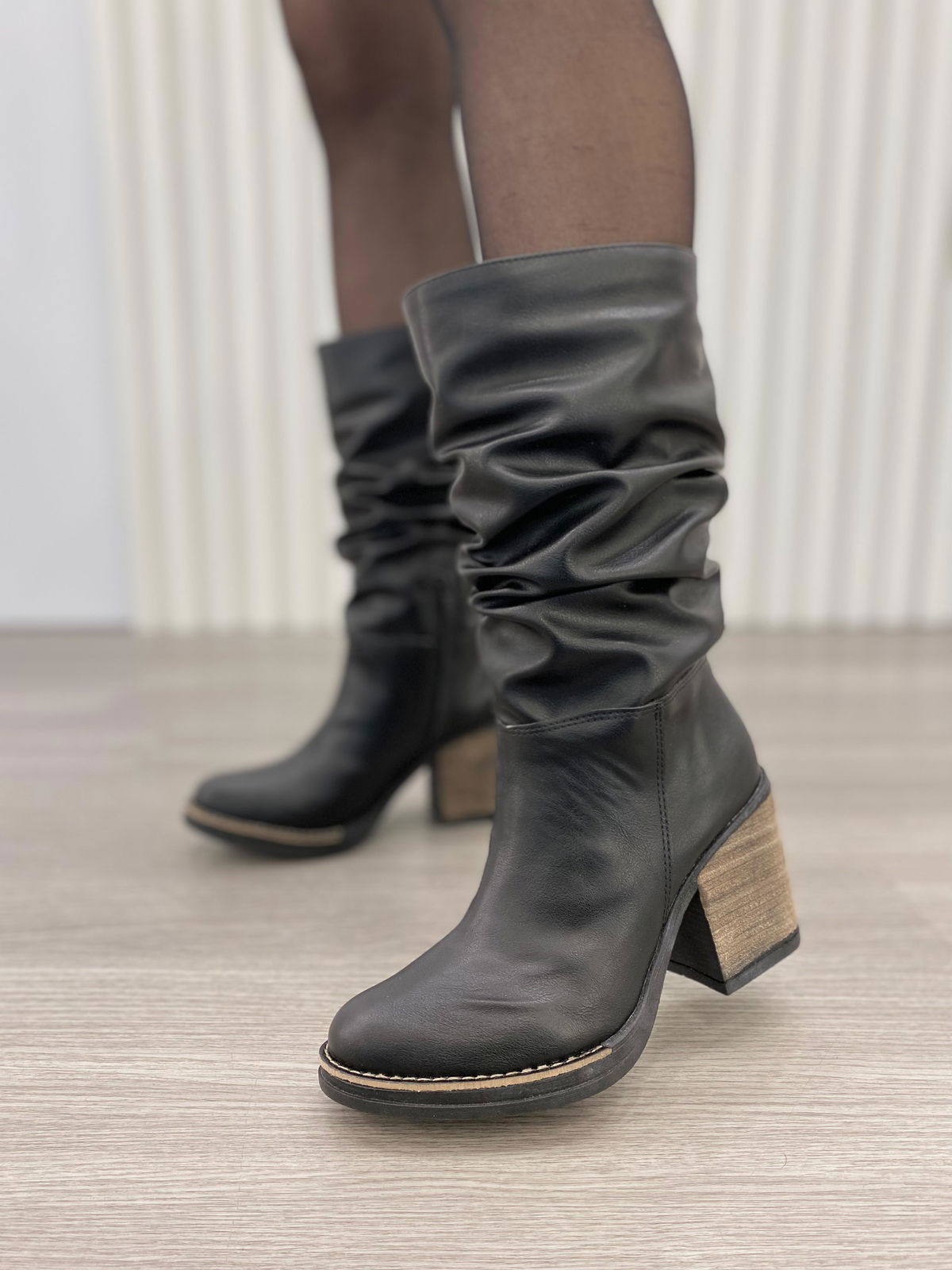Botas de ecocuero con detalle de caña arrugada y medio cierre interno.