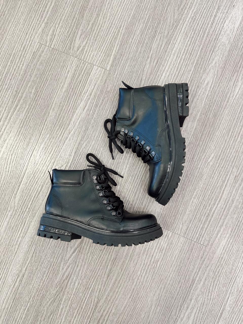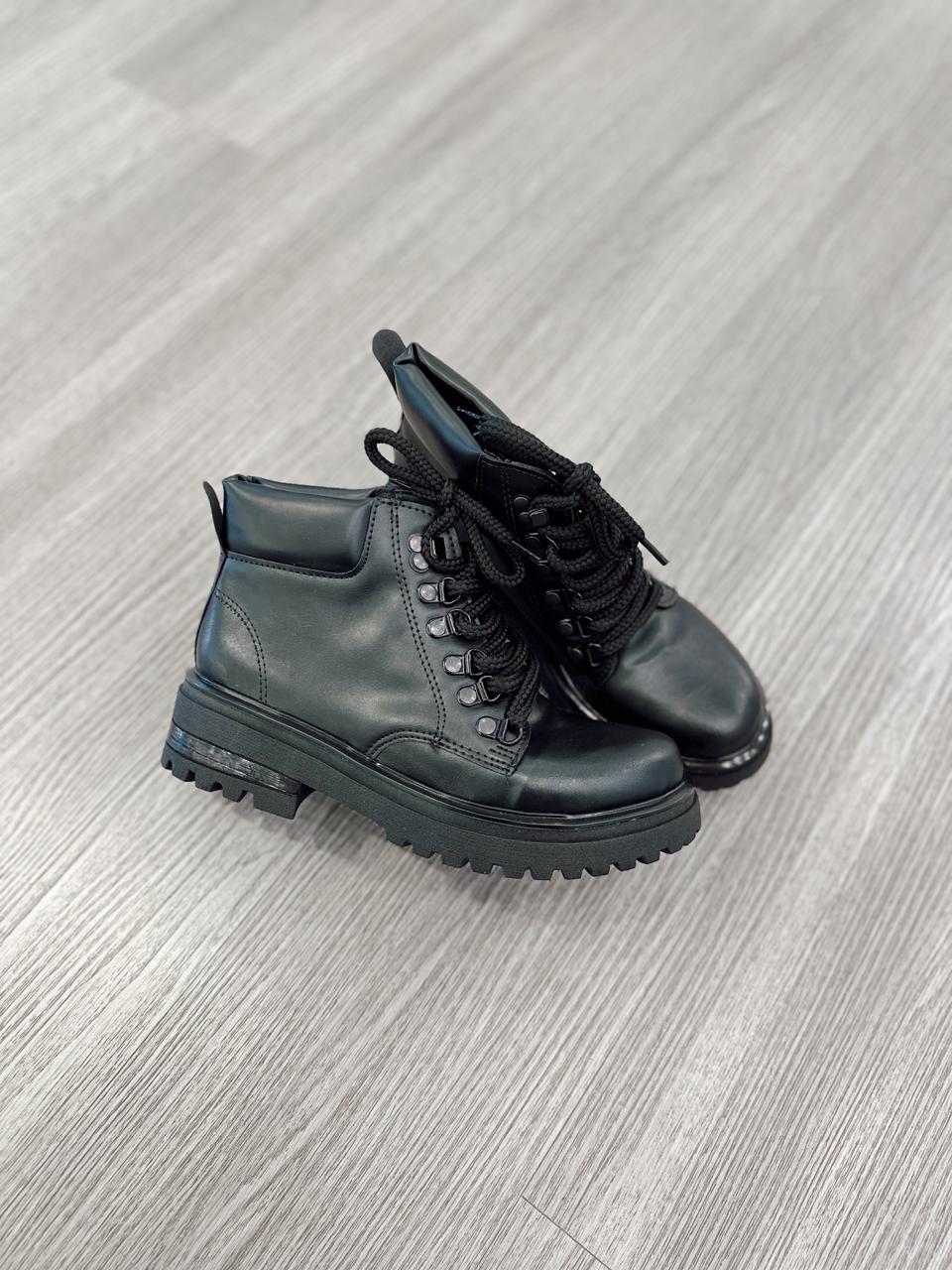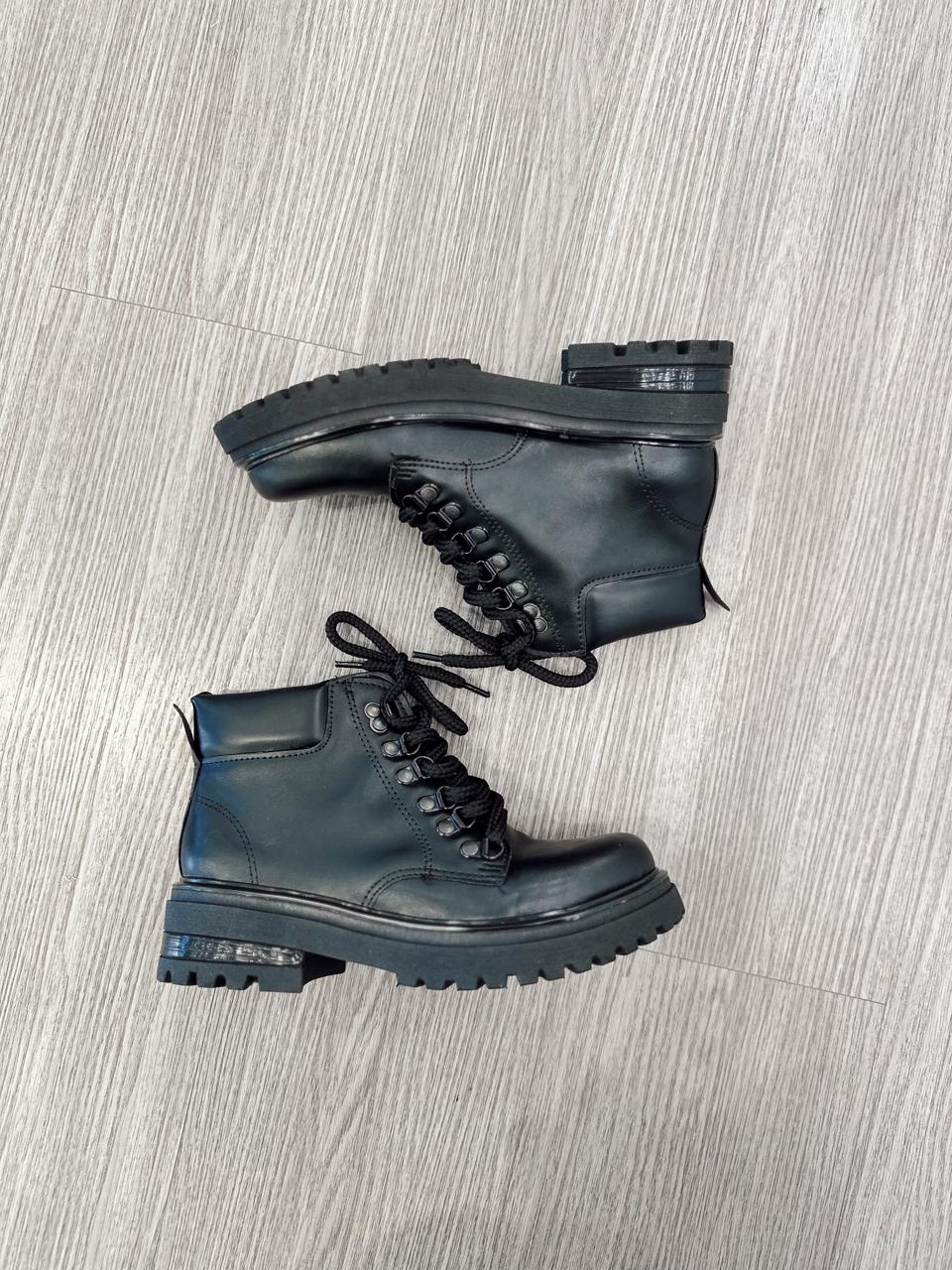 Borcego de ecocuero con pasadores metálicos.