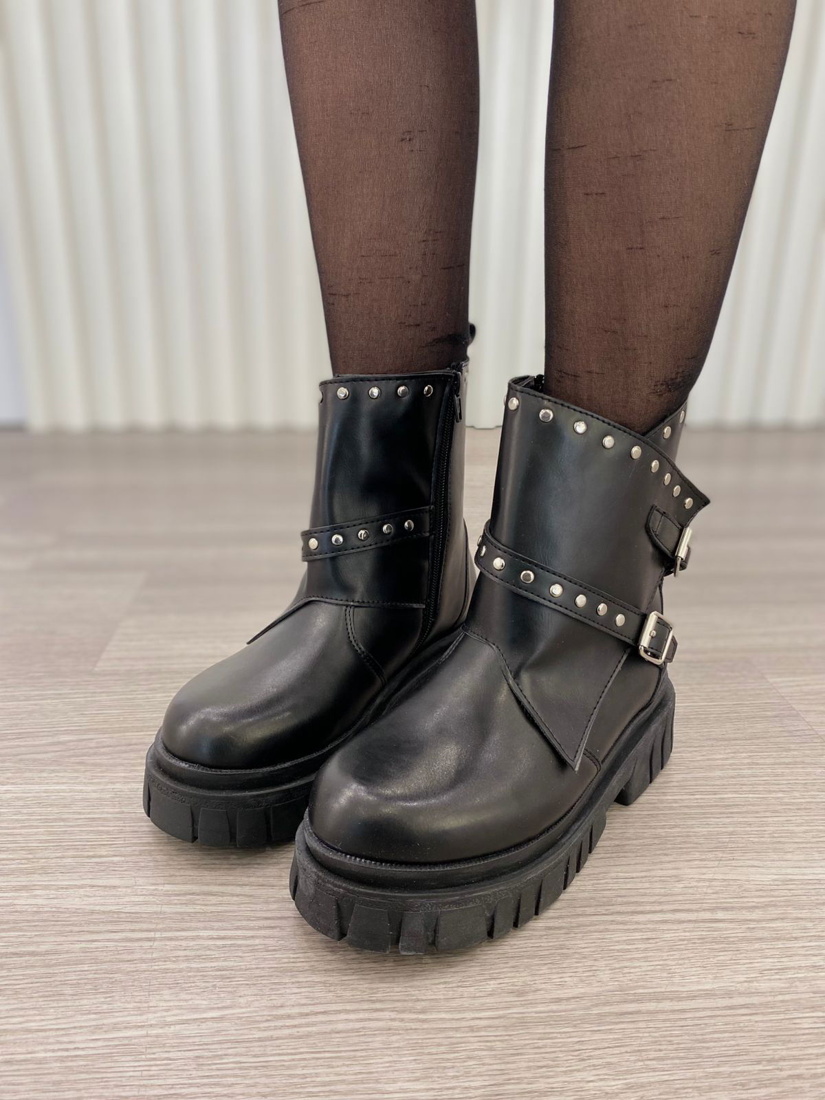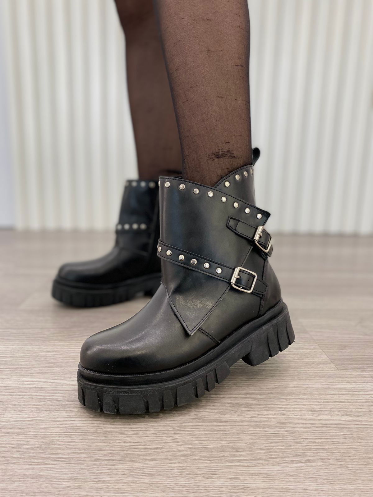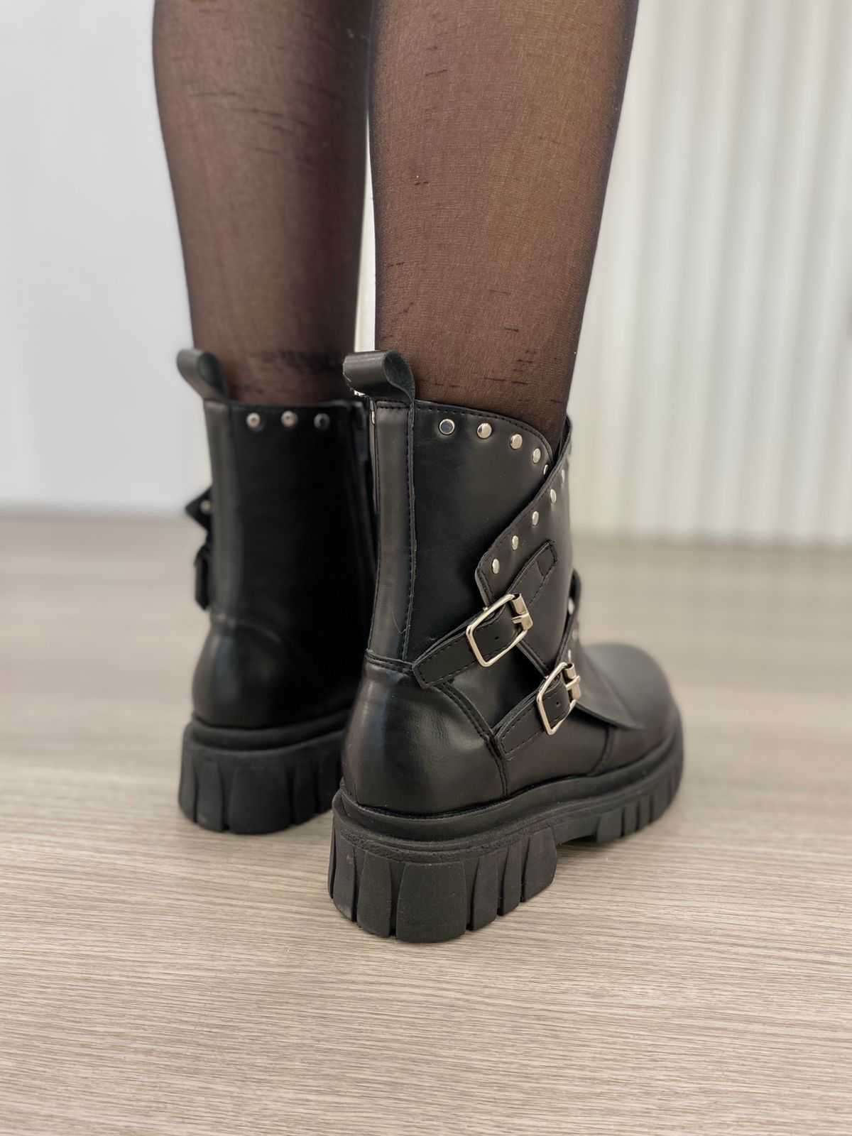 Borcegos sin cordones con detalle de solapa, cintos y tachas.