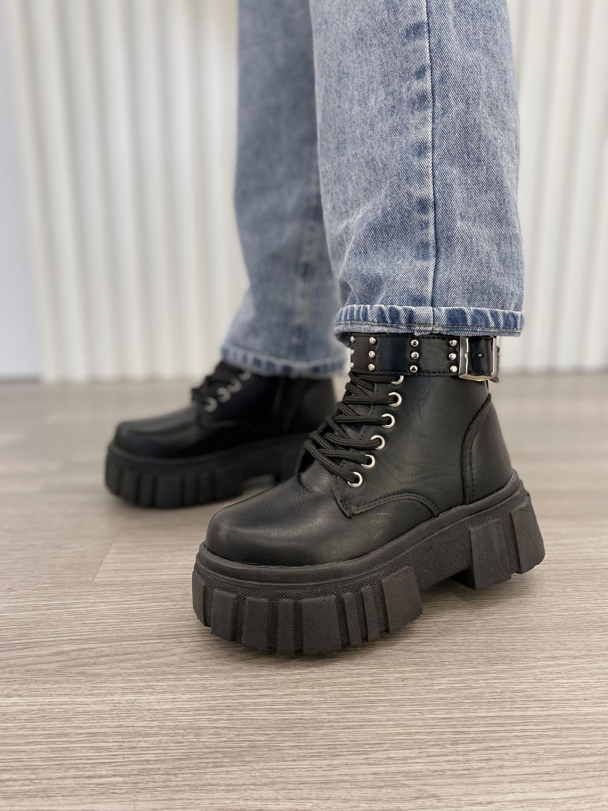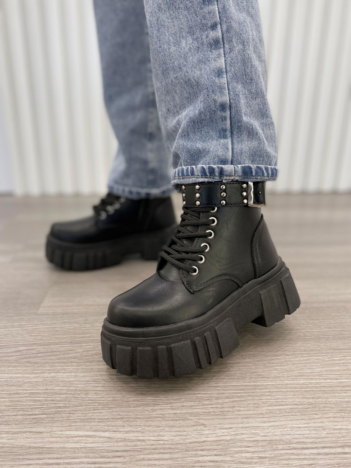 Borcego de ecocuero con cierre lateral interno y cinto de tachas (no desmontable).