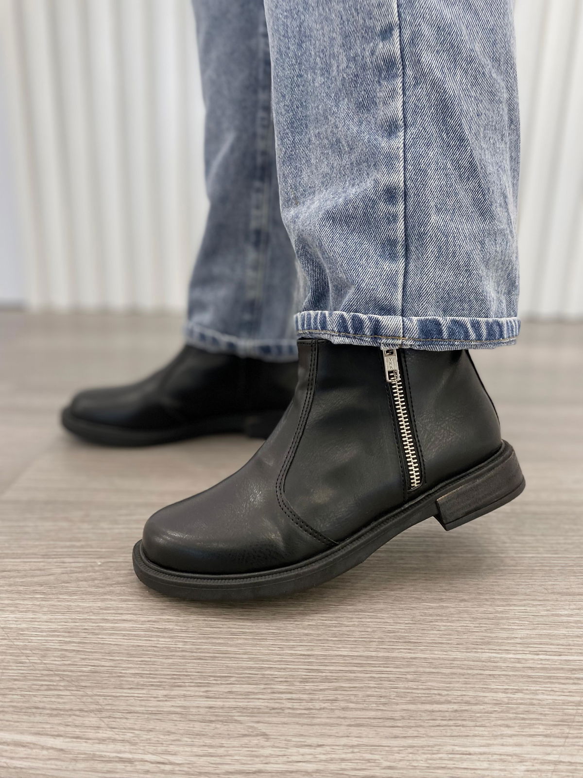 Bota/borcego corta con punta redonda y cierre en costado externo.