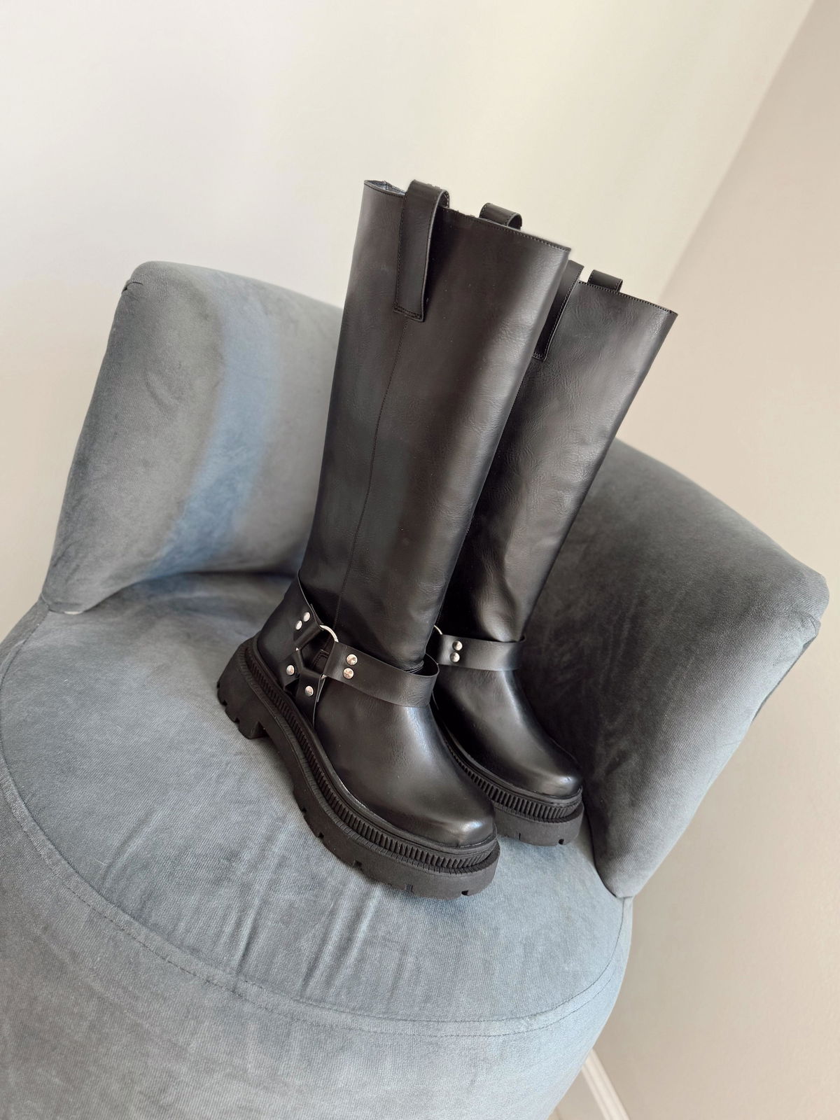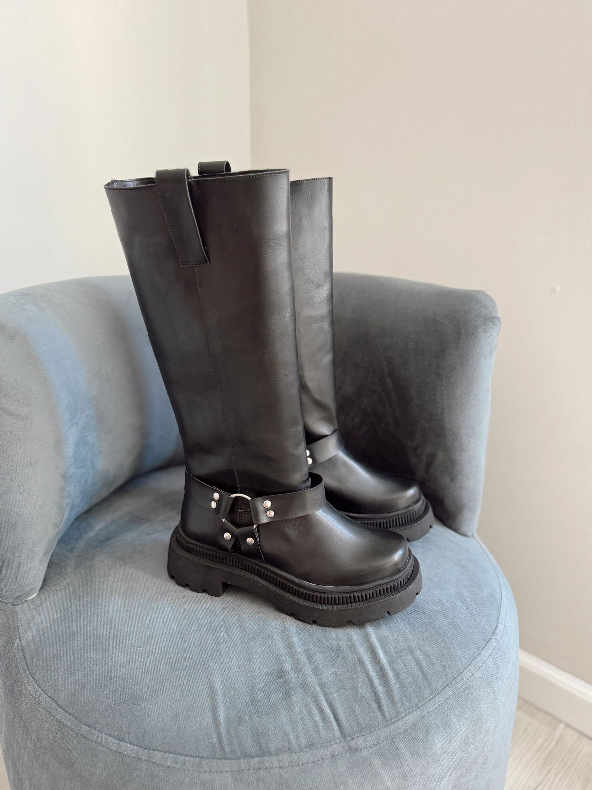Borcego/bota de ecocuero slip-ons con detalle de tiras y aro de metal (no se saca).