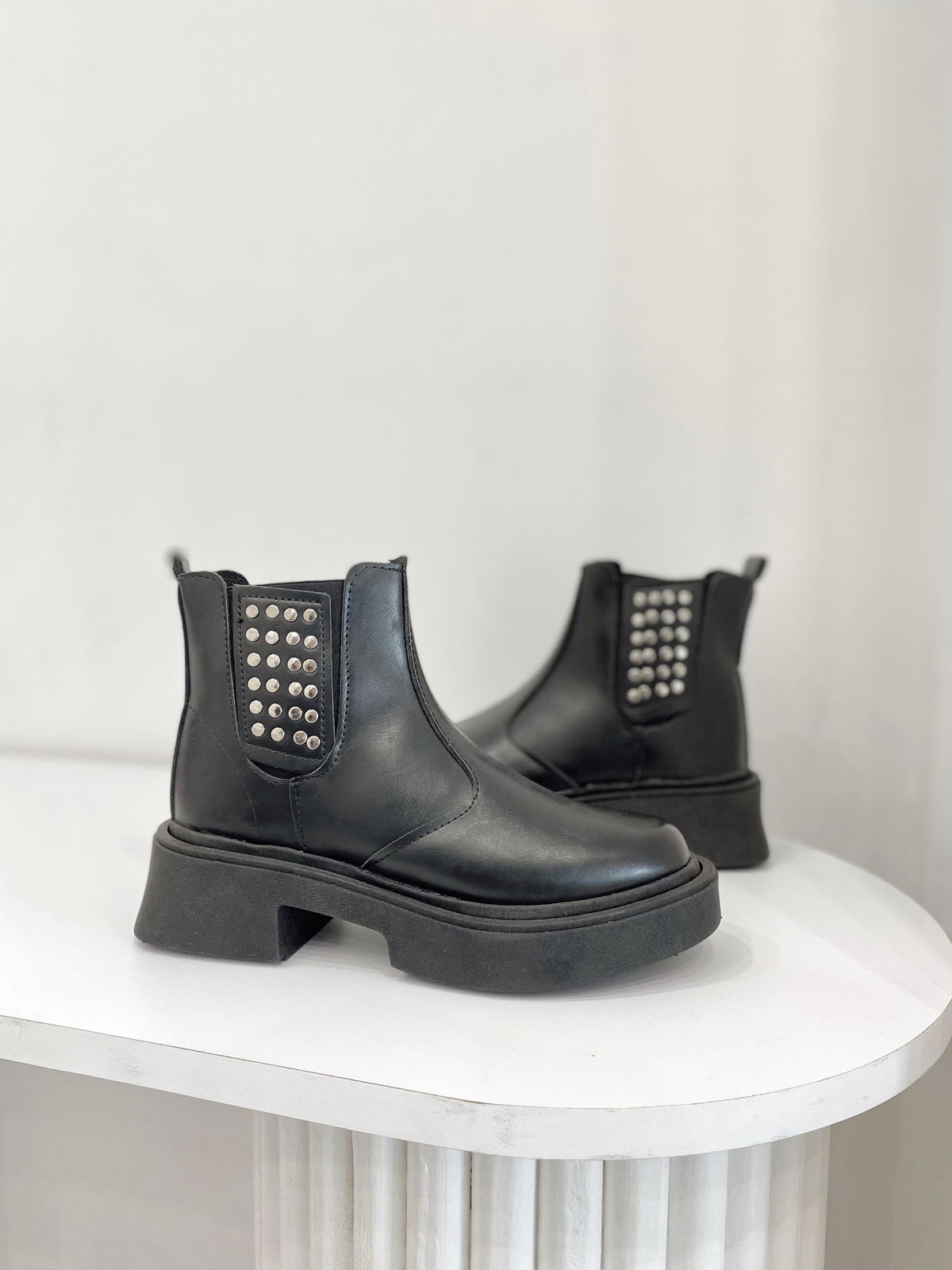 Botas con punta redondeada, tiene elástico a los costados y tachas.