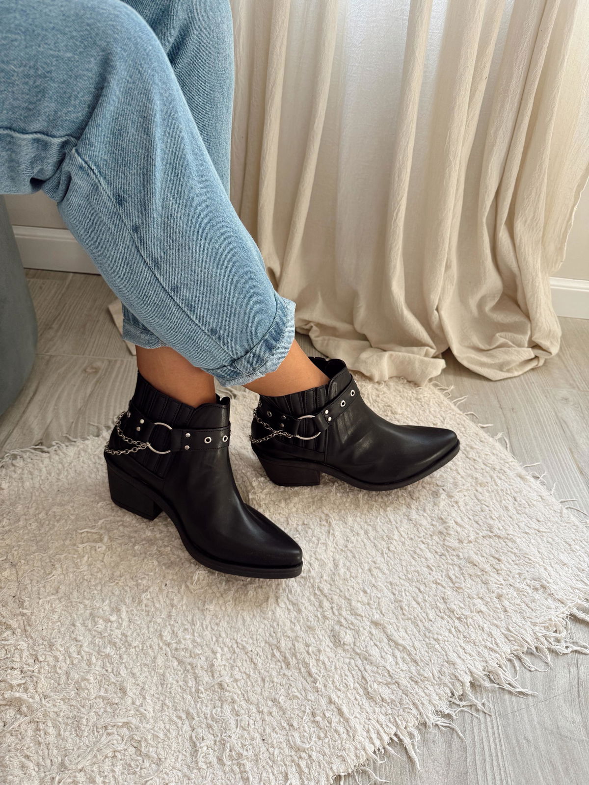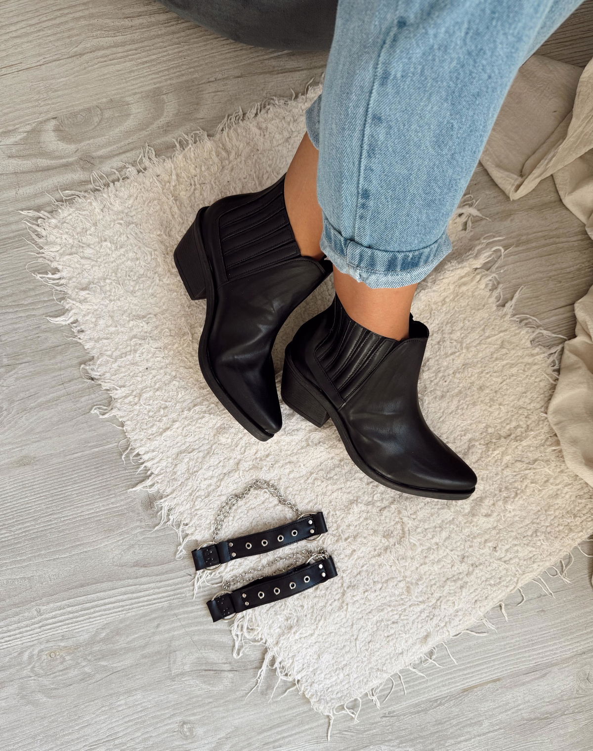 Bota de eco cuero con elástico en costados y tira desmontable con tachas y cadenas.