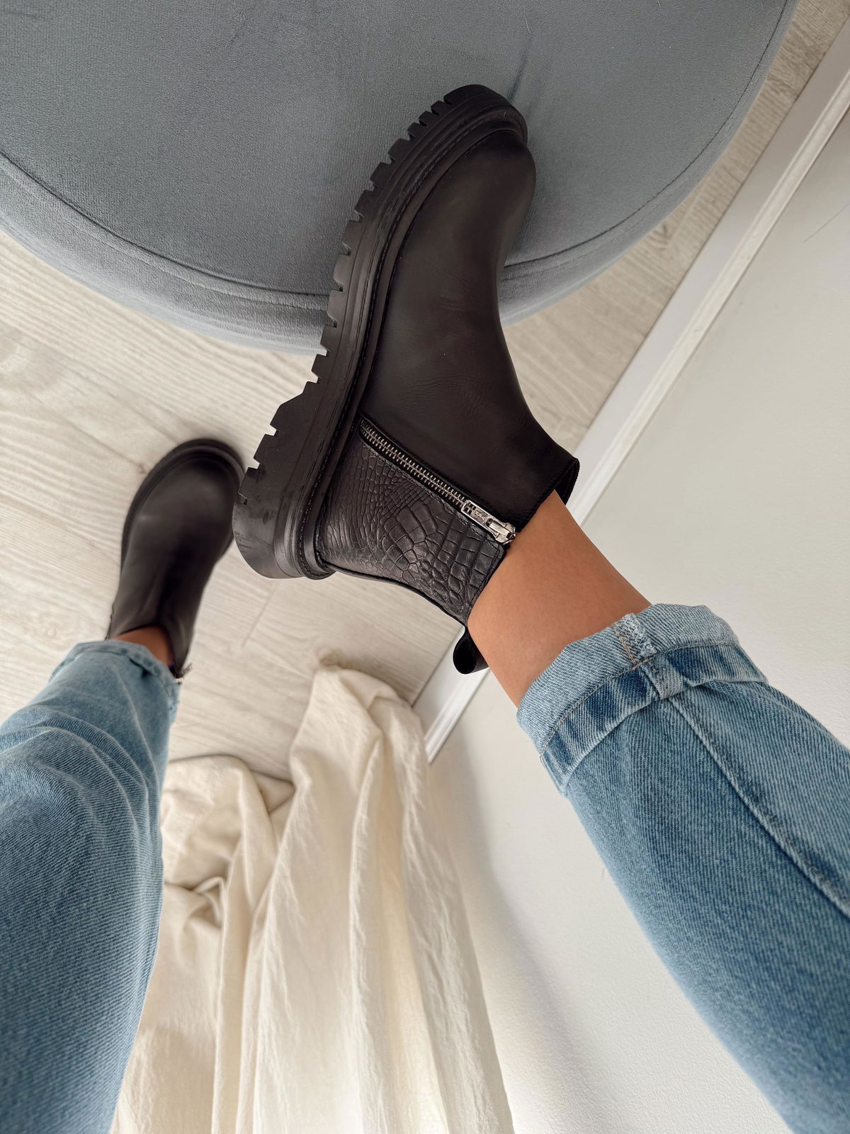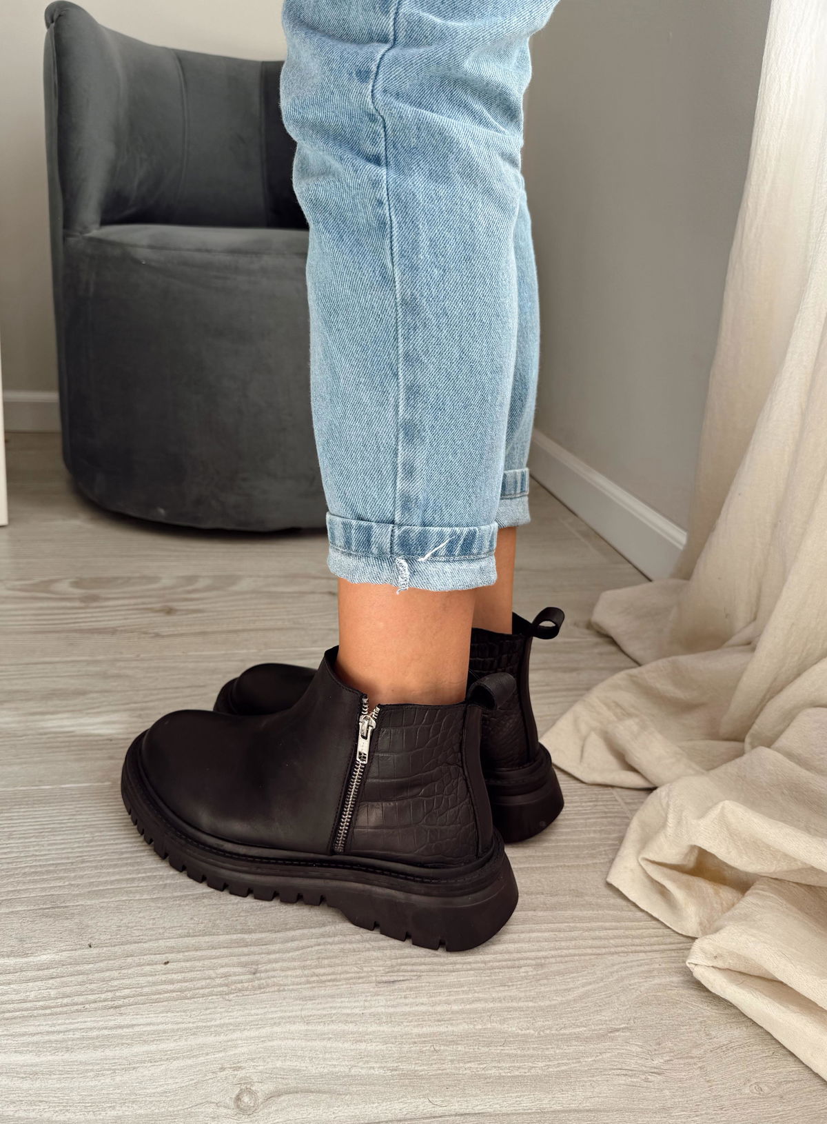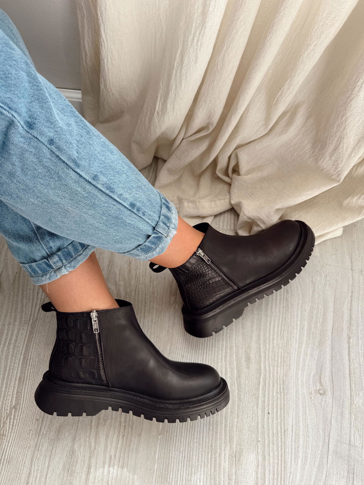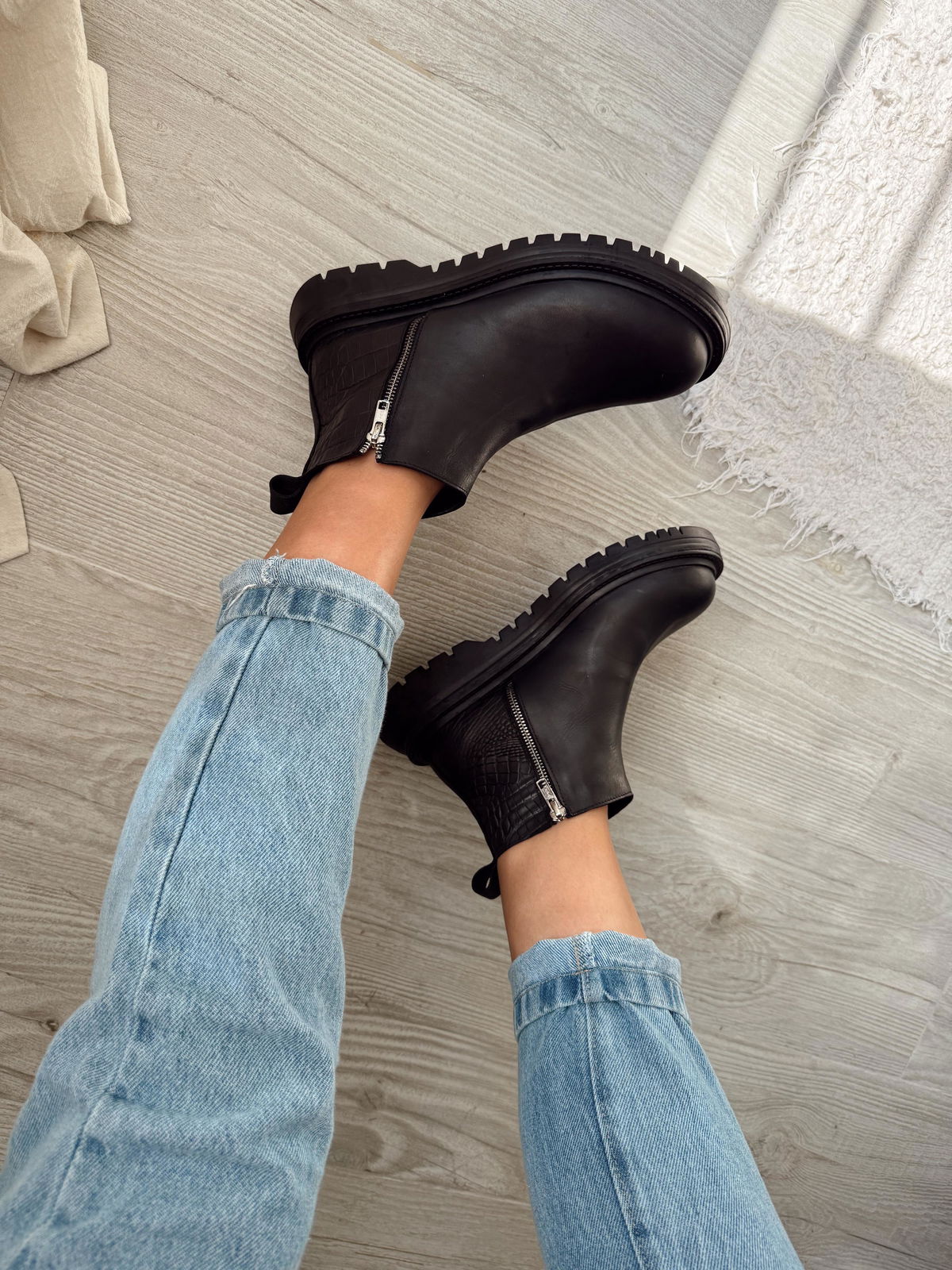 Botitas de cuero con detalle en crocco, base de goma y cierres de ambos costados.