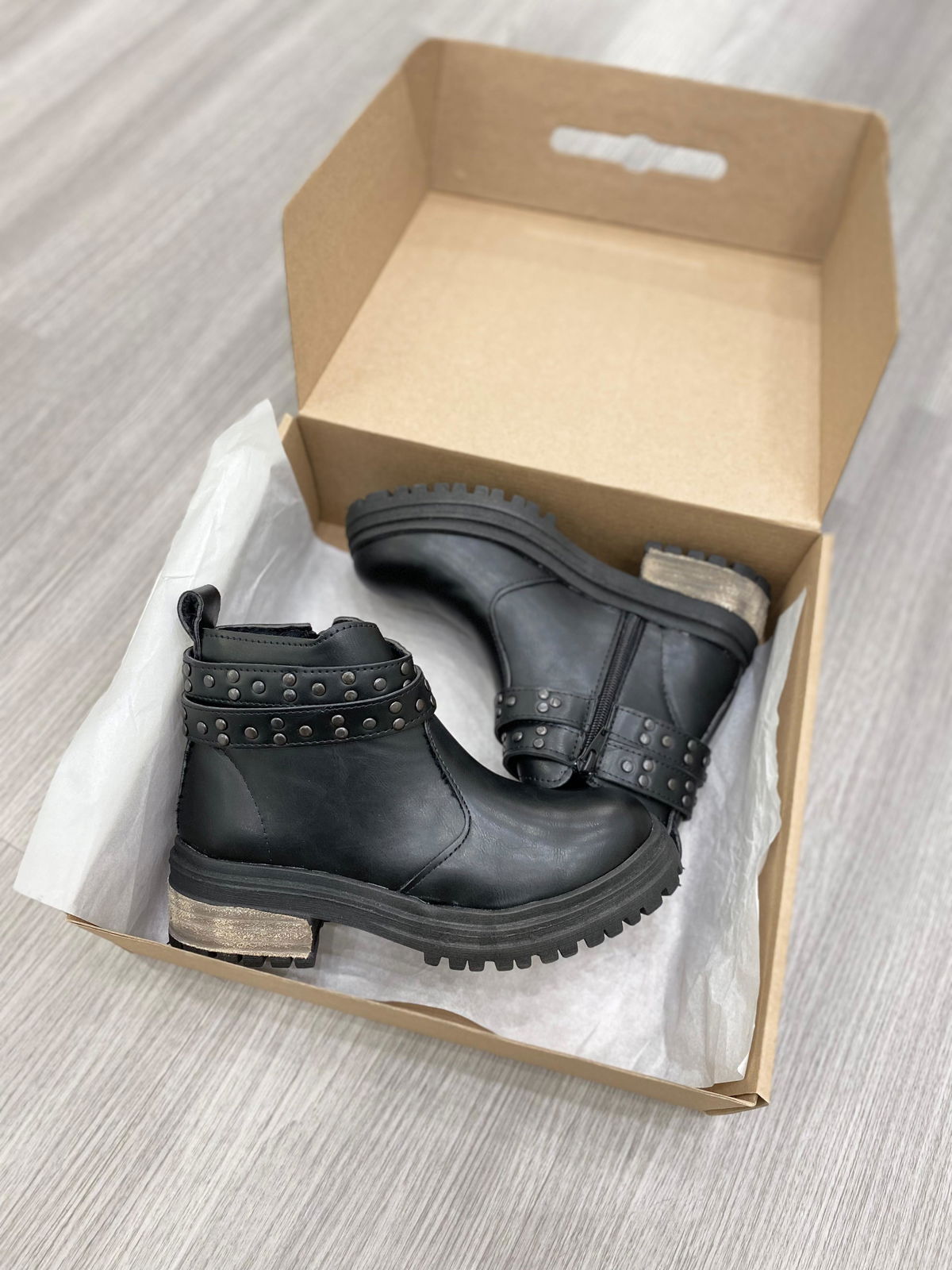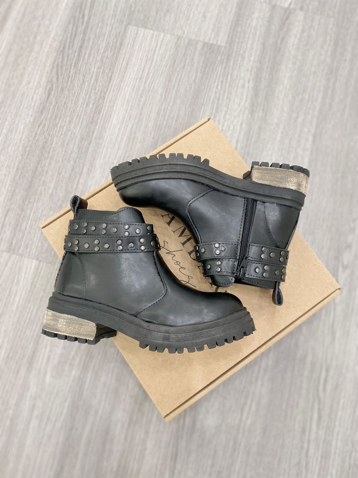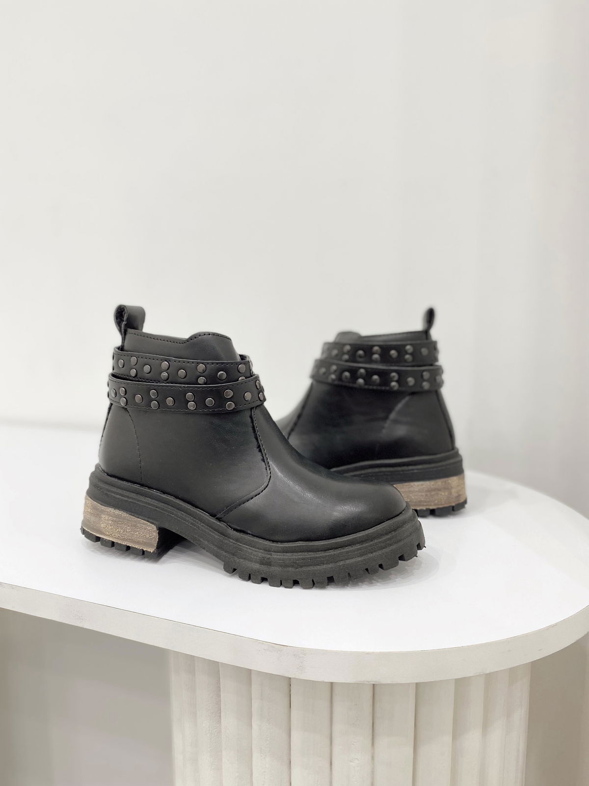 Botas de eco cuero con doble tira de tachas, base de goma y cierre en costado interno.
