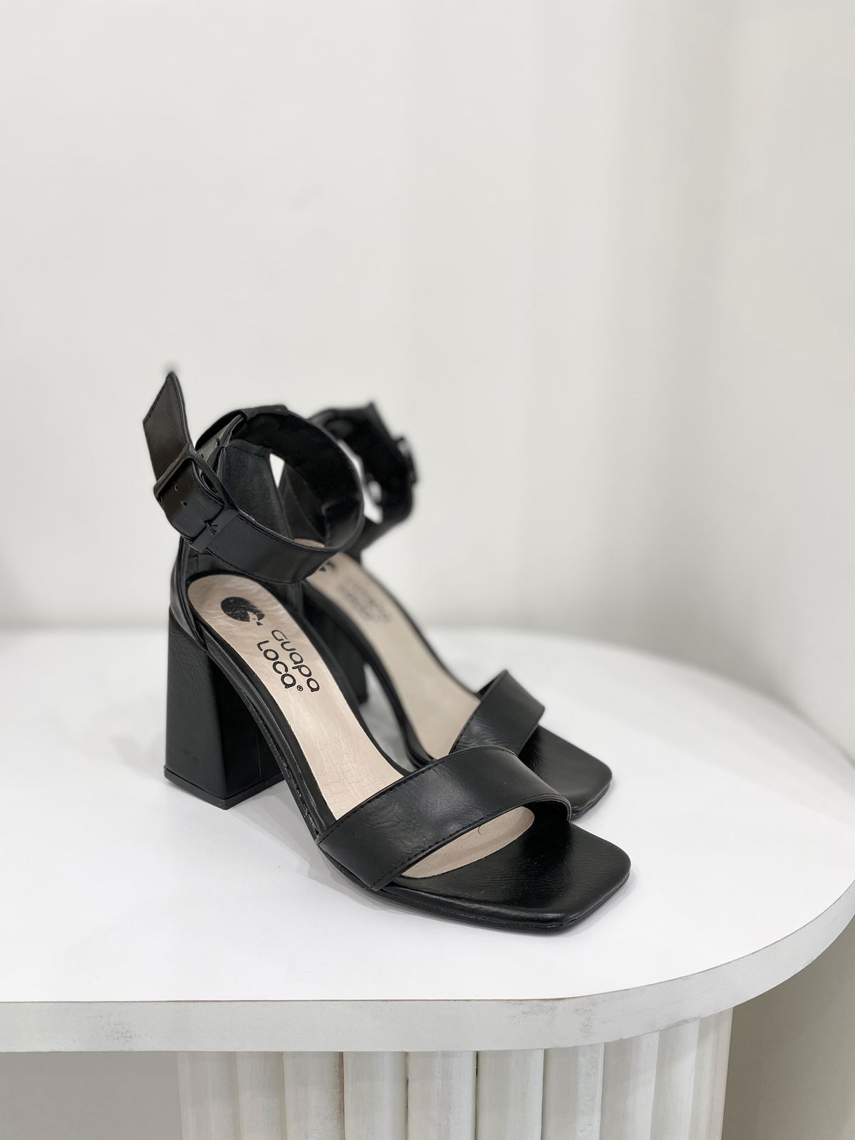 Sandalias de eco cuero con punta y taco cuadrado.