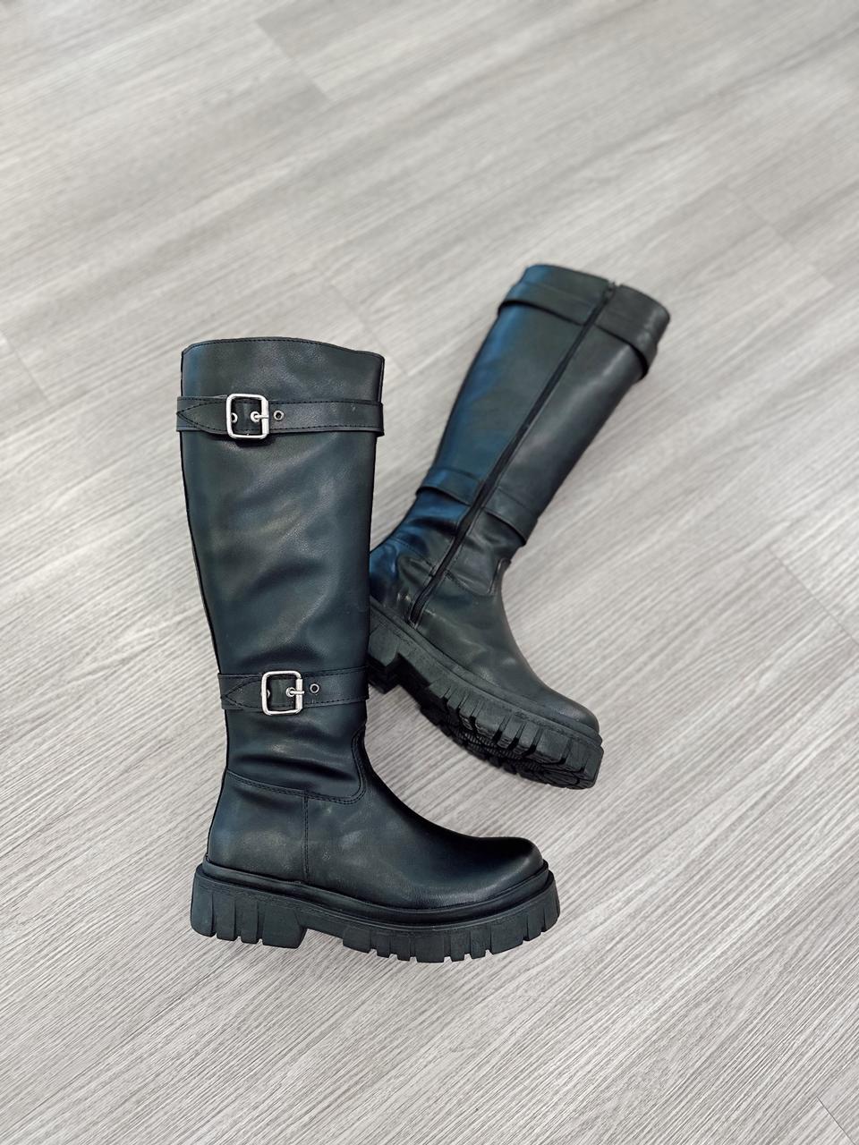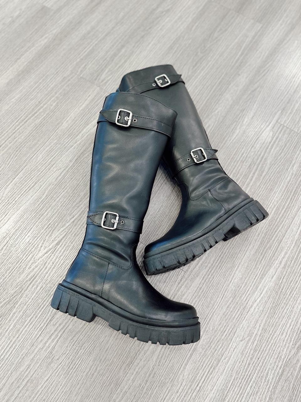 Bota de eco cuero con doble cinto y cierre en largo total.