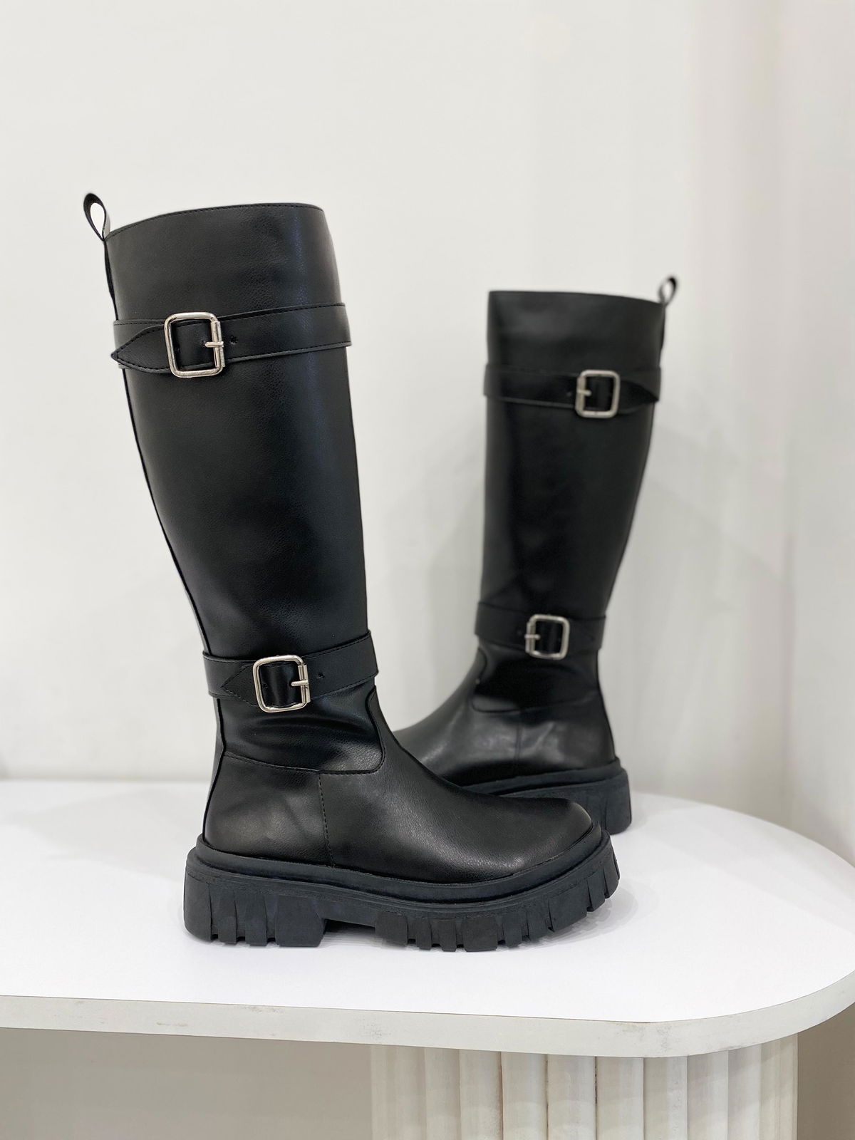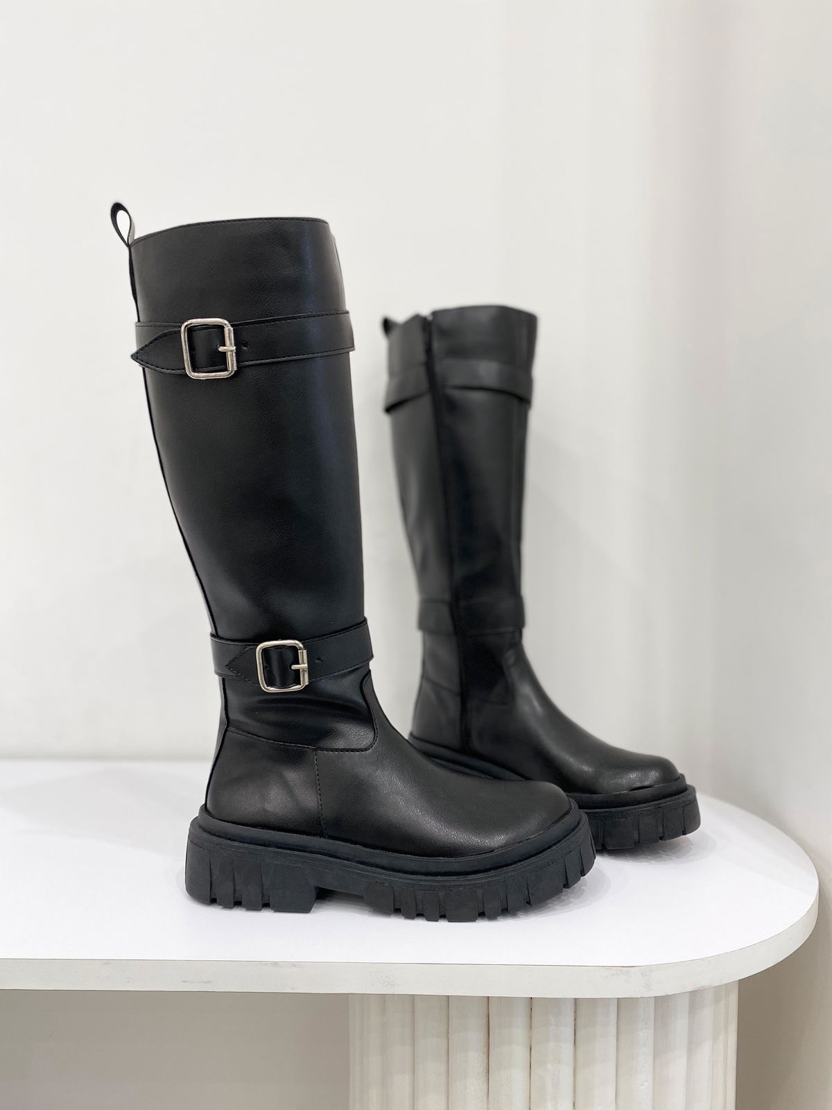 Bota de eco cuero con doble cinto y cierre en largo total.