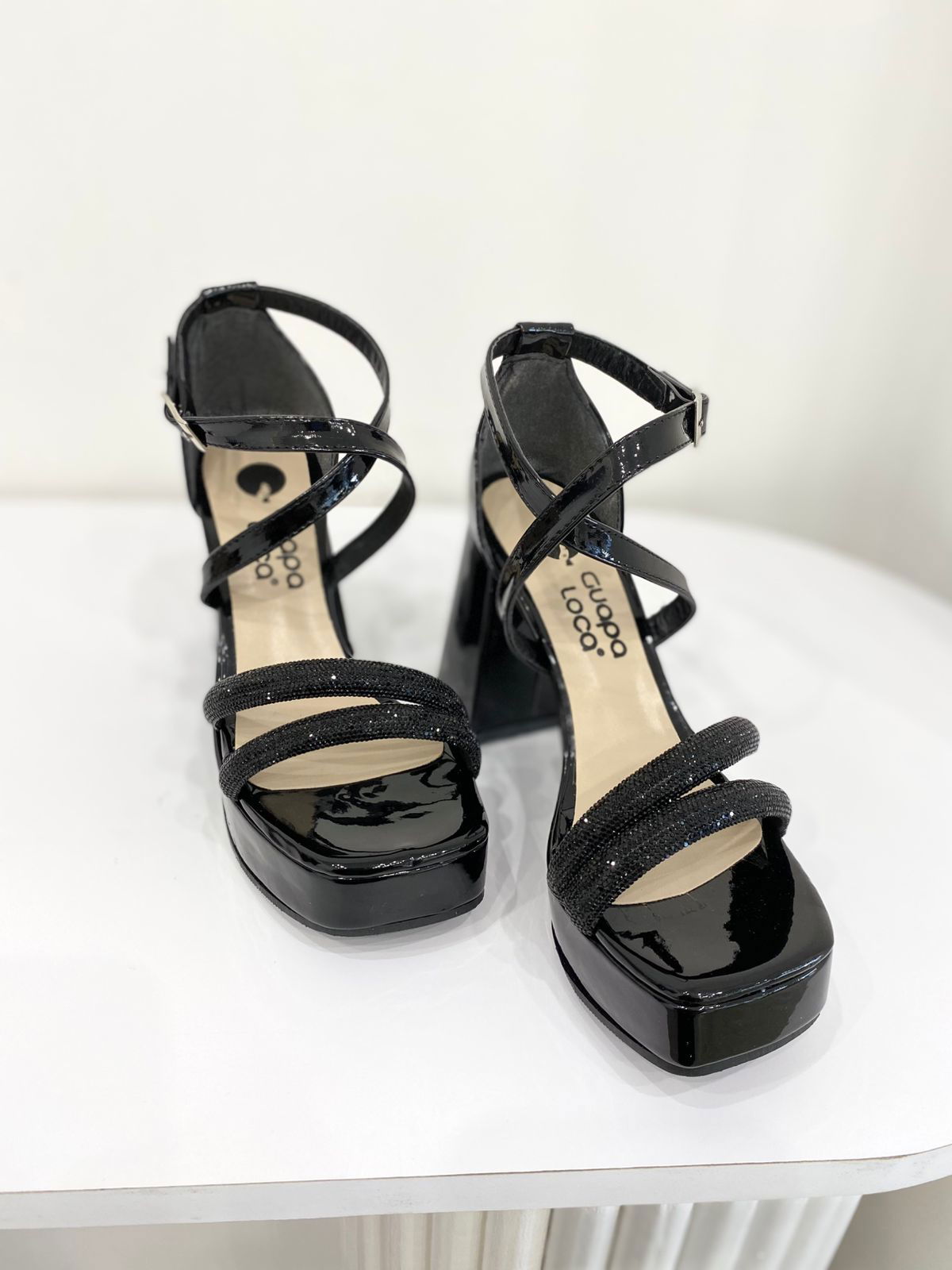 Sandalias con tiras de strass, talonera y tira cruzada en el empeine.