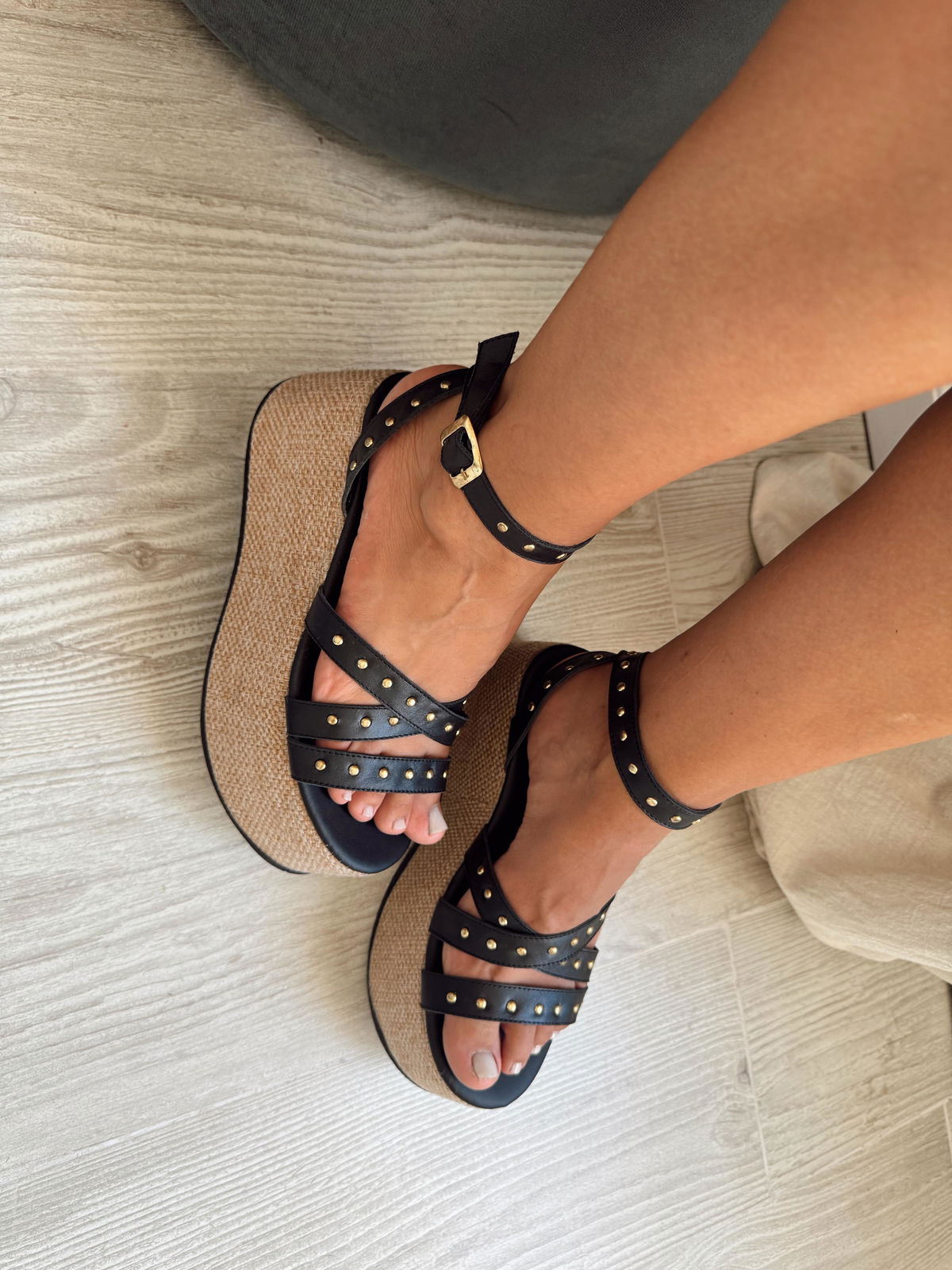Sandalia de eco cuero con base de goma forrada y tiras de tachas.