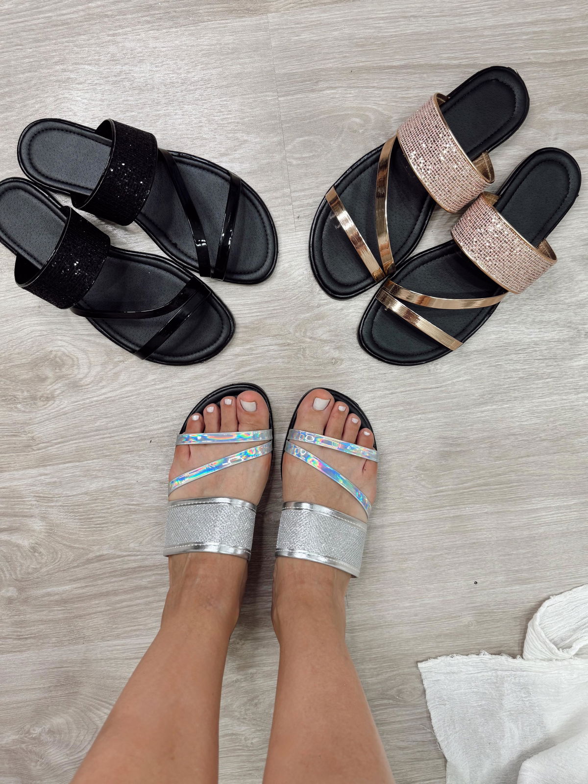 Chinela con tiras de brillos.