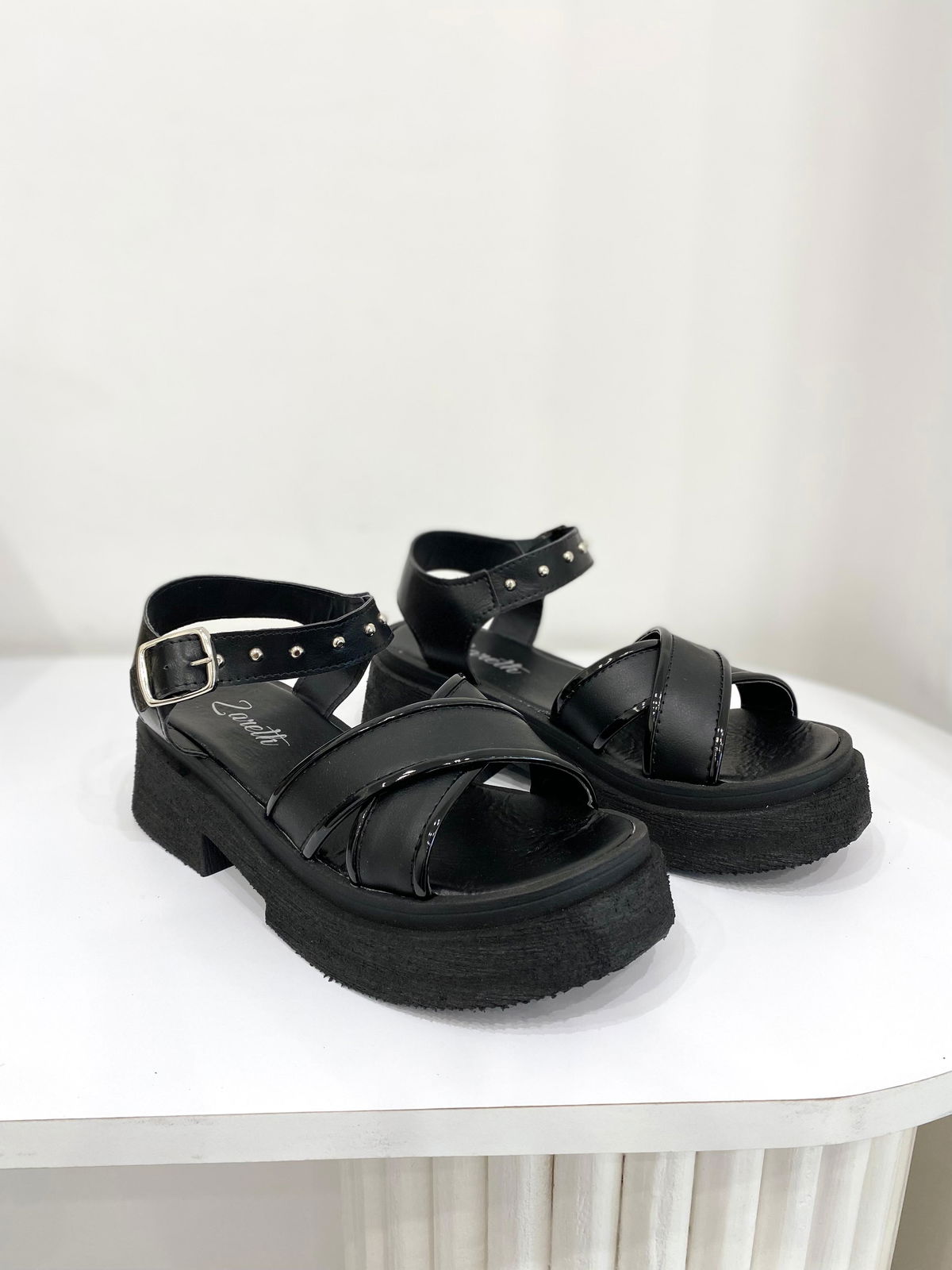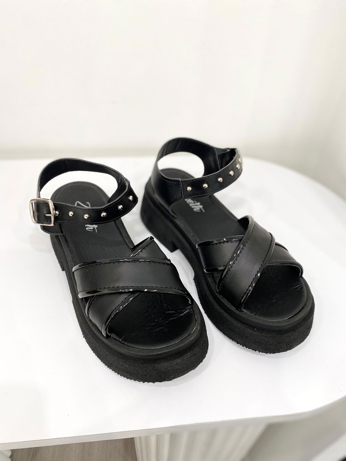 Sandalia con tiras gruesas cruzadas combinadas con charol.
