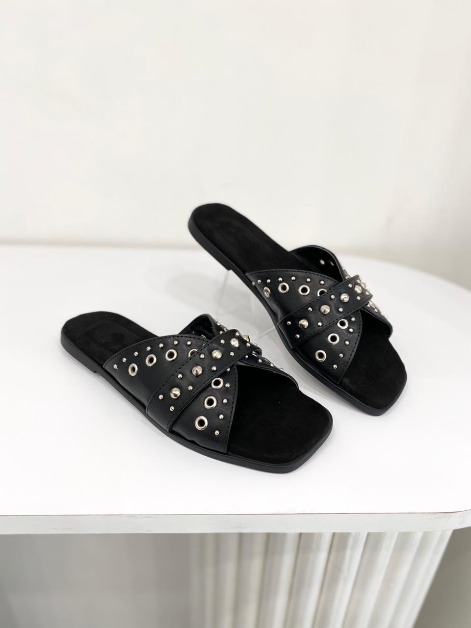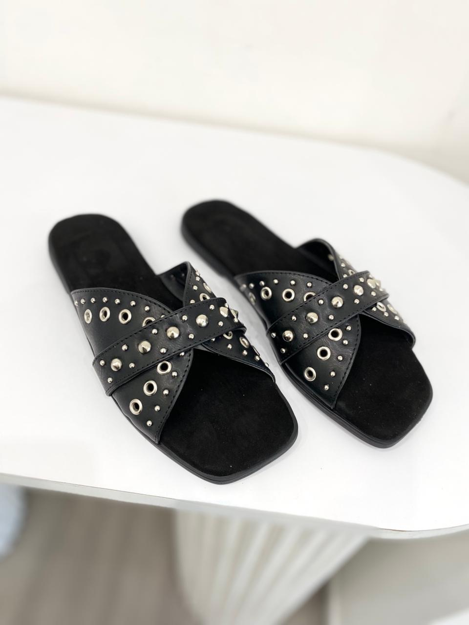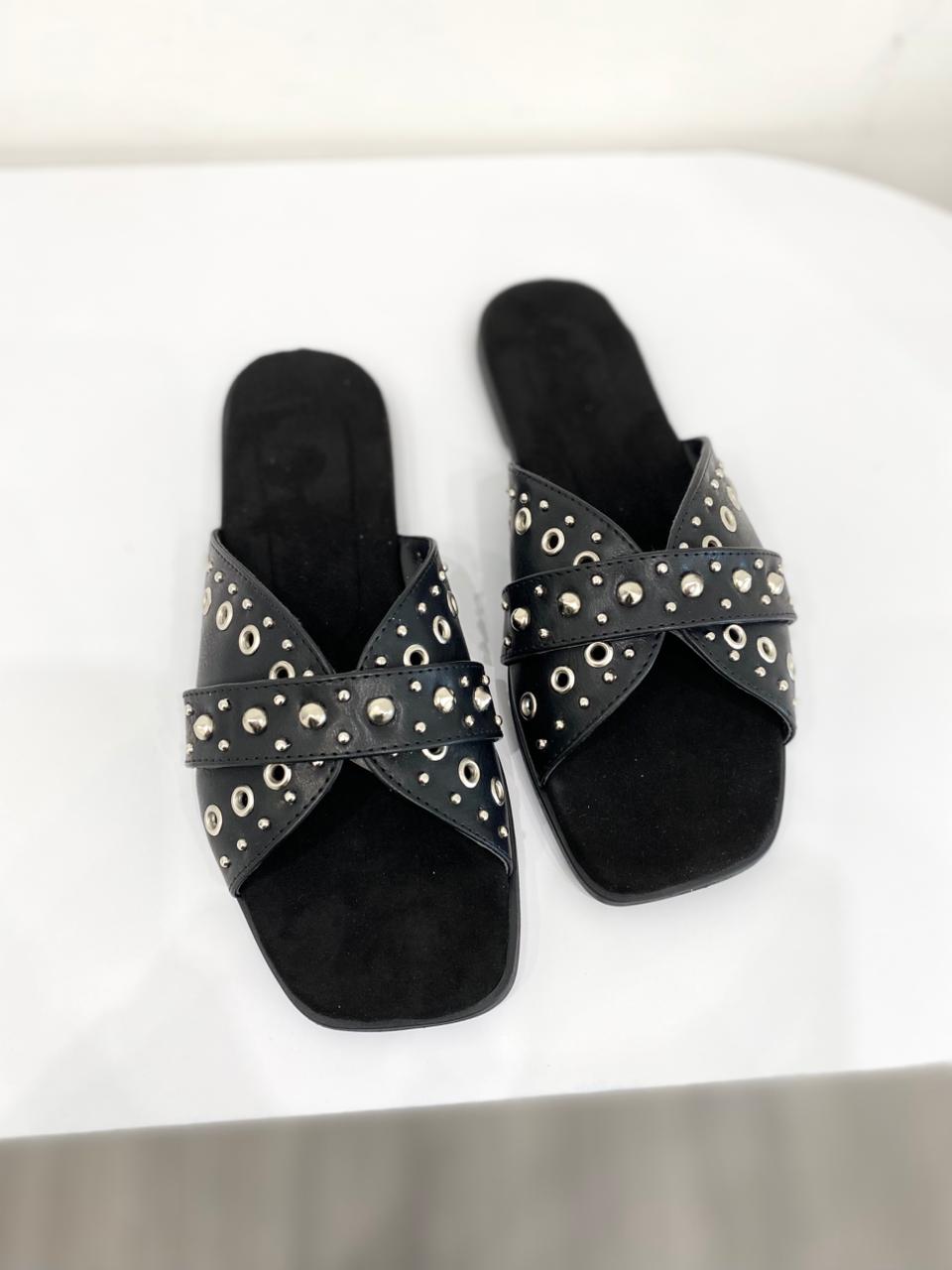 Chinela de eco cuero con detalles de tachas y base de goma con mini taquito