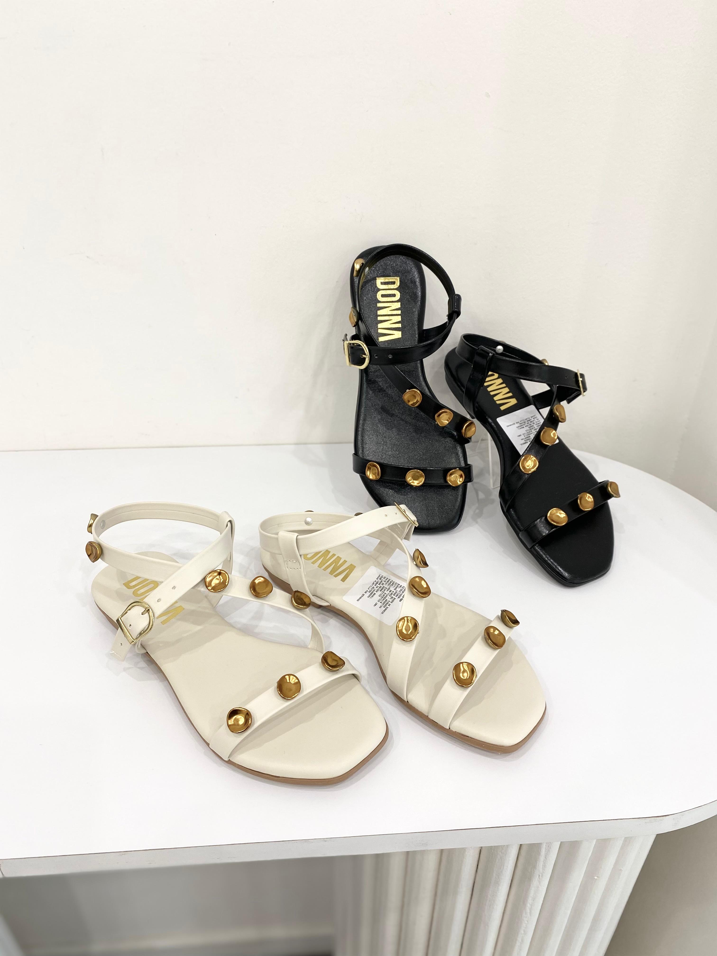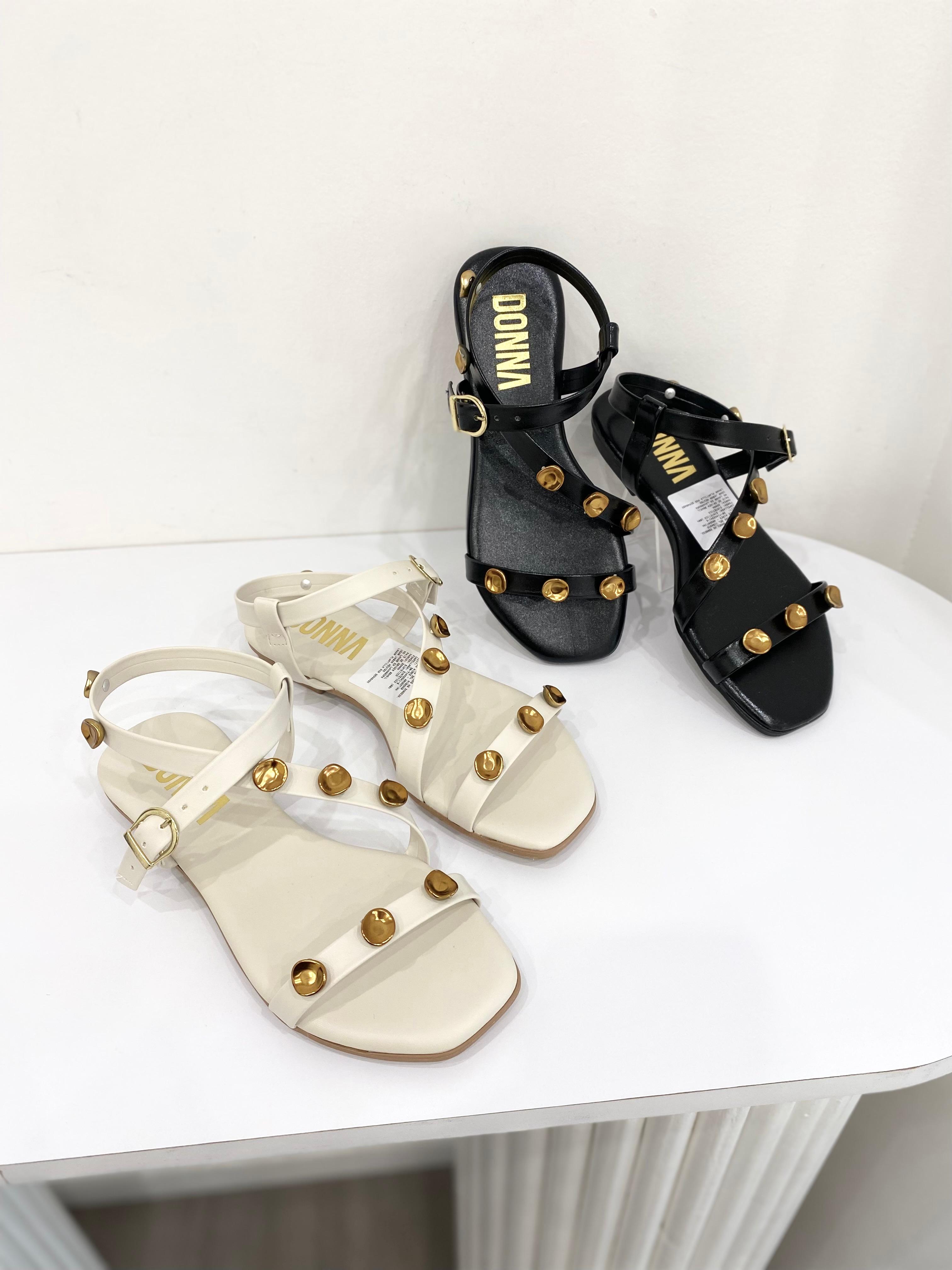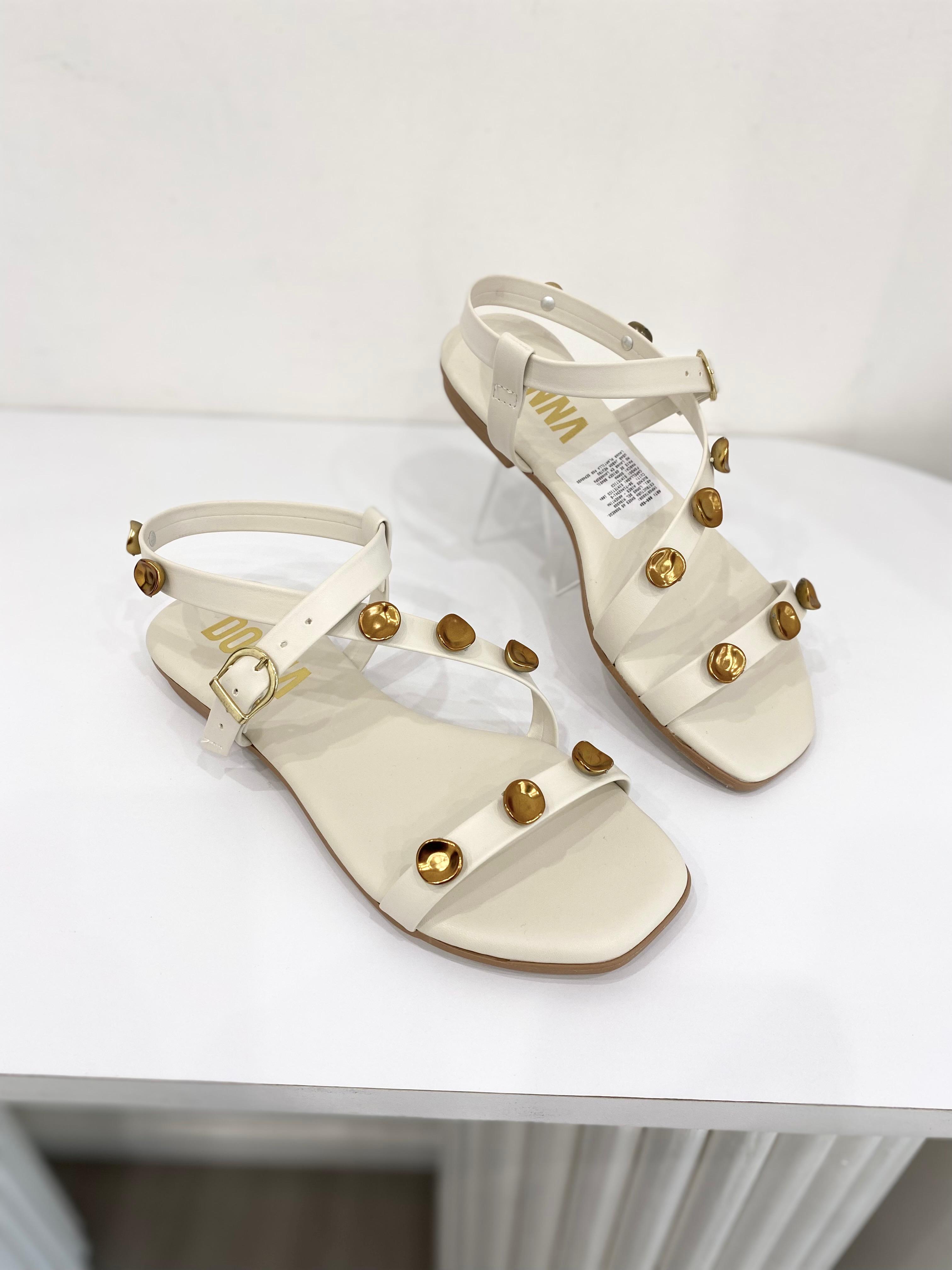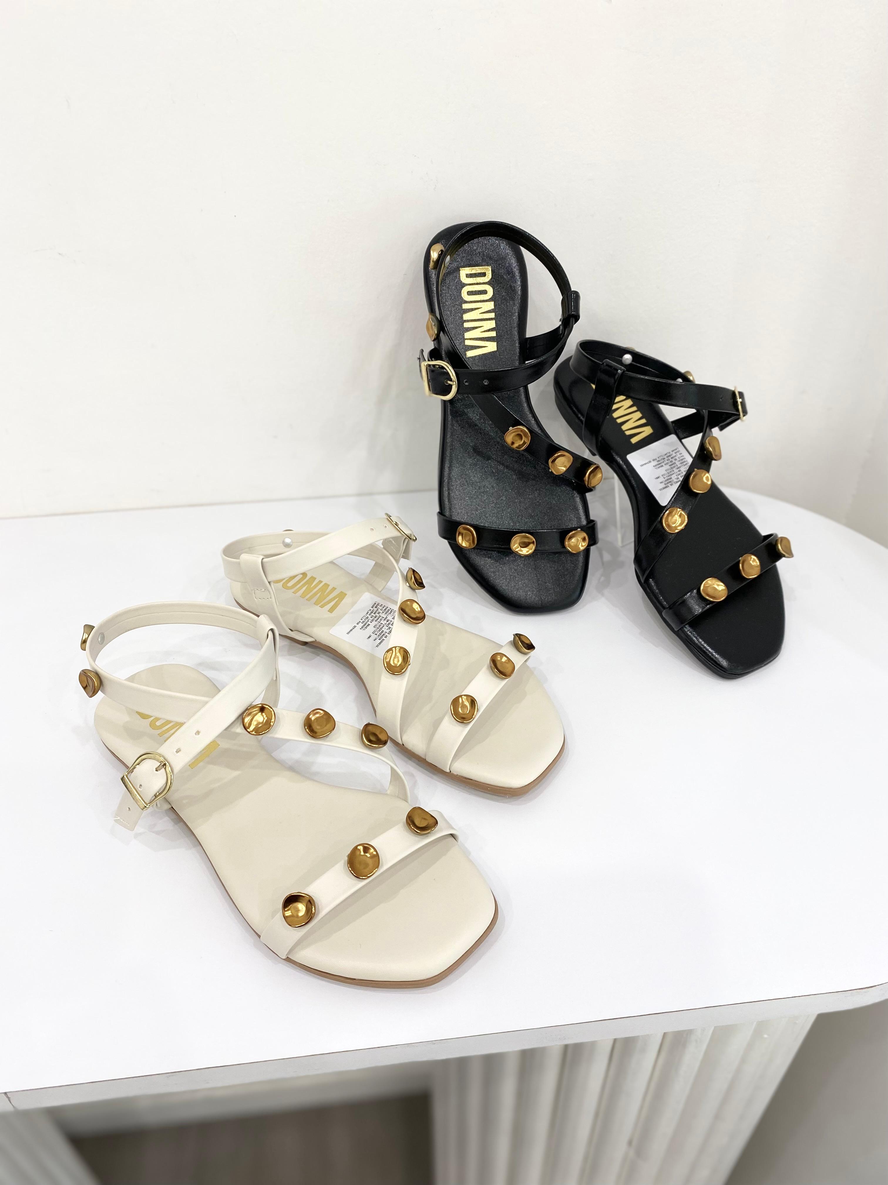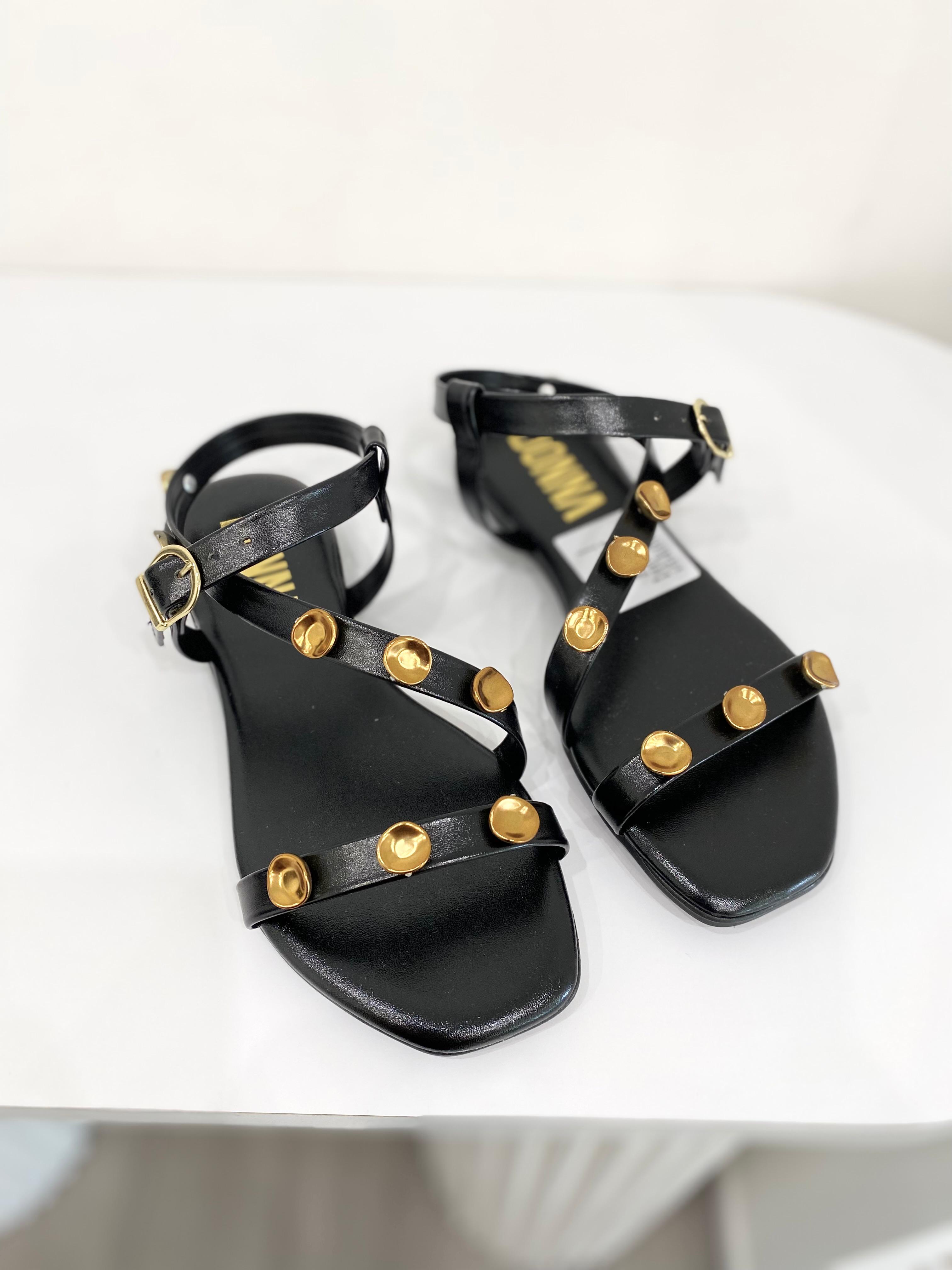 Sandalia importada con apliques dorados en tiras finas, plantilla acolchonada y mini taco y punta cuadrada.