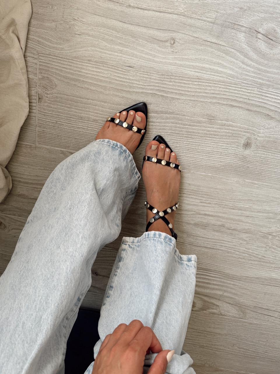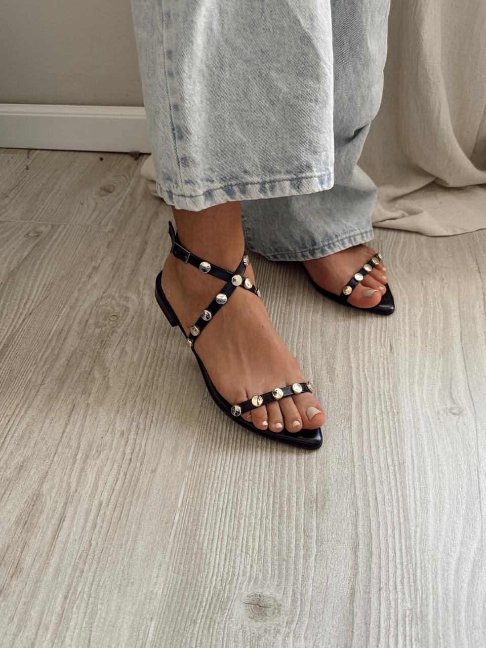 Sandalias importadas con apliques dorados, terminación en punta y taco cuadrado. La base es de goma y la plantilla es acolchonada.