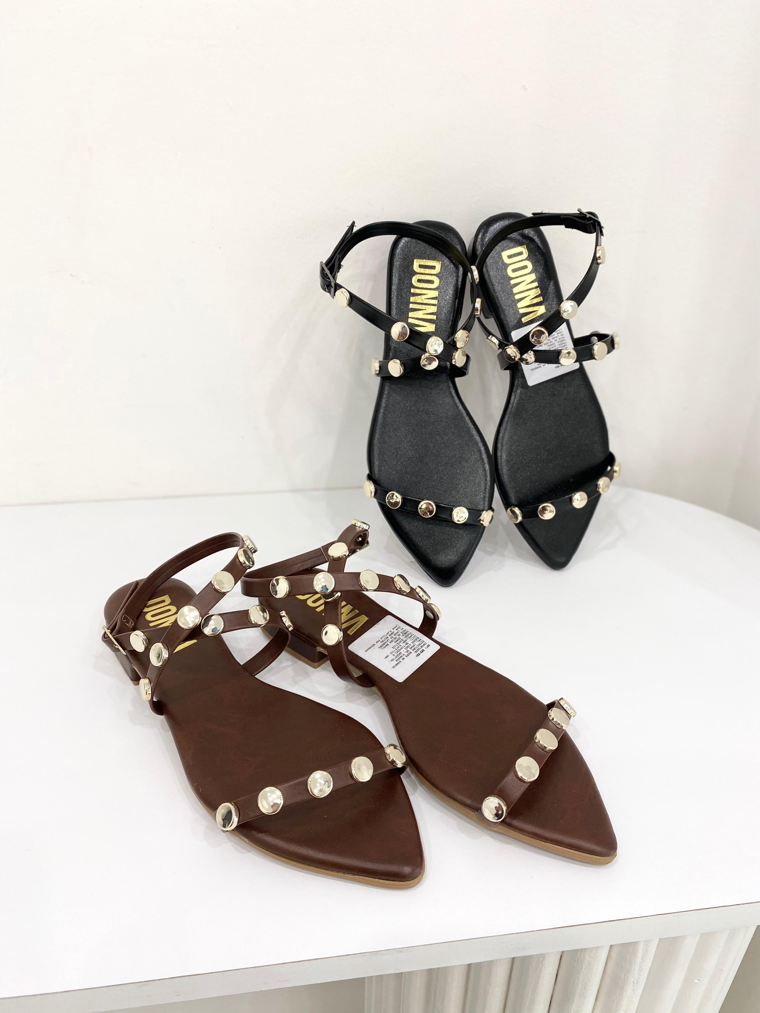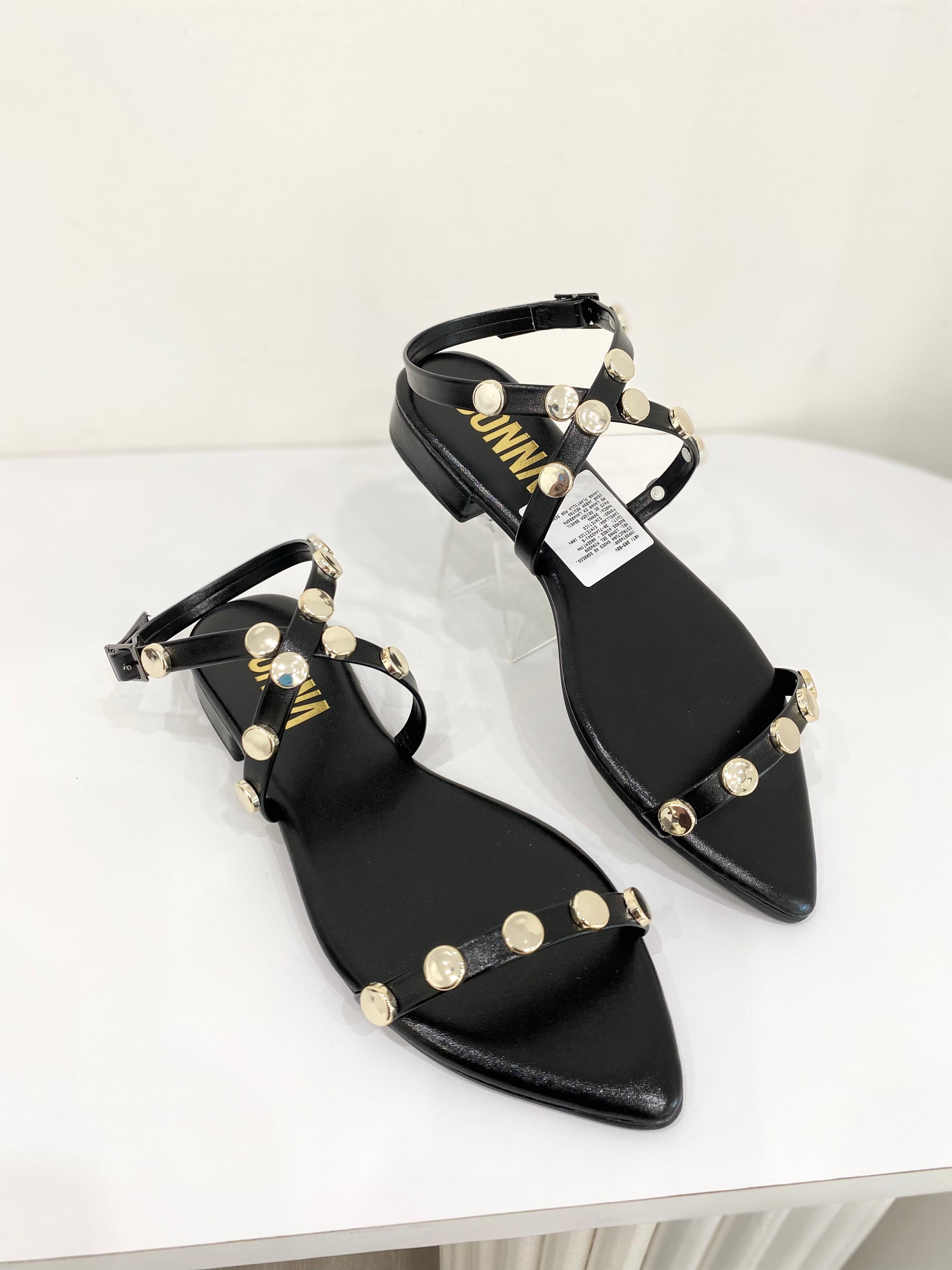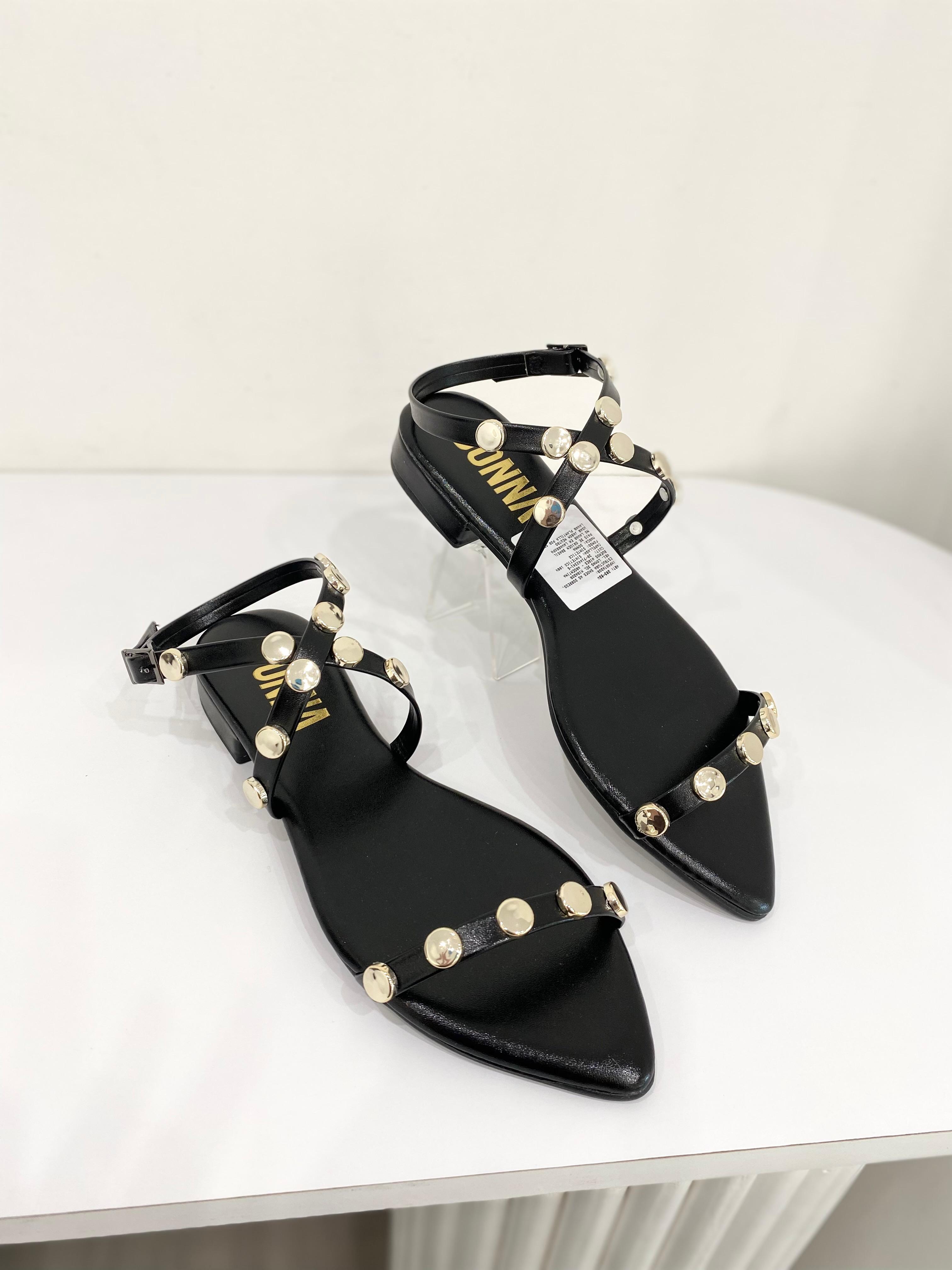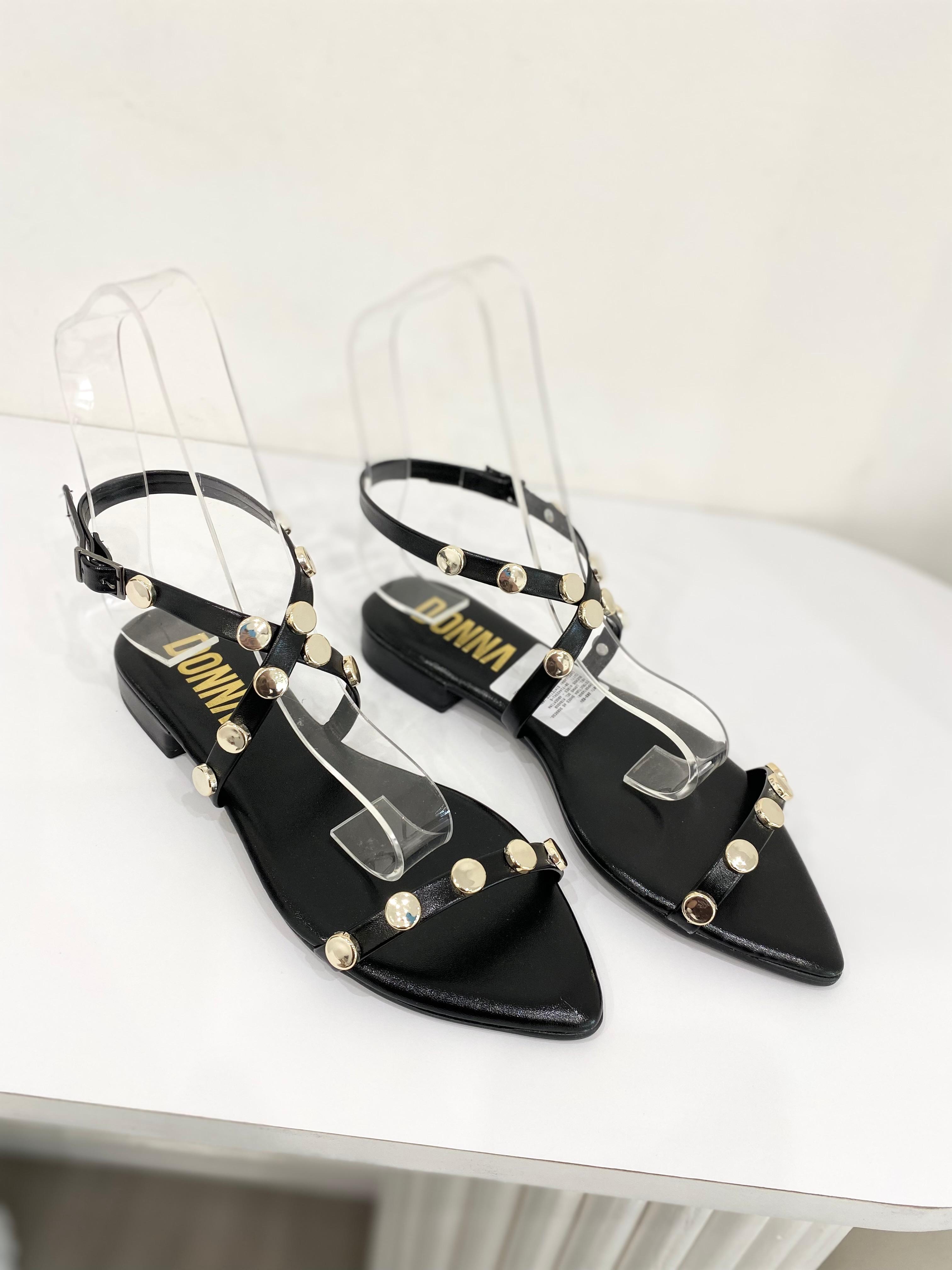 Sandalias importadas con apliques dorados, terminación en punta y taco cuadrado. La base es de goma y la plantilla es acolchonada.
