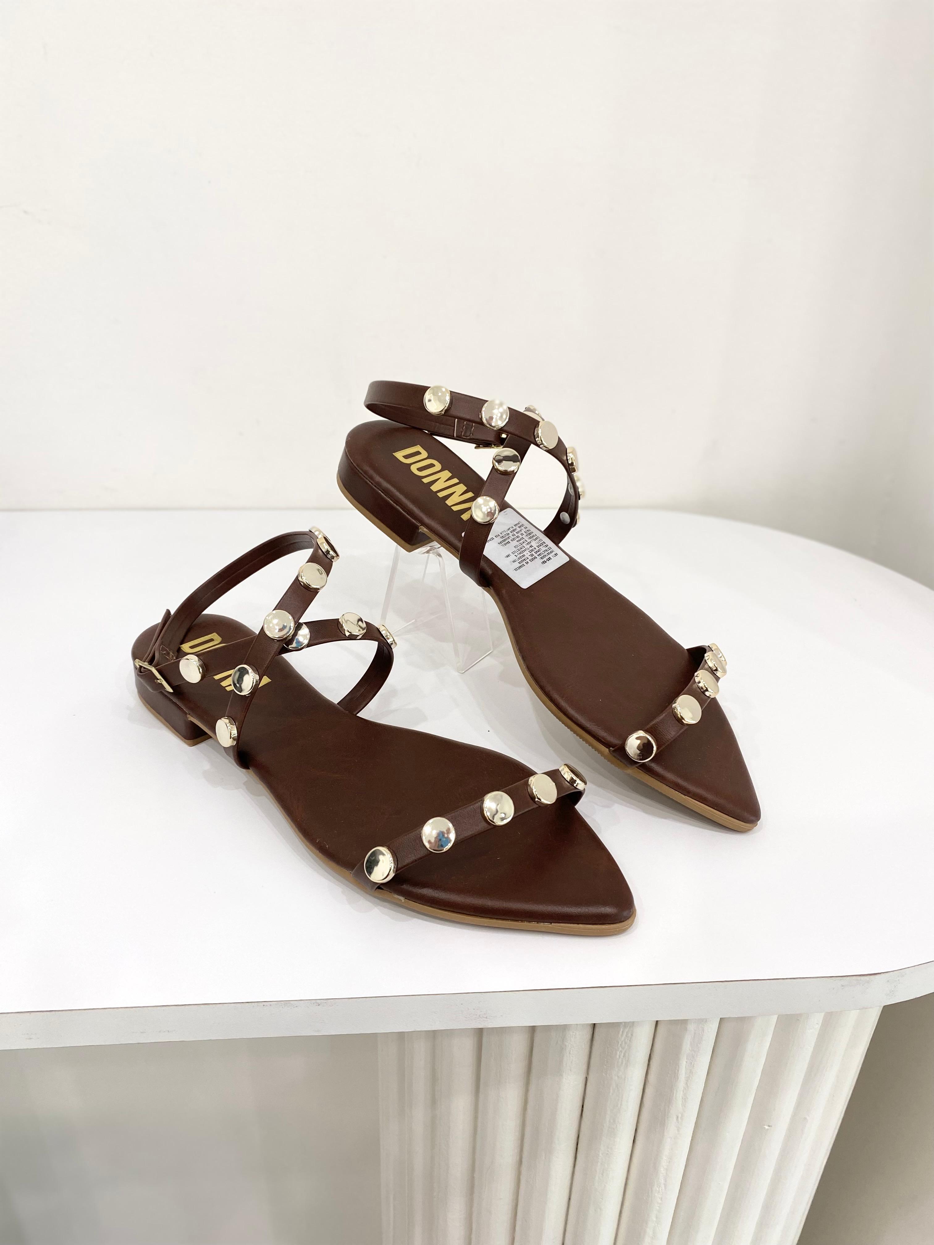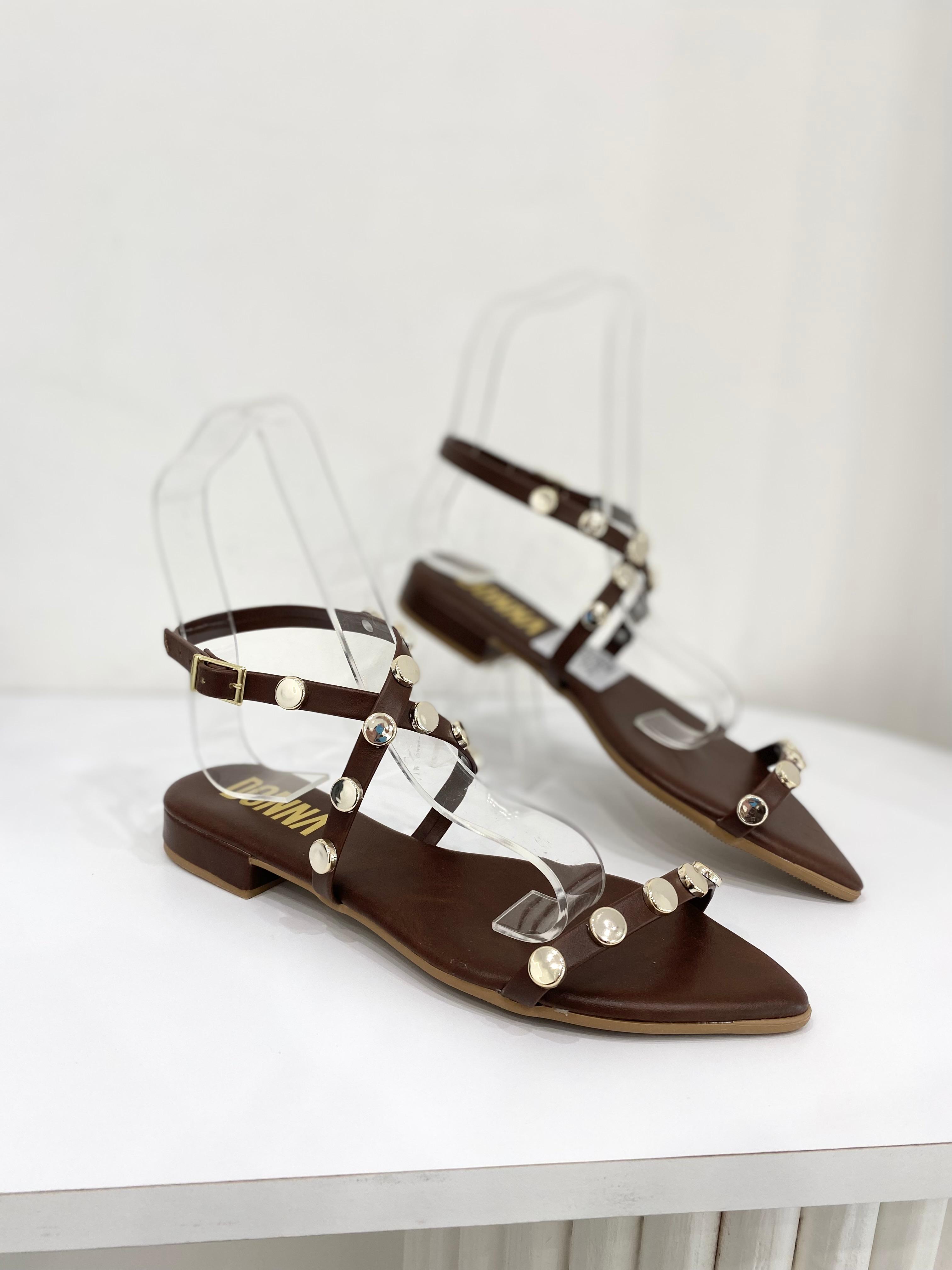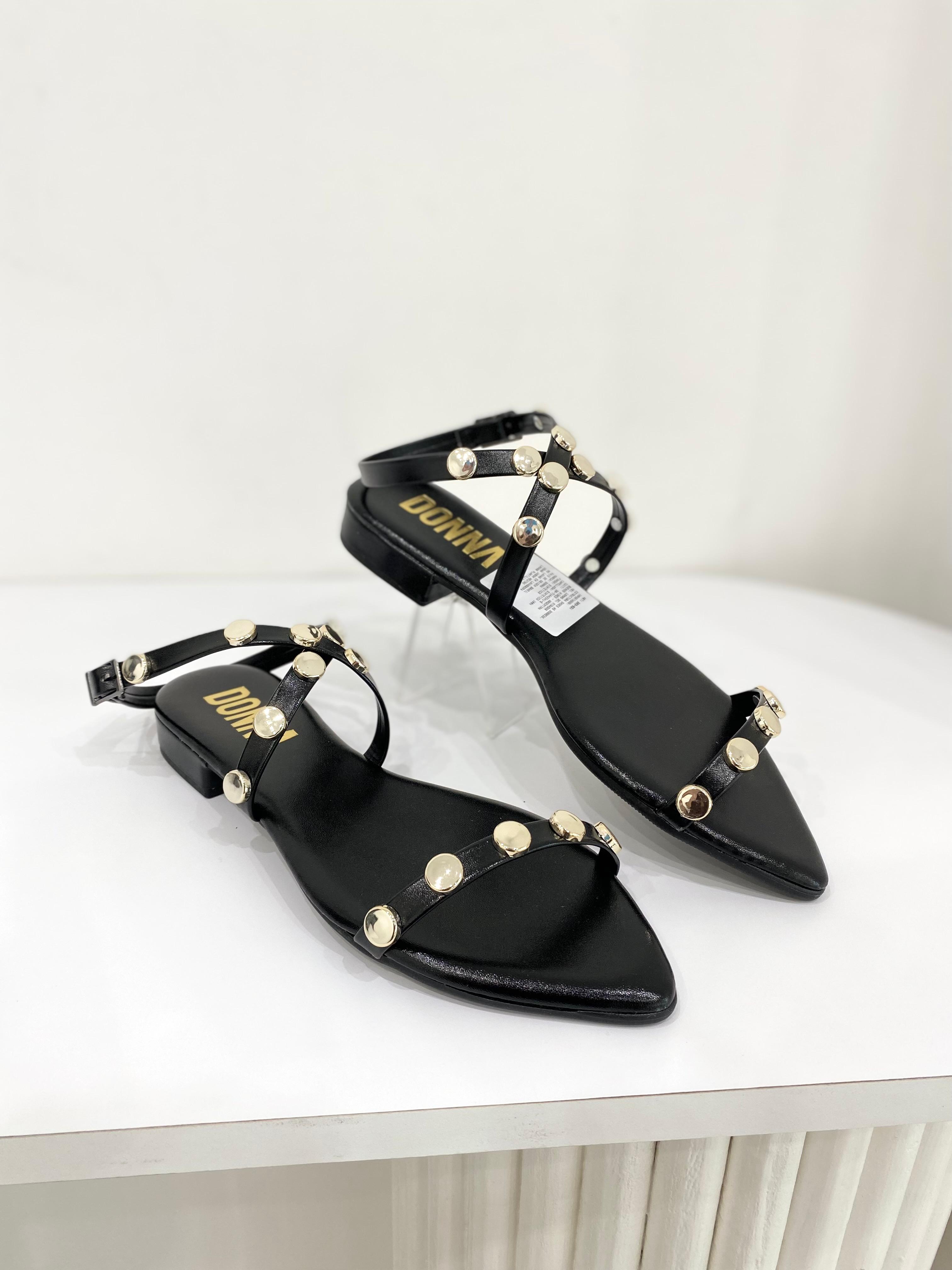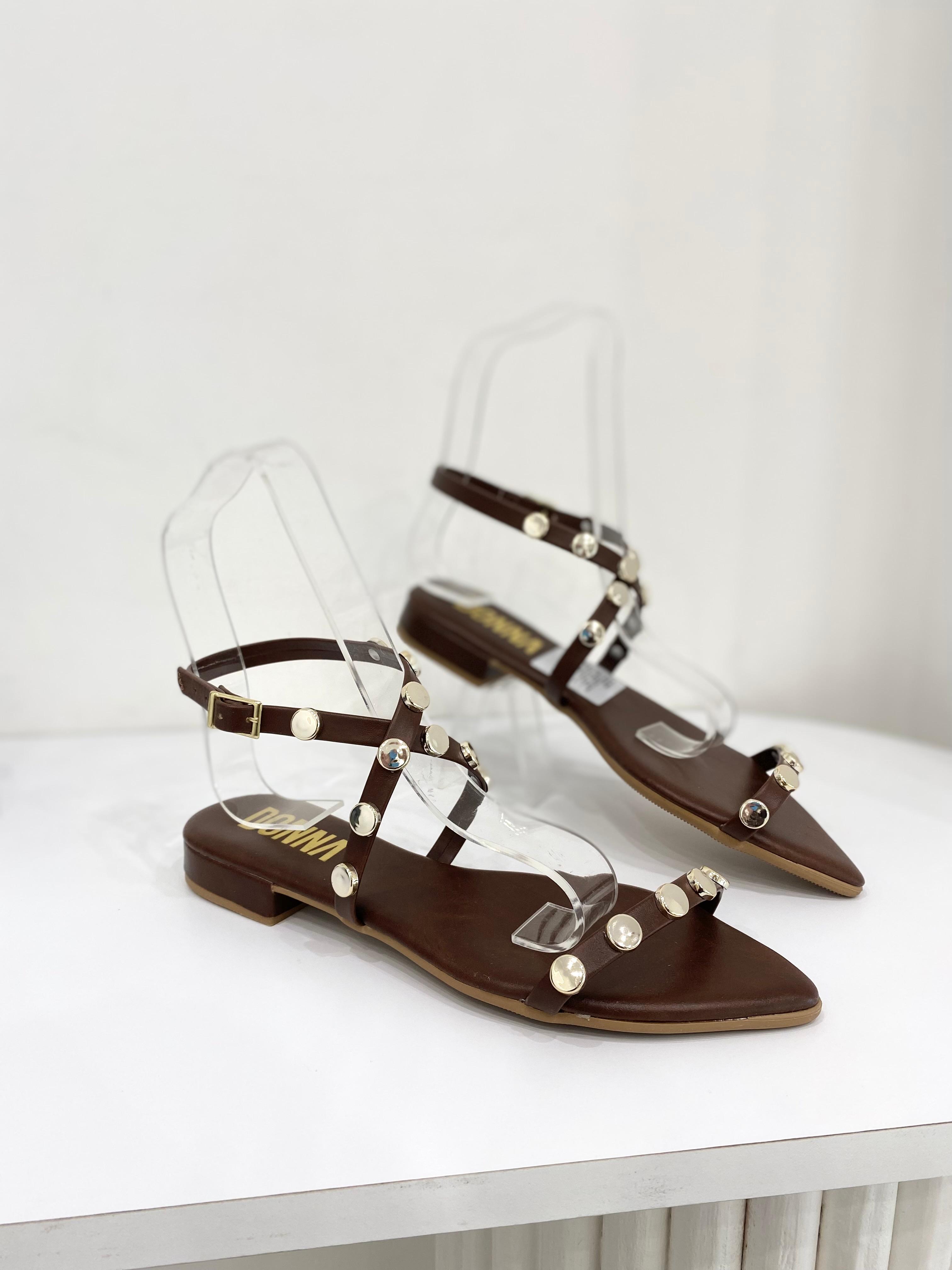 Sandalias importadas con apliques dorados, terminación en punta y taco cuadrado. La base es de goma y la plantilla es acolchonada.