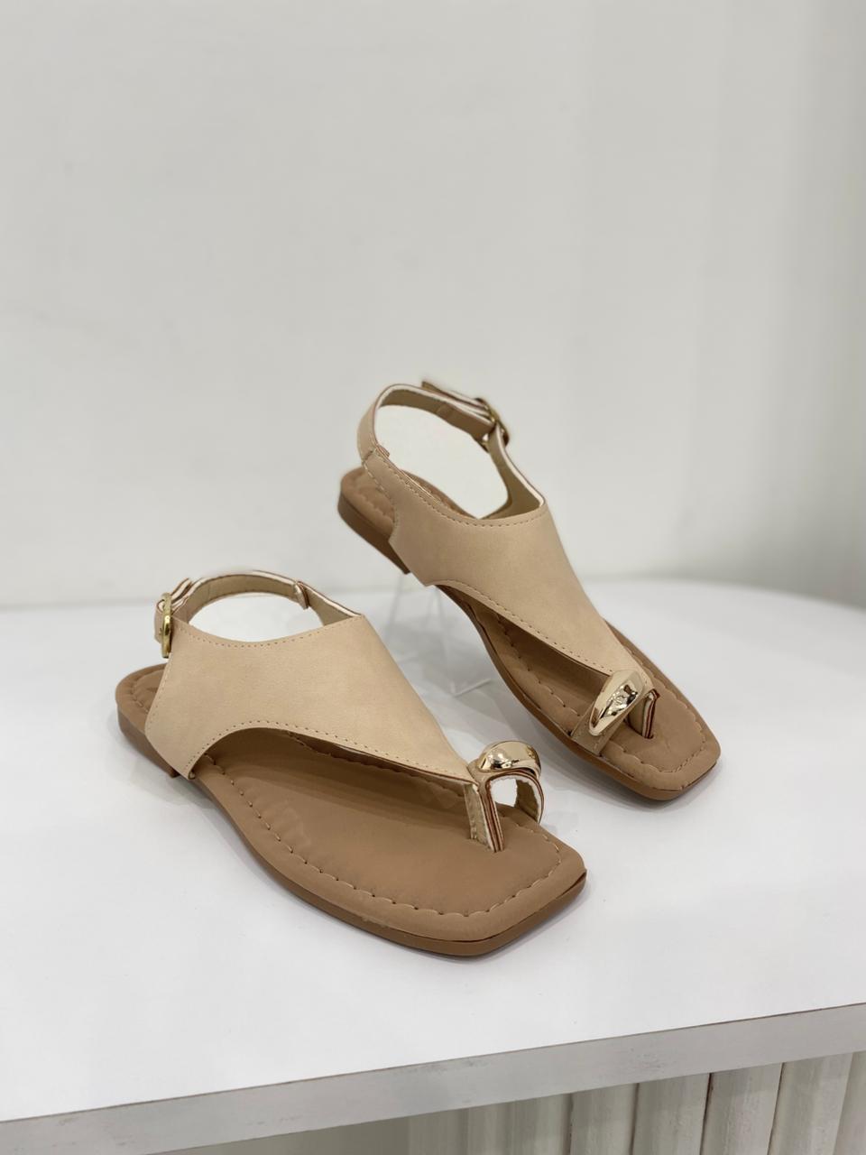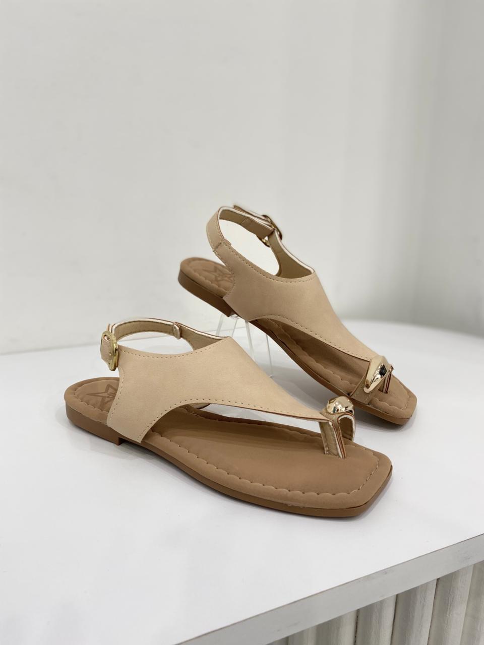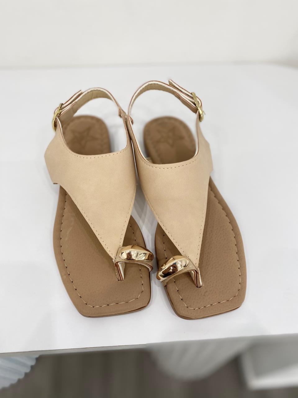 Sandalia de eco cuero con aplique dorado. Mini taco y base acolchonada.