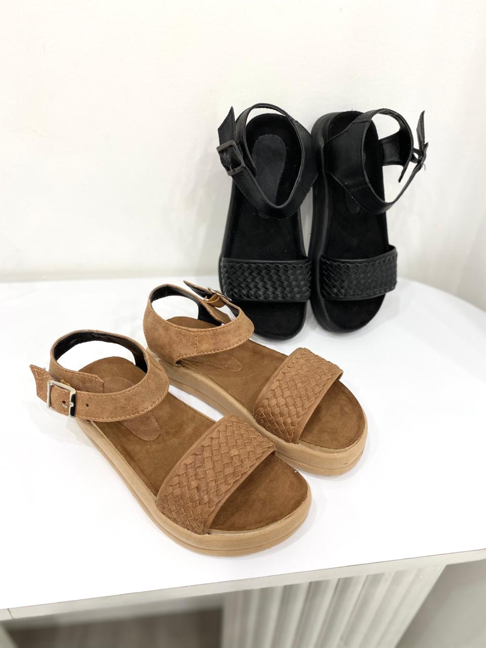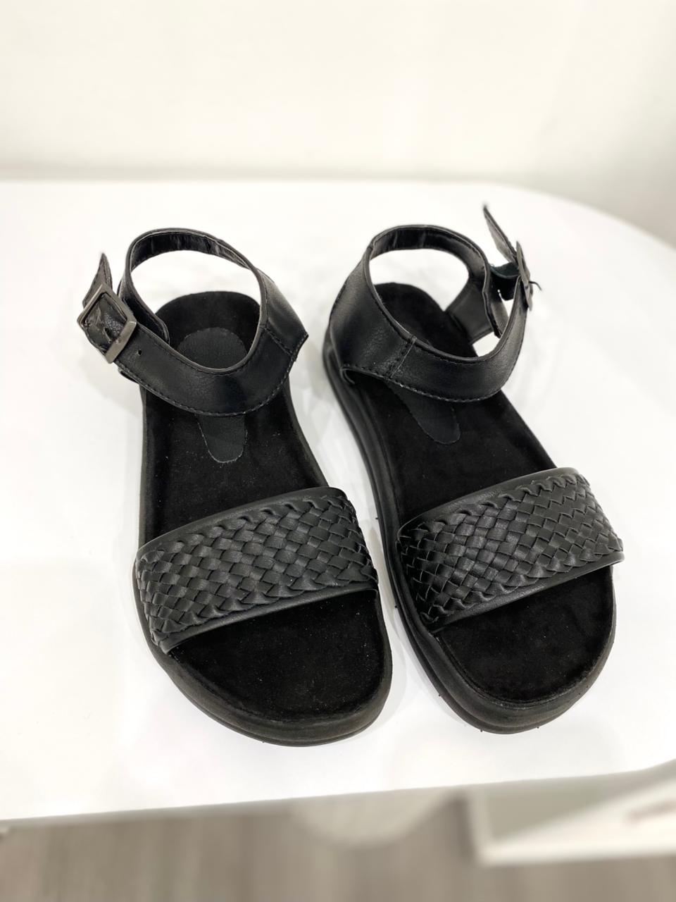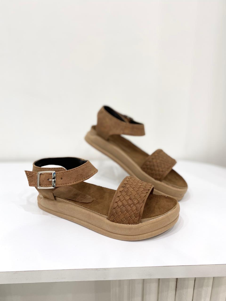 Sandalia de eco cuero con tira trenzada y base de goma.