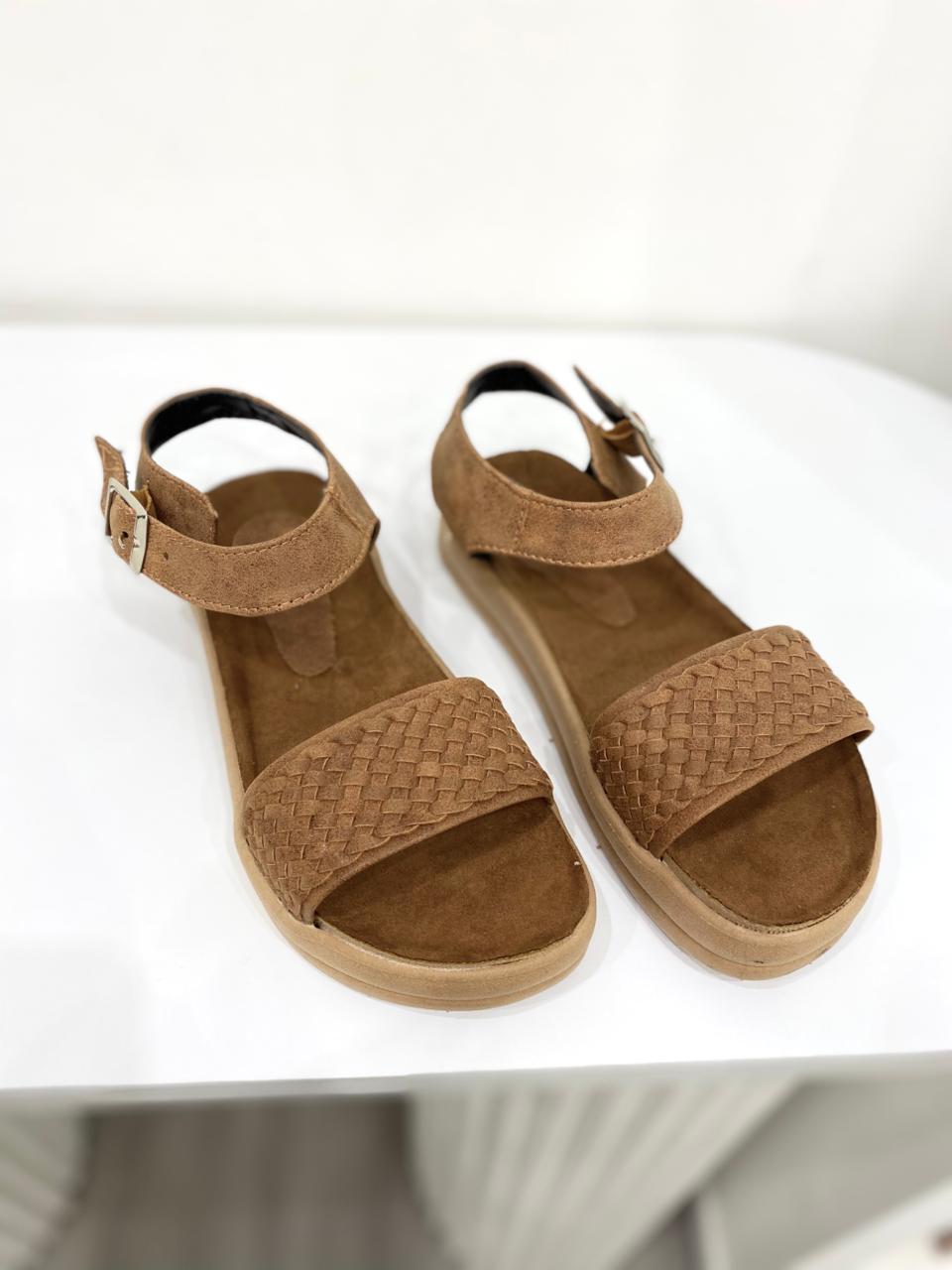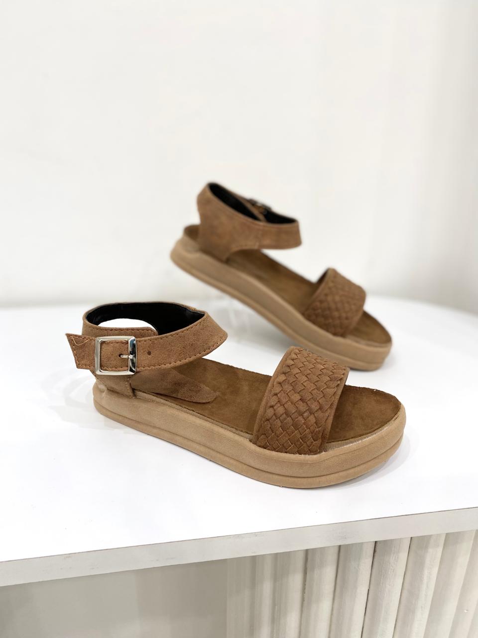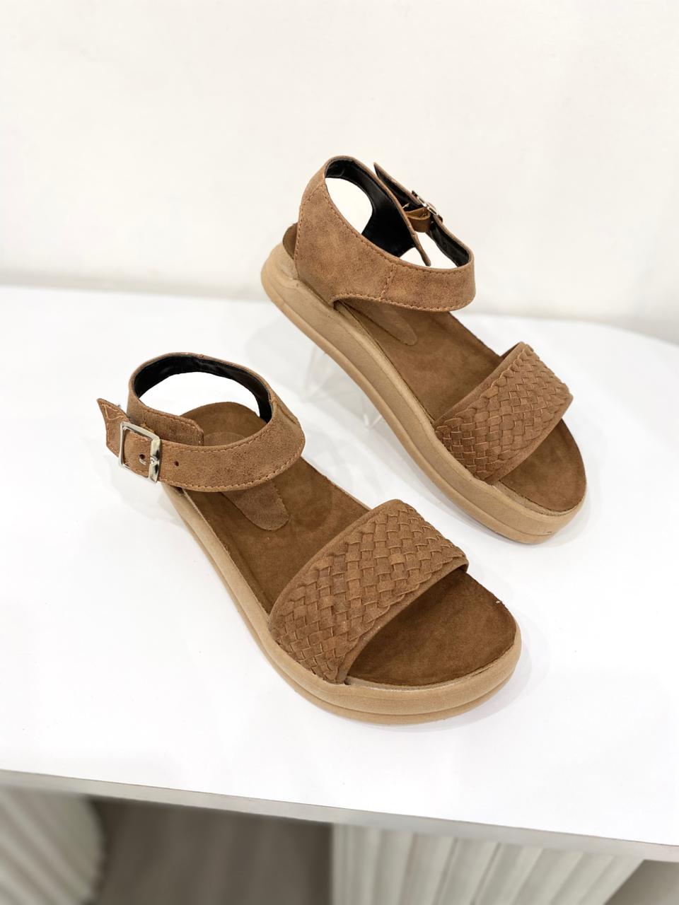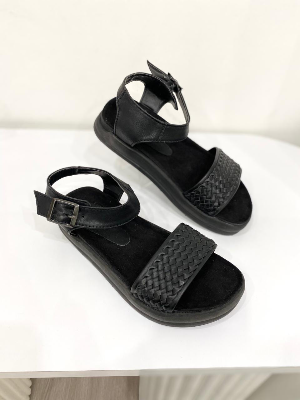 Sandalia de eco cuero con tira trenzada y base de goma.