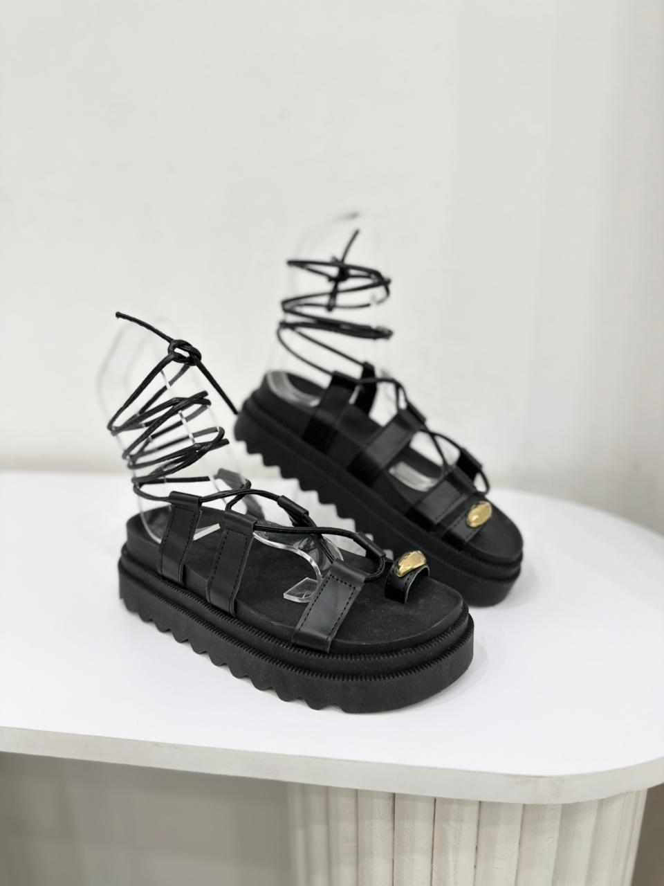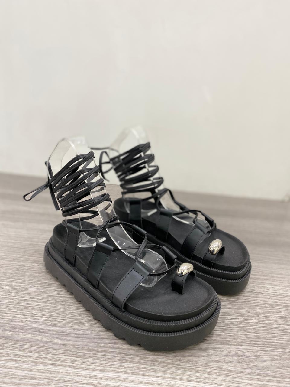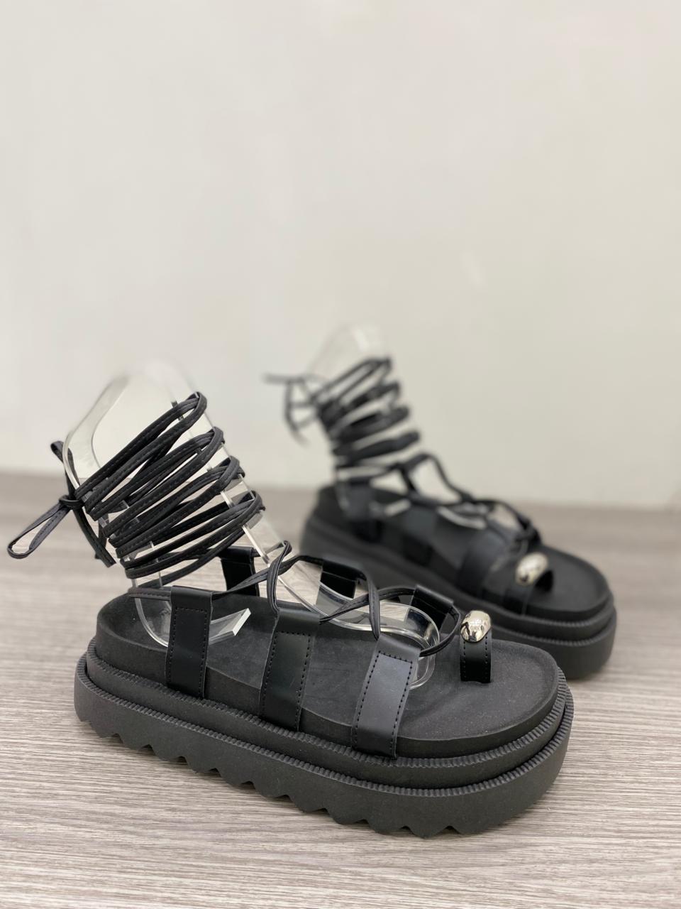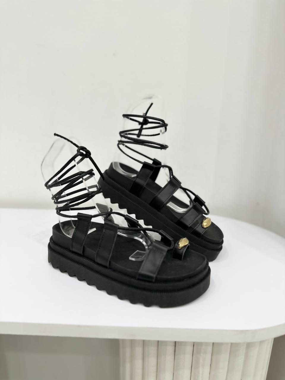 Sandalia de eco cuero con tiras regulables para atar en pierna. Tiene detalle de aplique dorado y plataforma alta.
