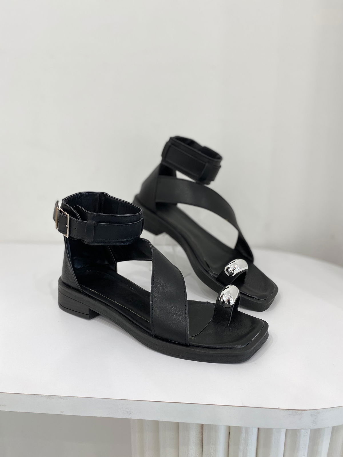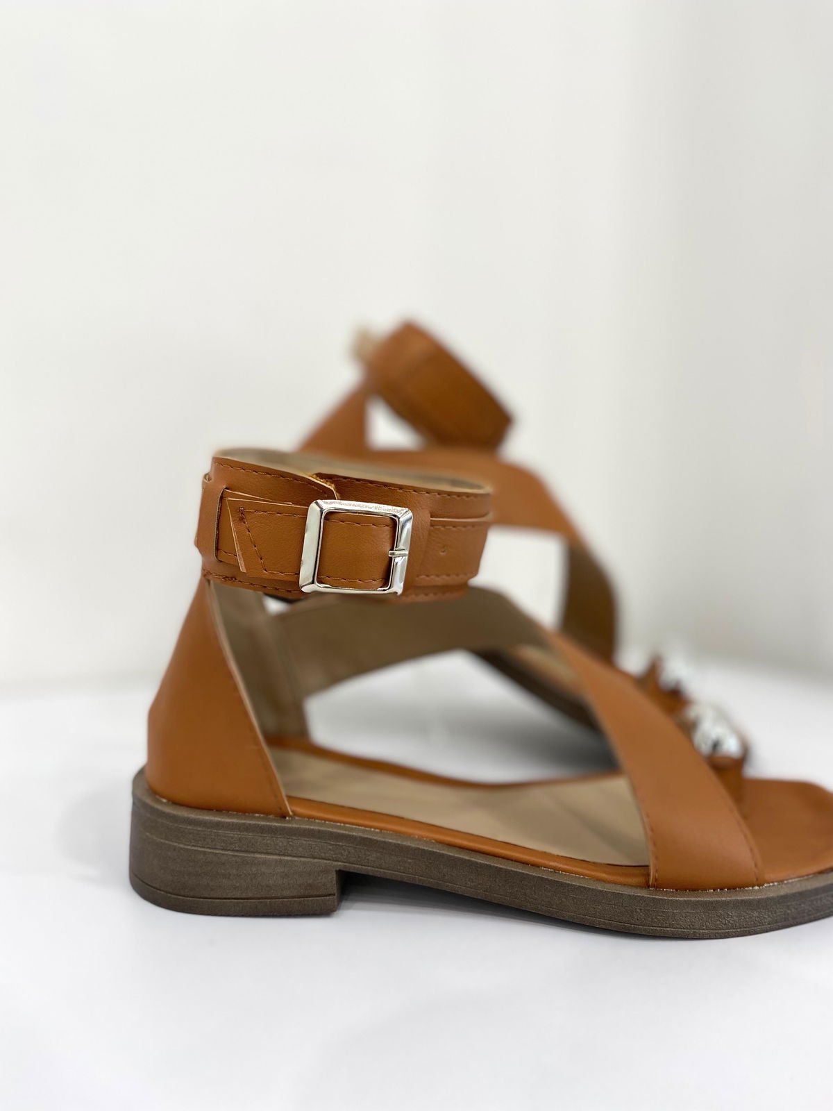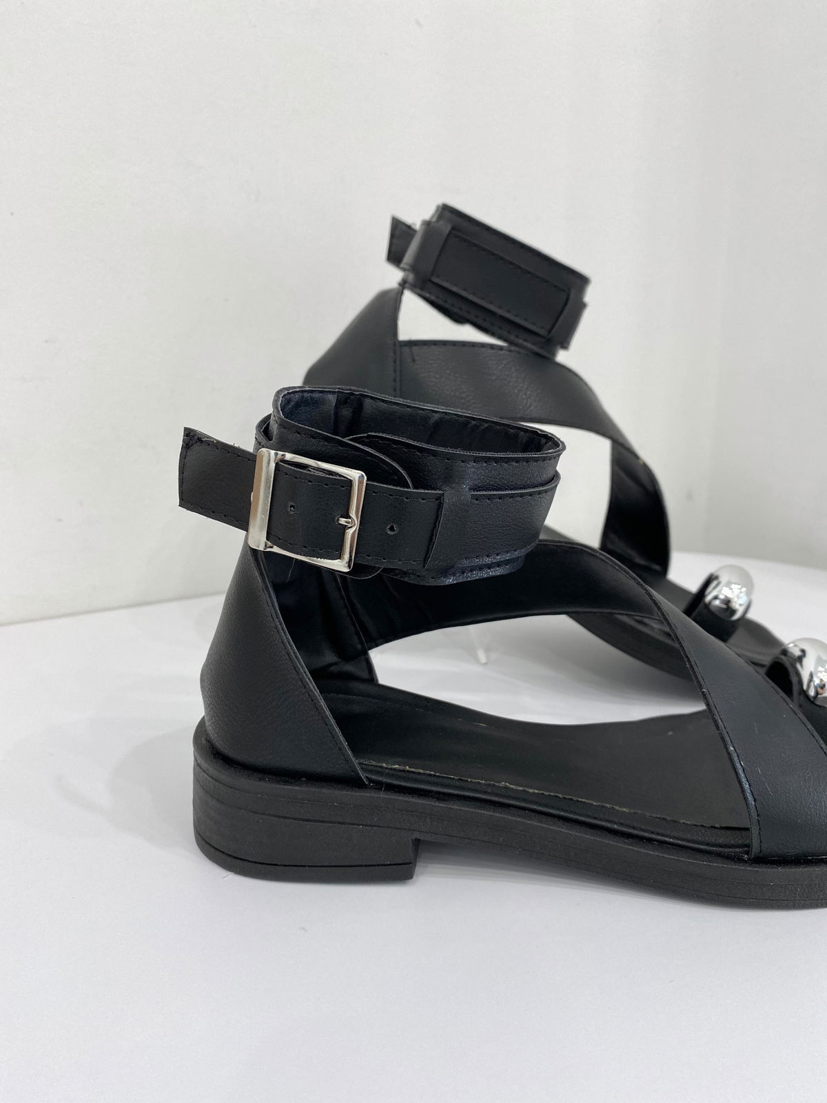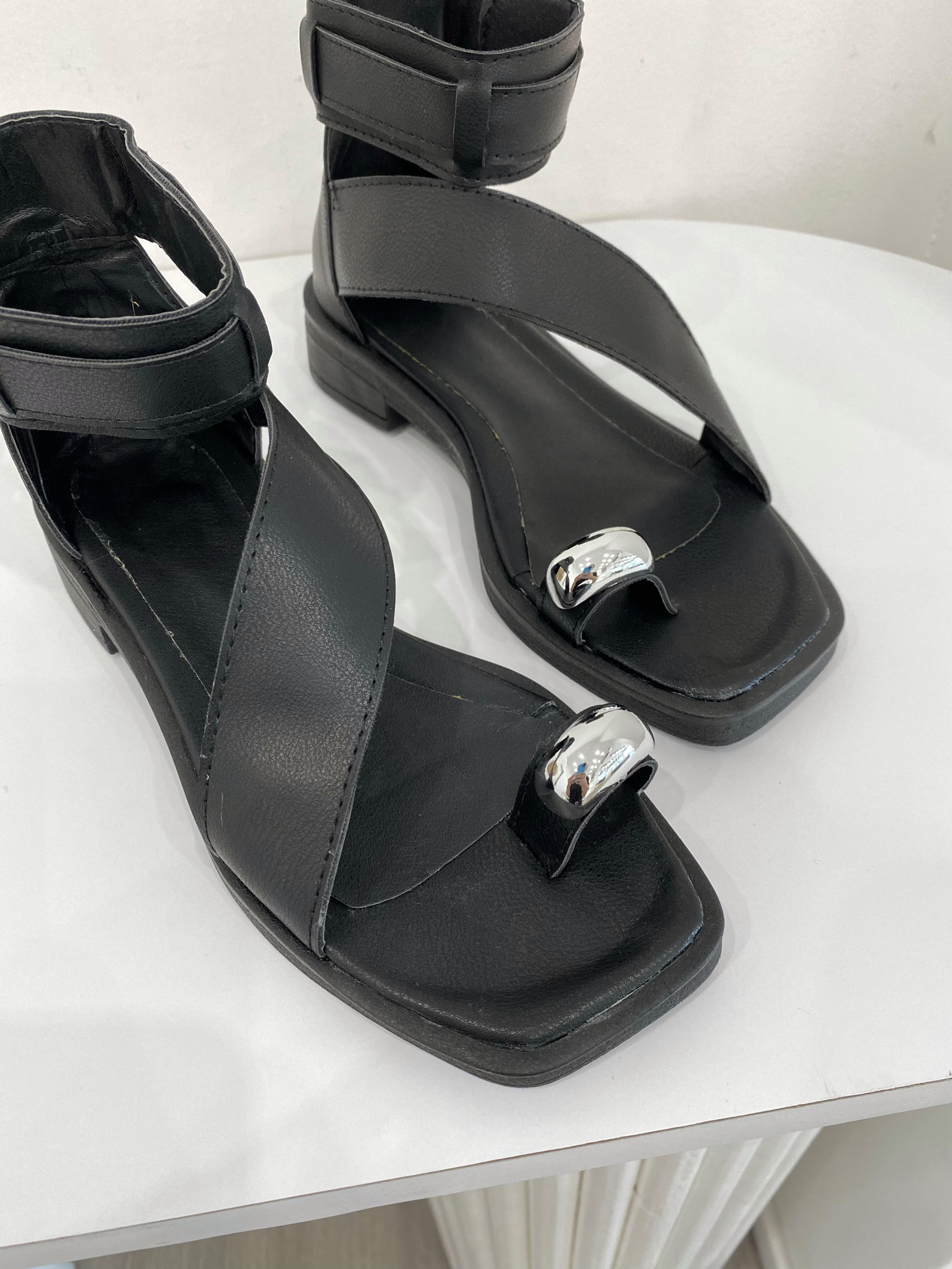 Sandalia de eco cuero con tiras bien anchas y aplique plateado.