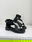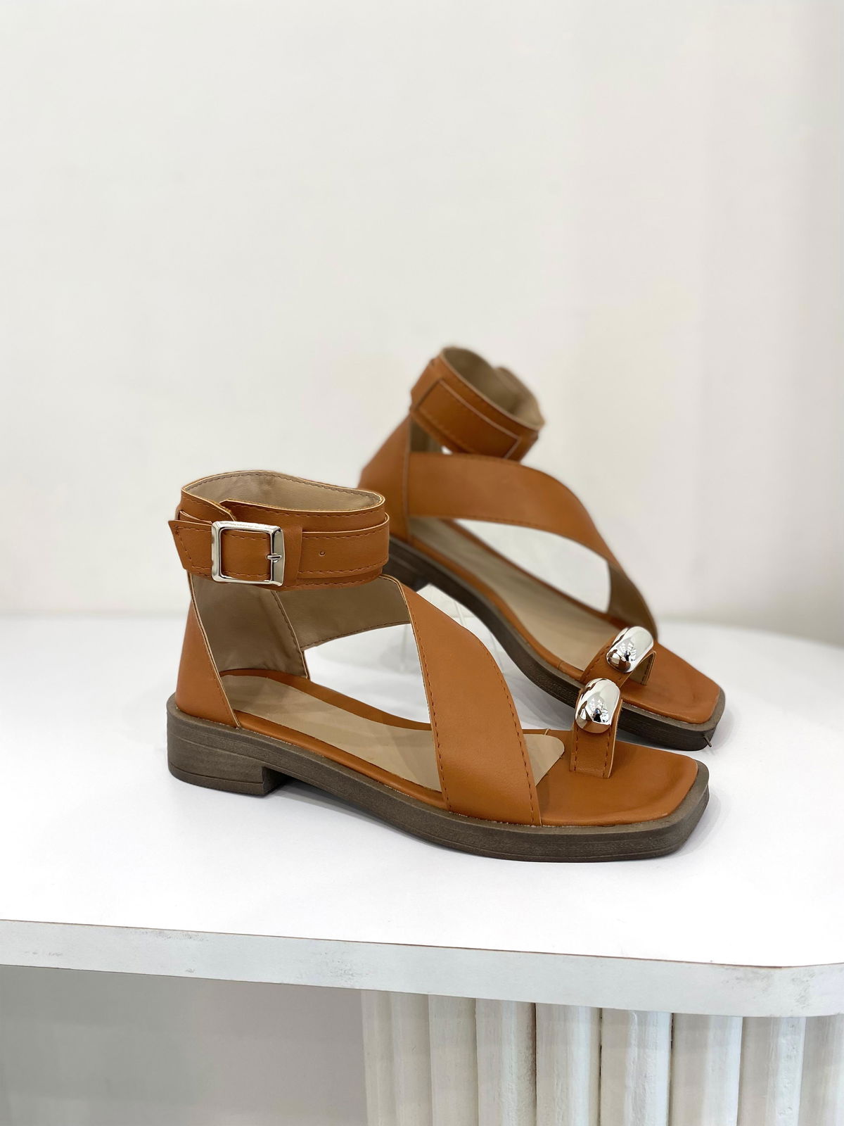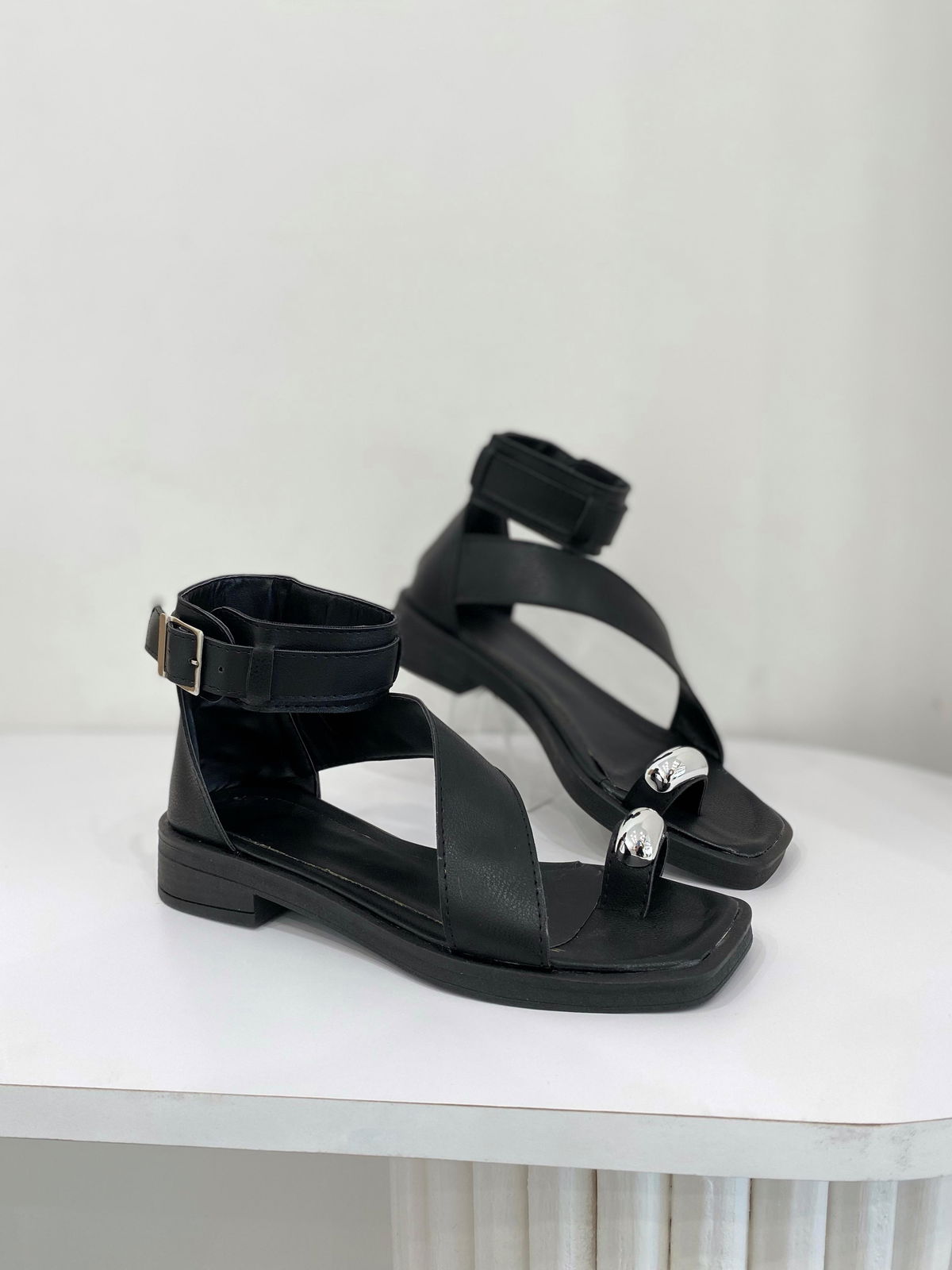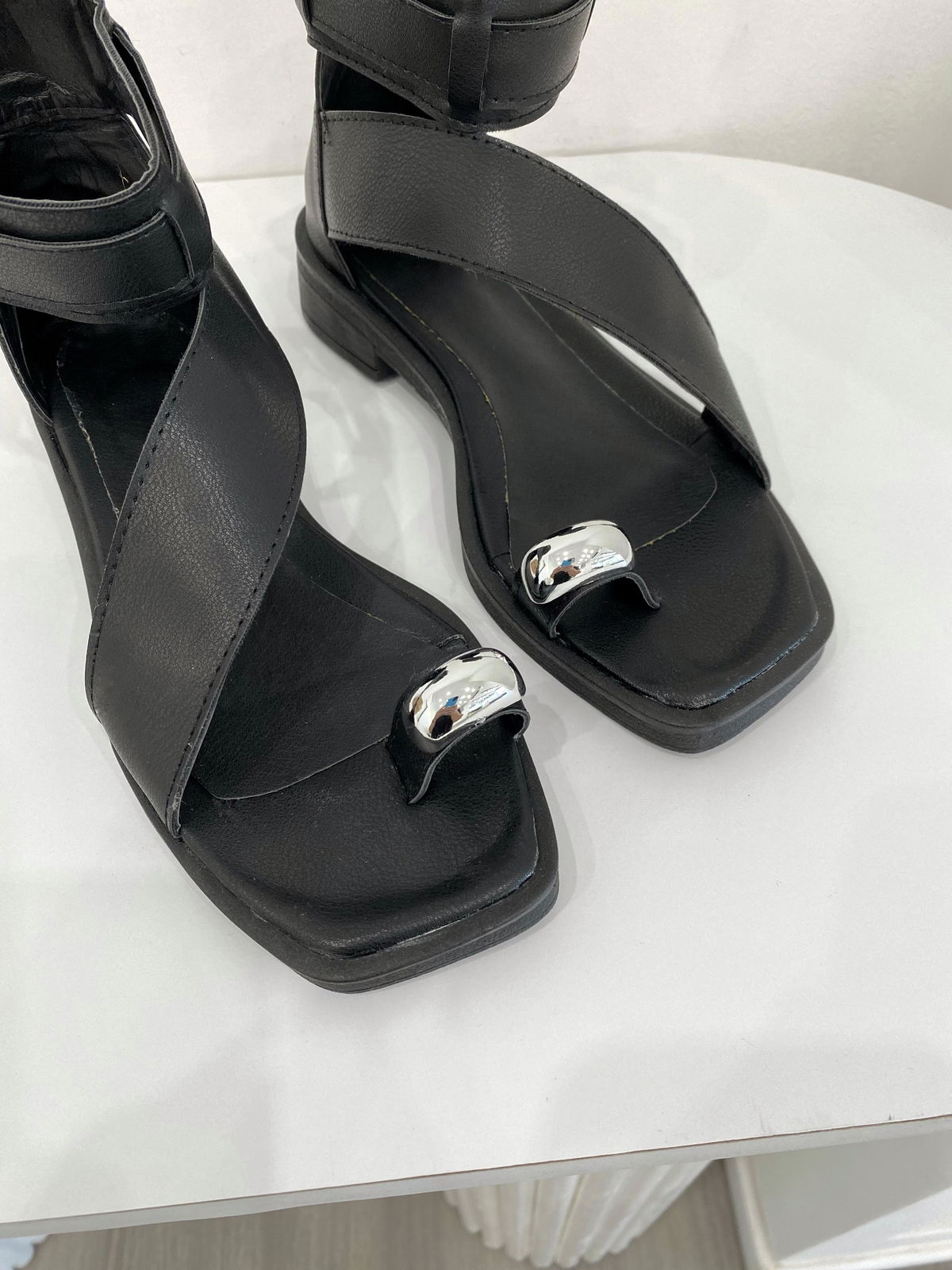 Sandalia de eco cuero con tiras bien anchas y aplique plateado.