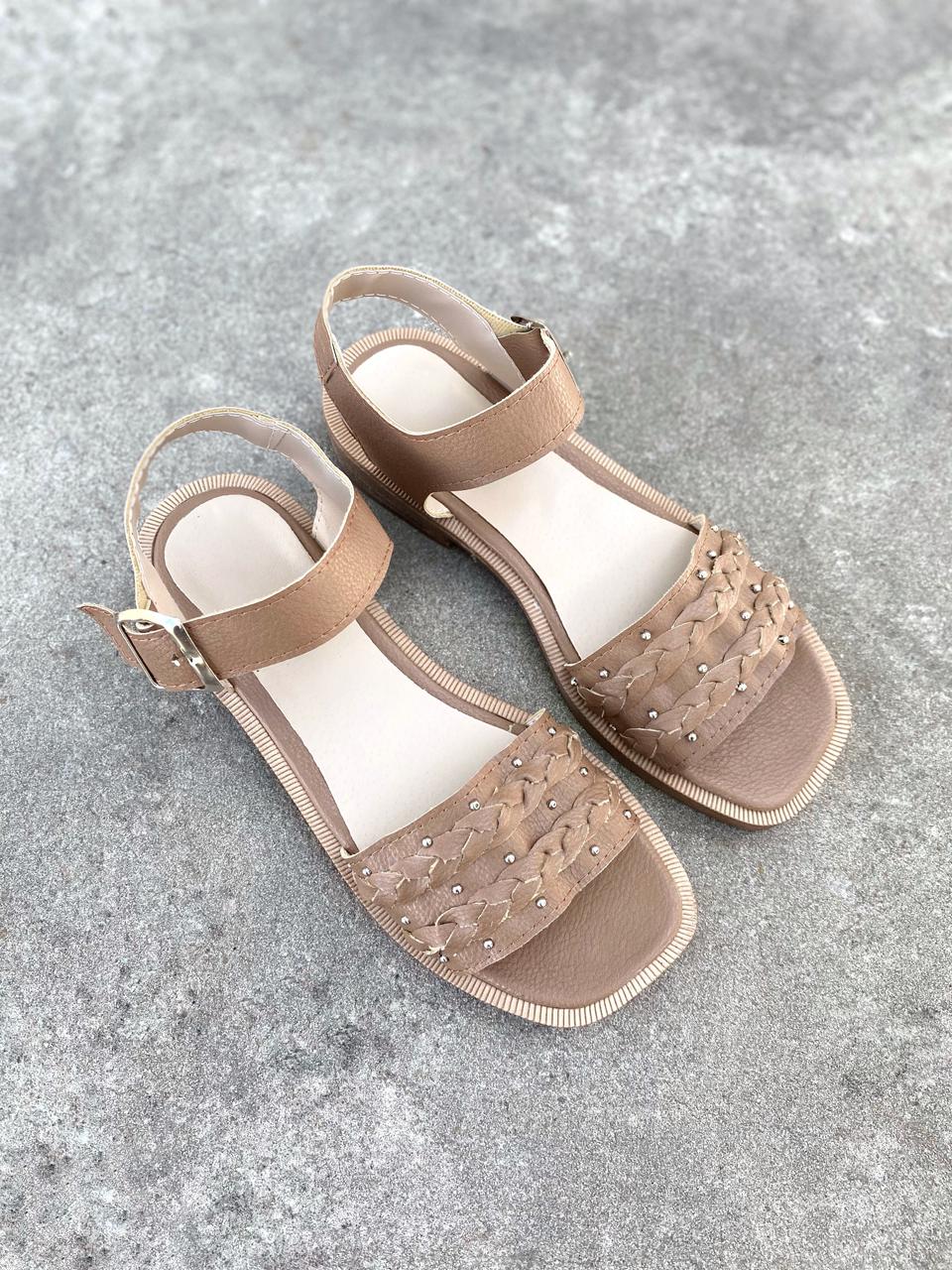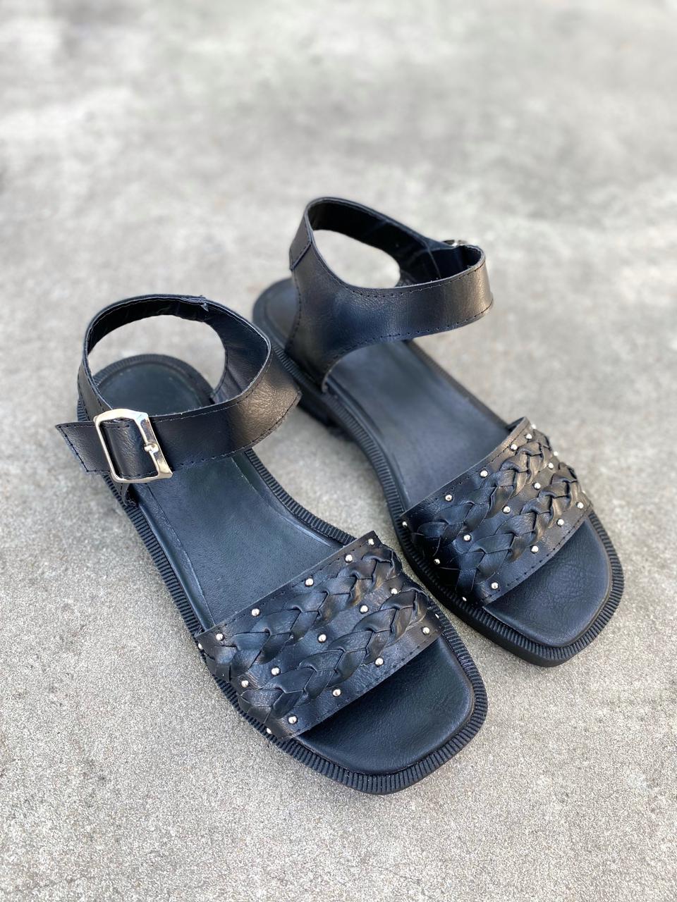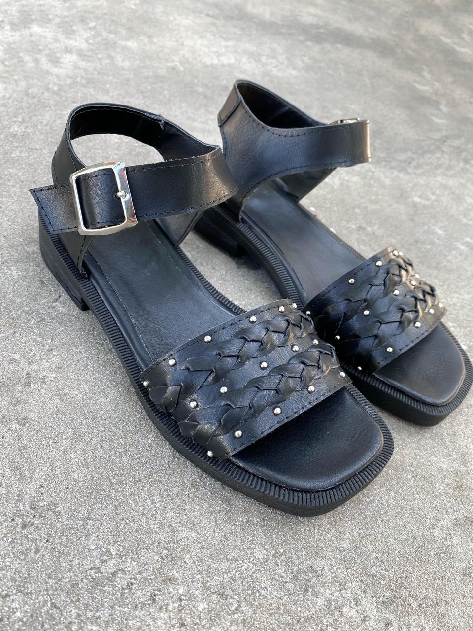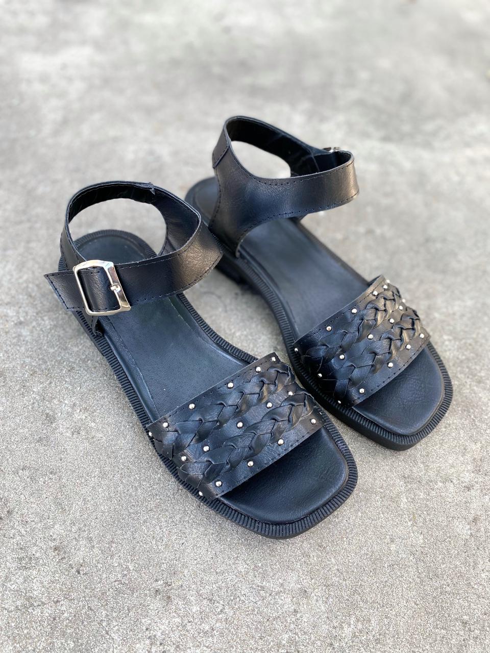 Sandalia de eco cuero con detalle de volado con tachas y mini taquito de goma.