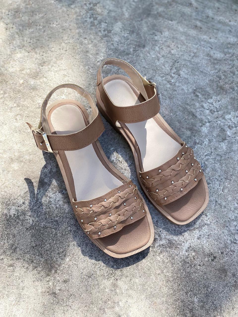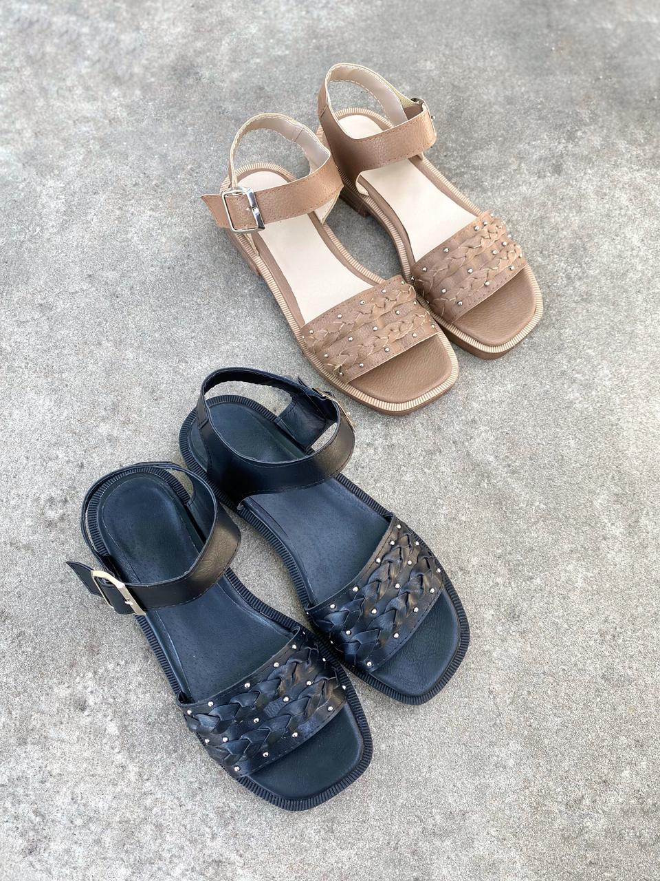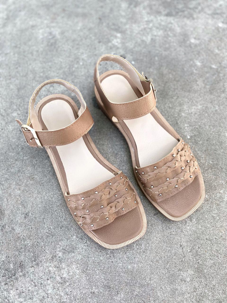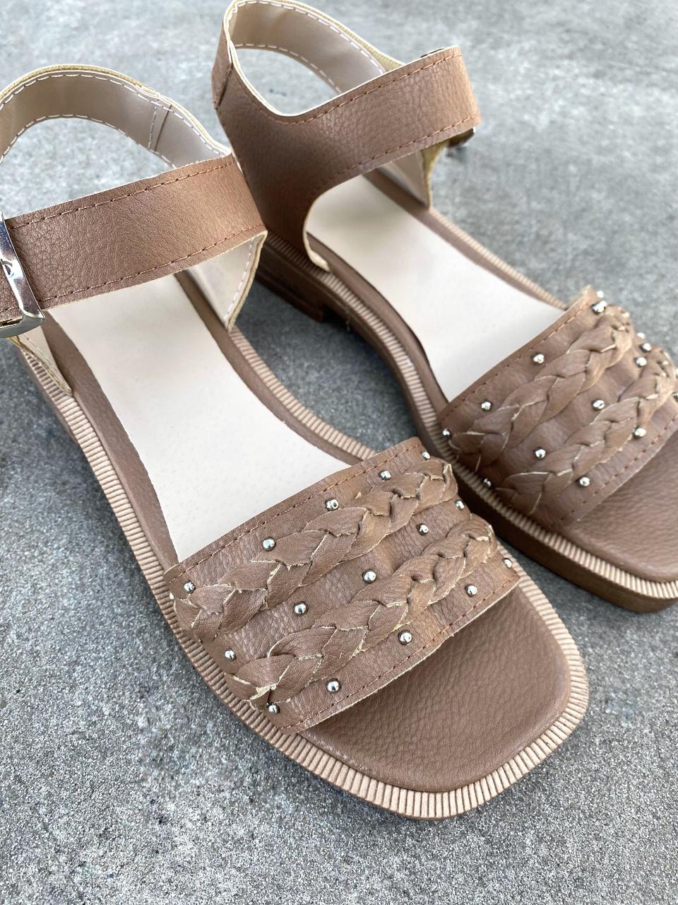 Sandalia de eco cuero con detalle de volado con tachas y mini taquito de goma.