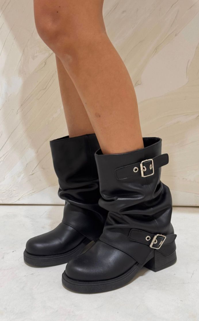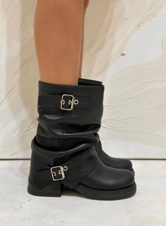 Botas de cuero con efecto arrugado (no desmontable) y detalle de hebillas.