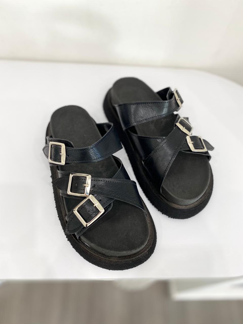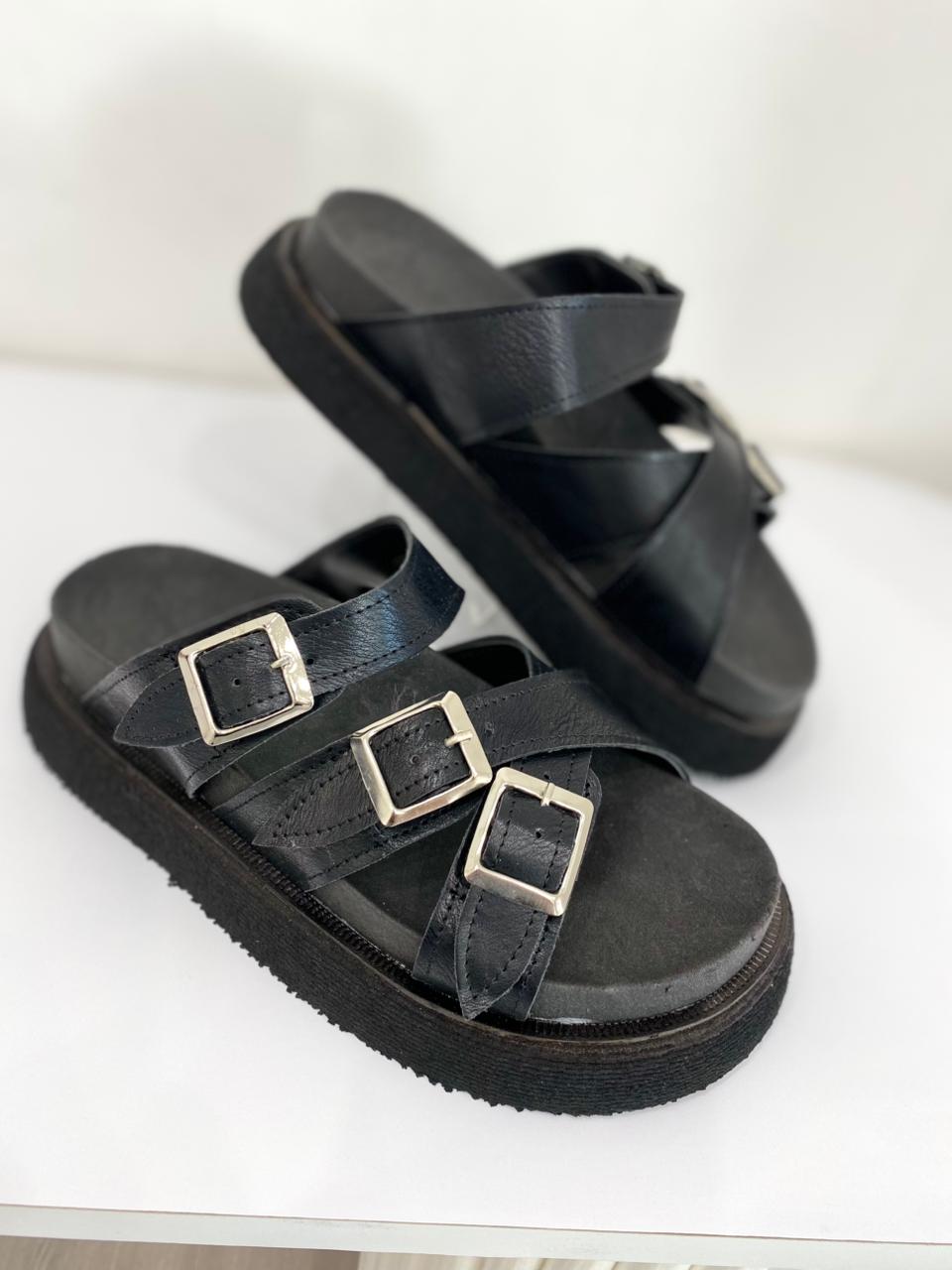 Chola de eco cuero con cintitos. Tiene base de goma.