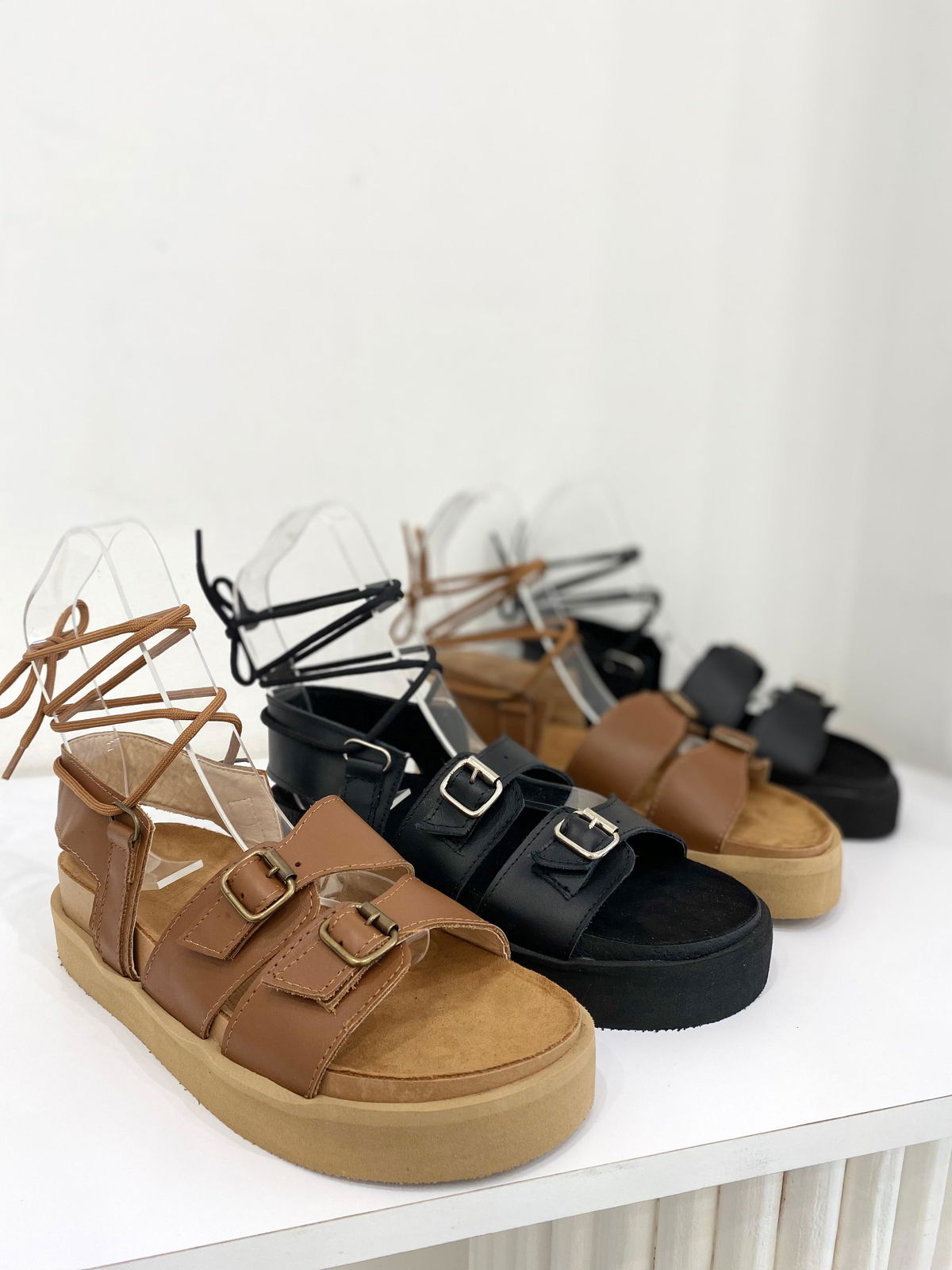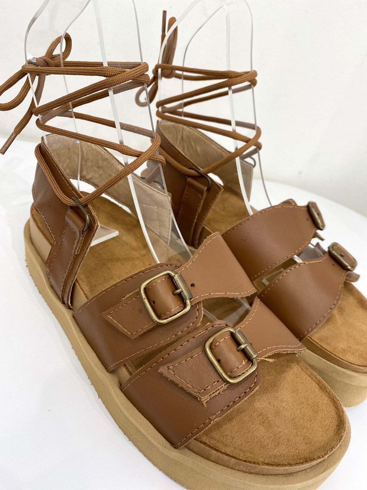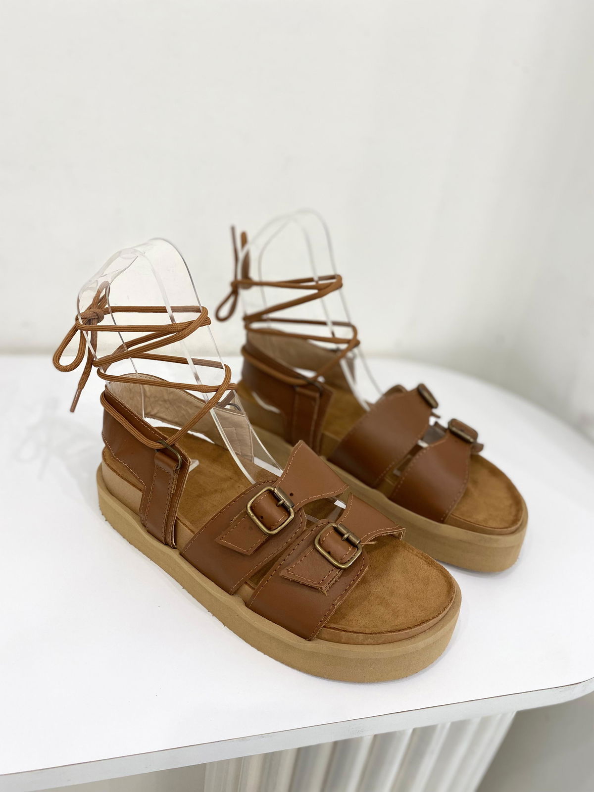 Sandalia de eco cuero estilo romana con hebillas ajustables y cordón para atar.
