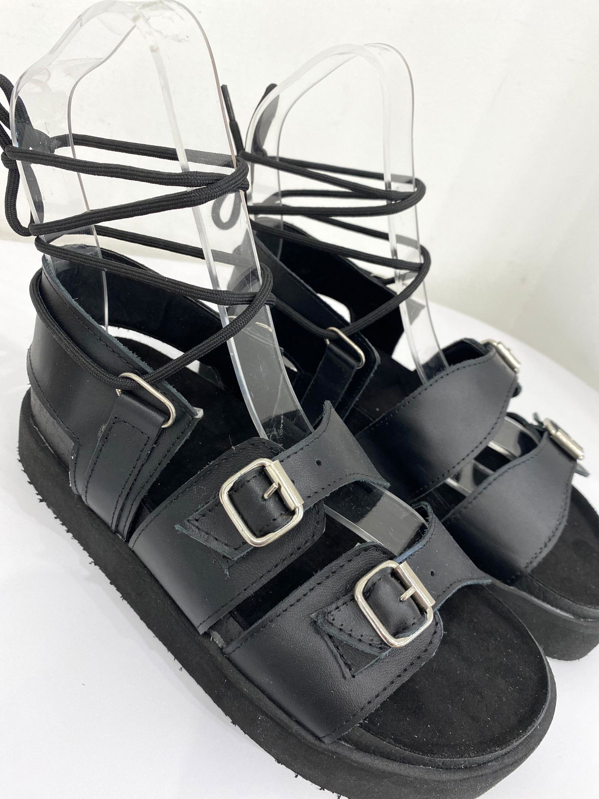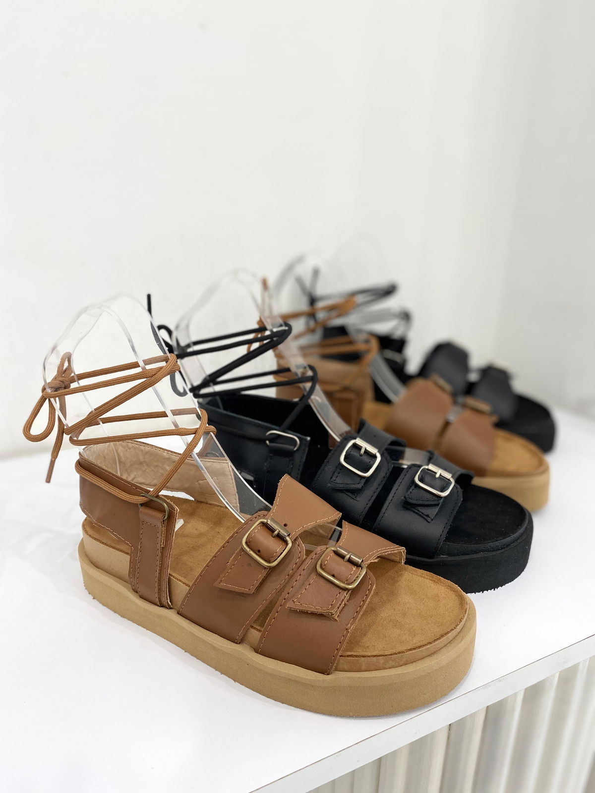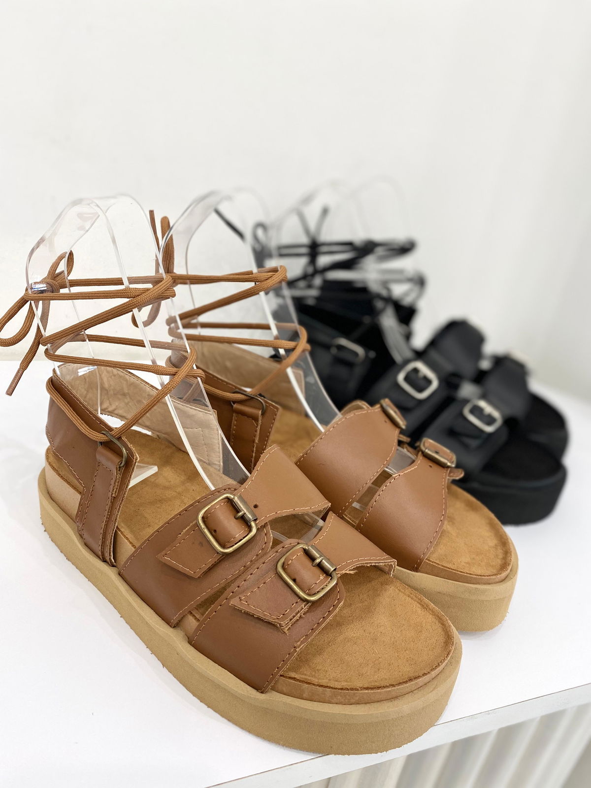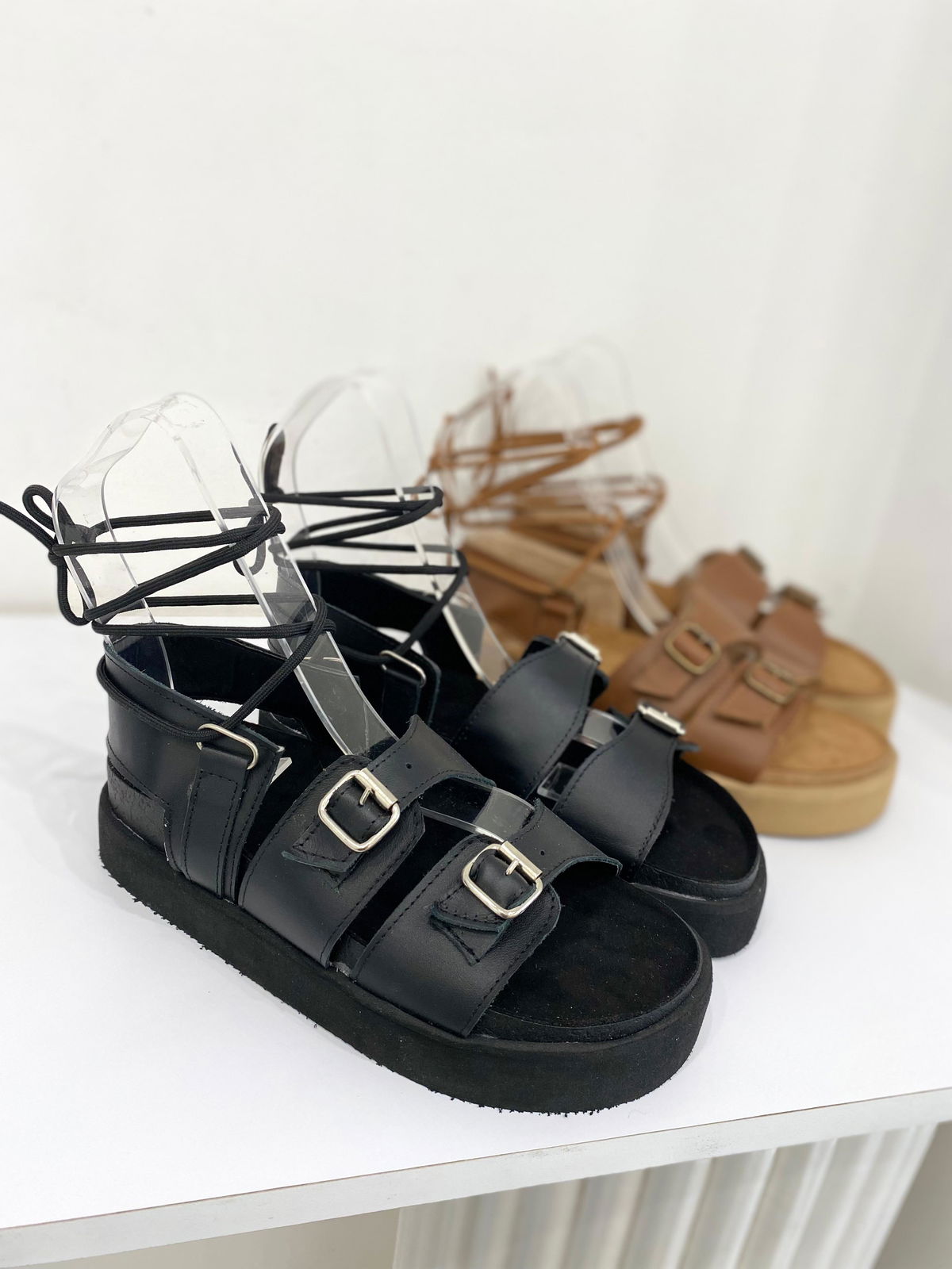 Sandalia de eco cuero estilo romana con hebillas ajustables y cordón para atar.