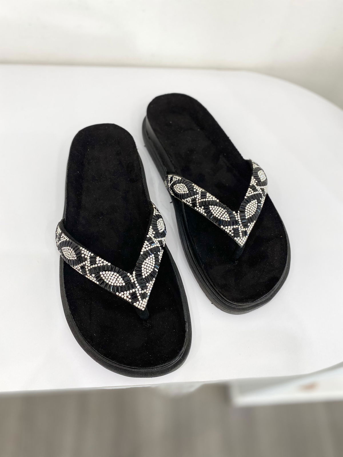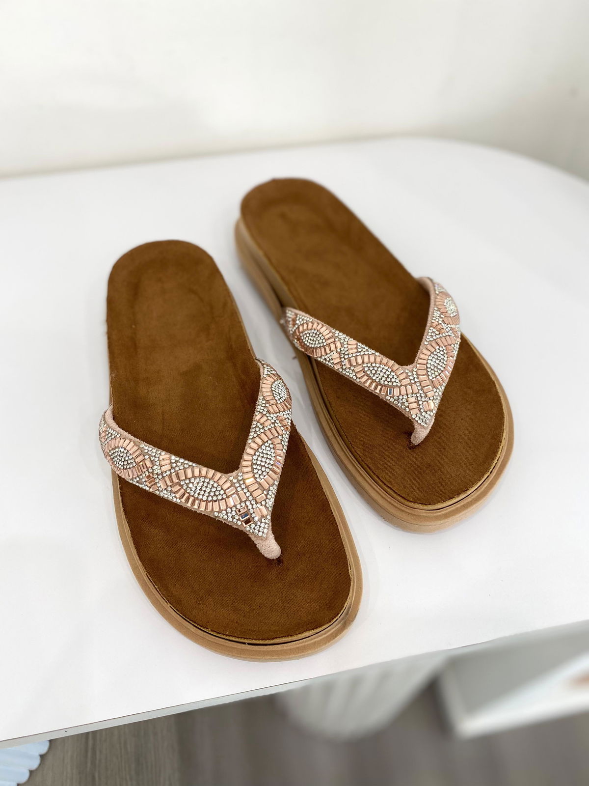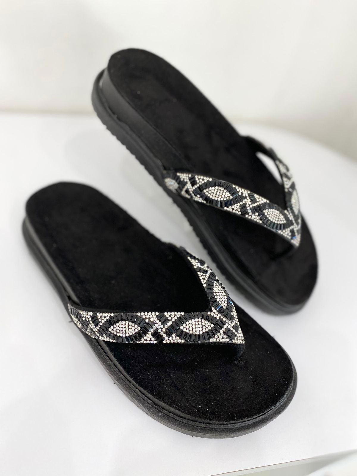Ojota de eco cuero con tiras de strass y piedras.