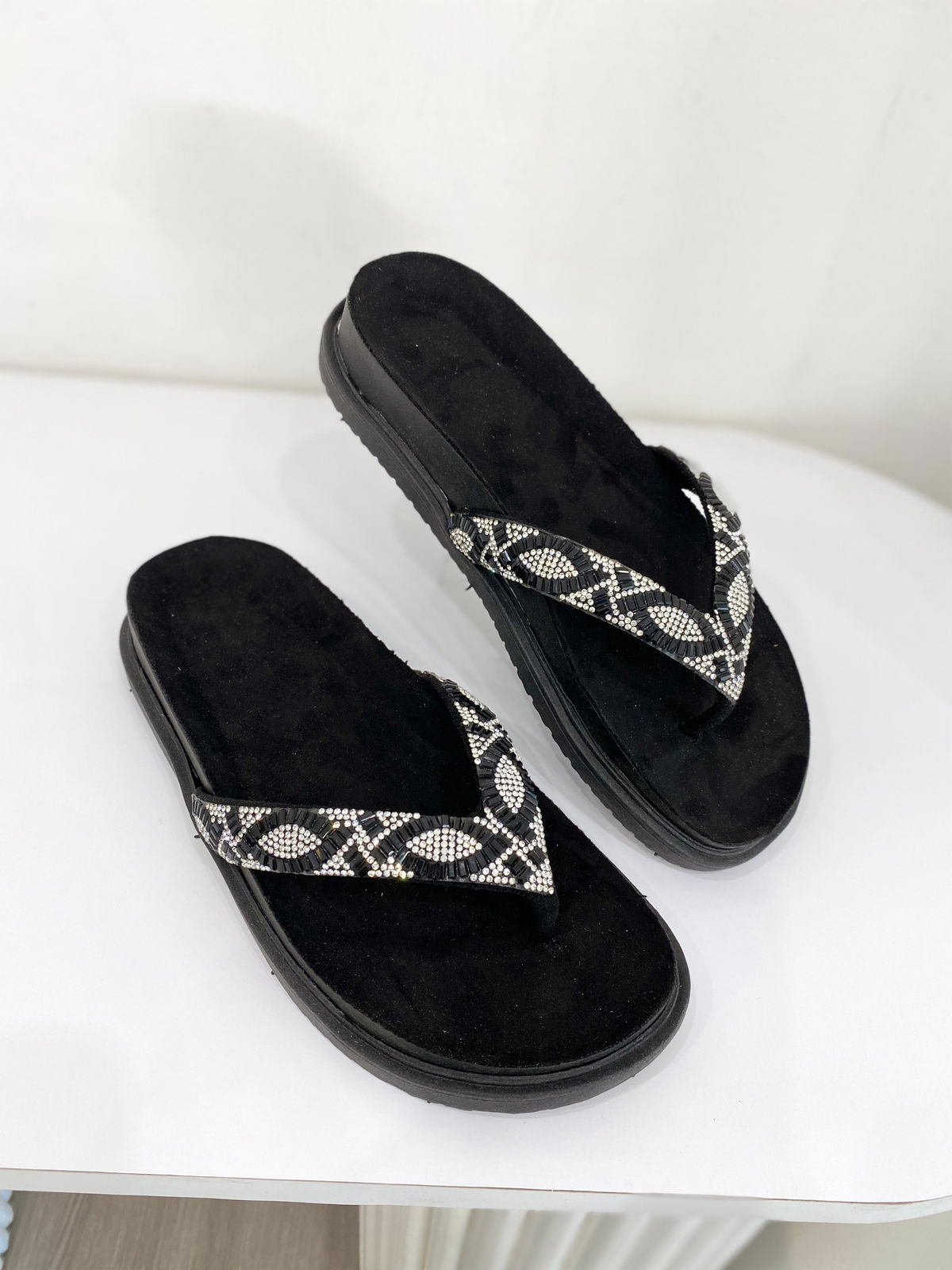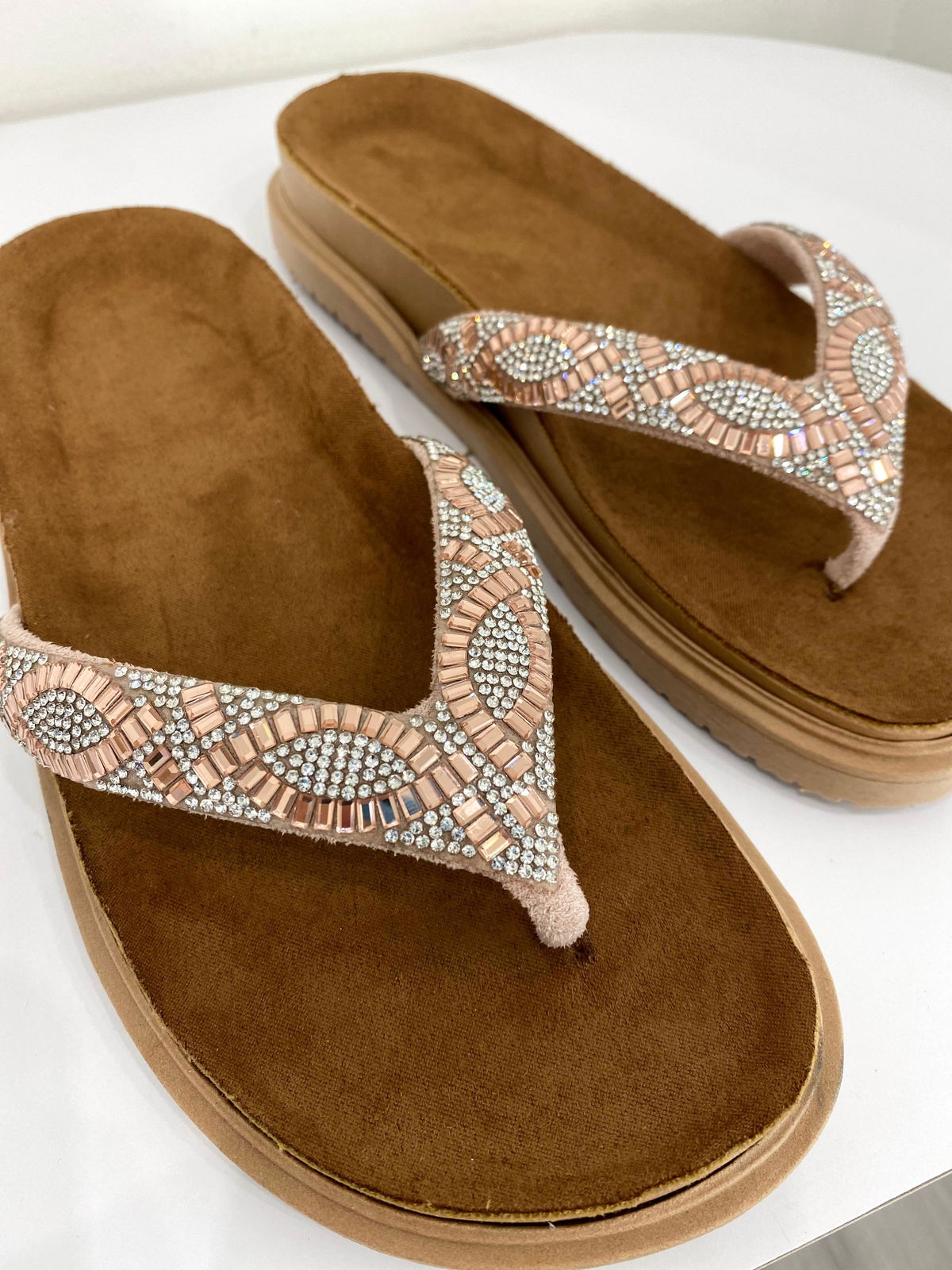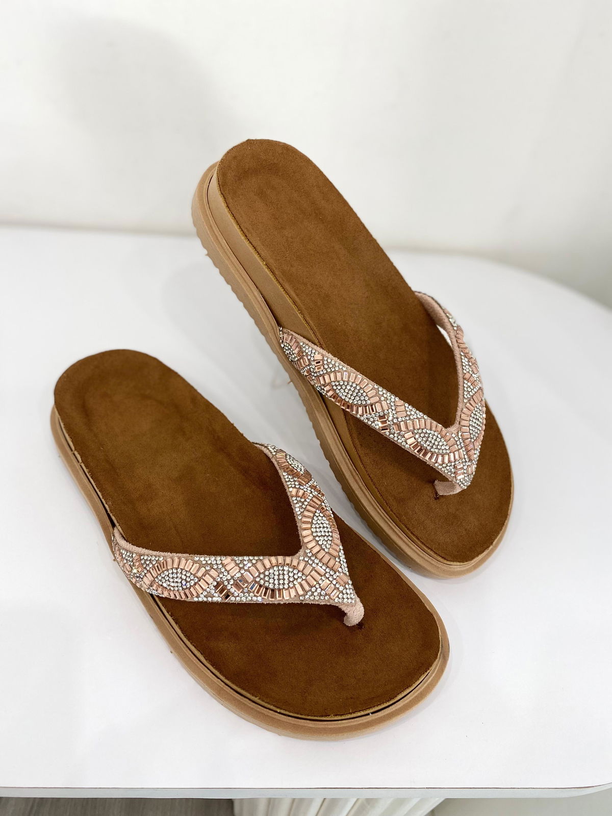 Ojota de eco cuero con tiras de strass y piedras.