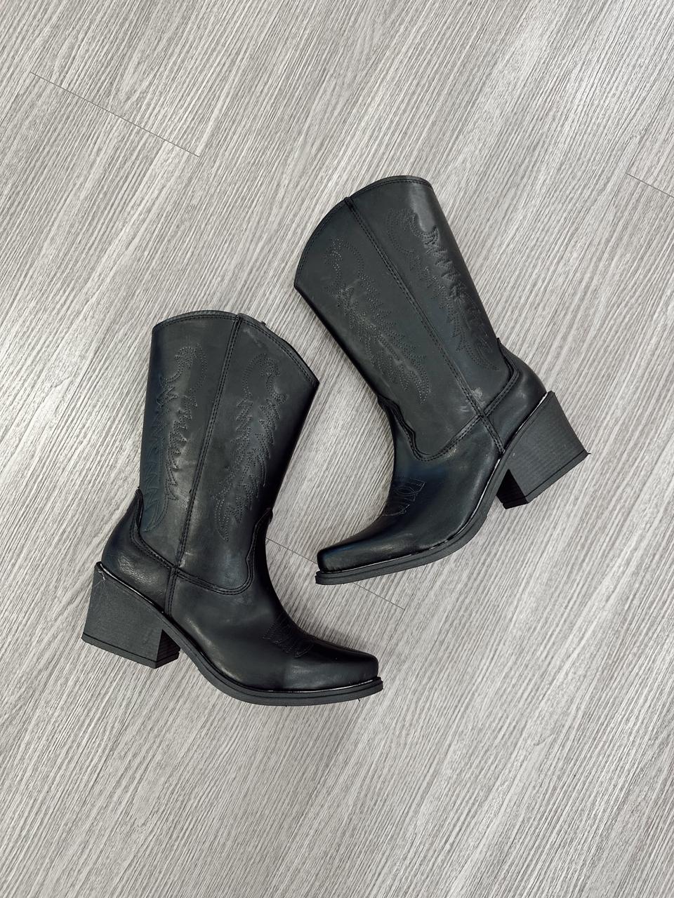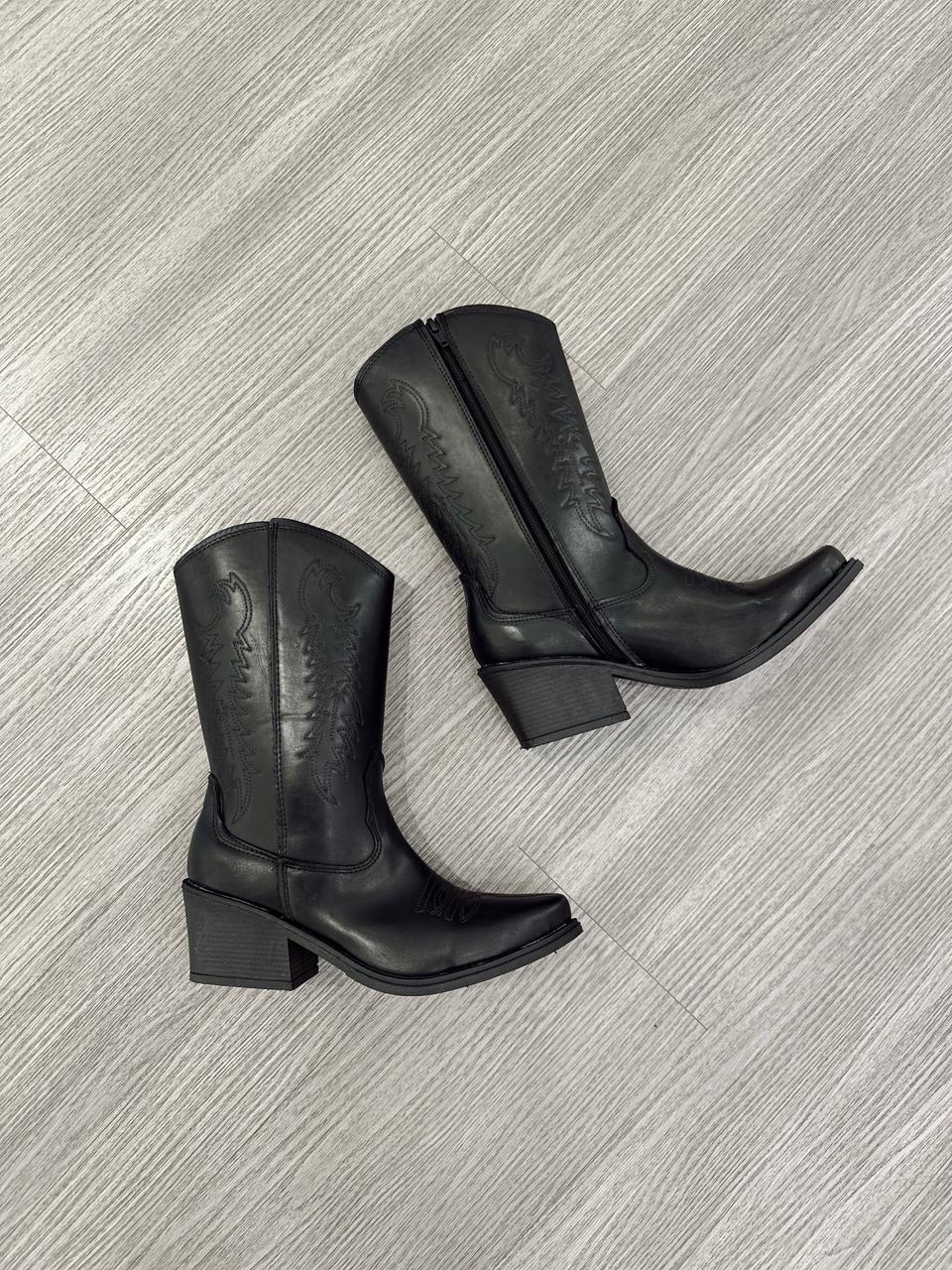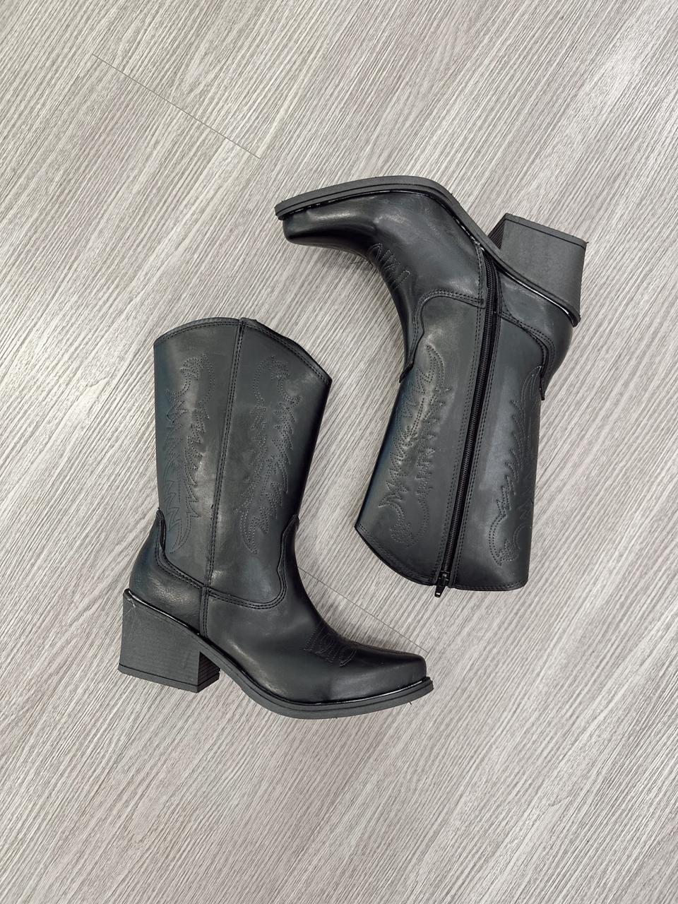 Texana de eco cuero bordada.MEDIDAS APROXIMADAS: Medidas contemplando la punta.-Plataforma: 1cm-Taco: 6cm-Caña: 22cm-Talle 36: 23,5cm