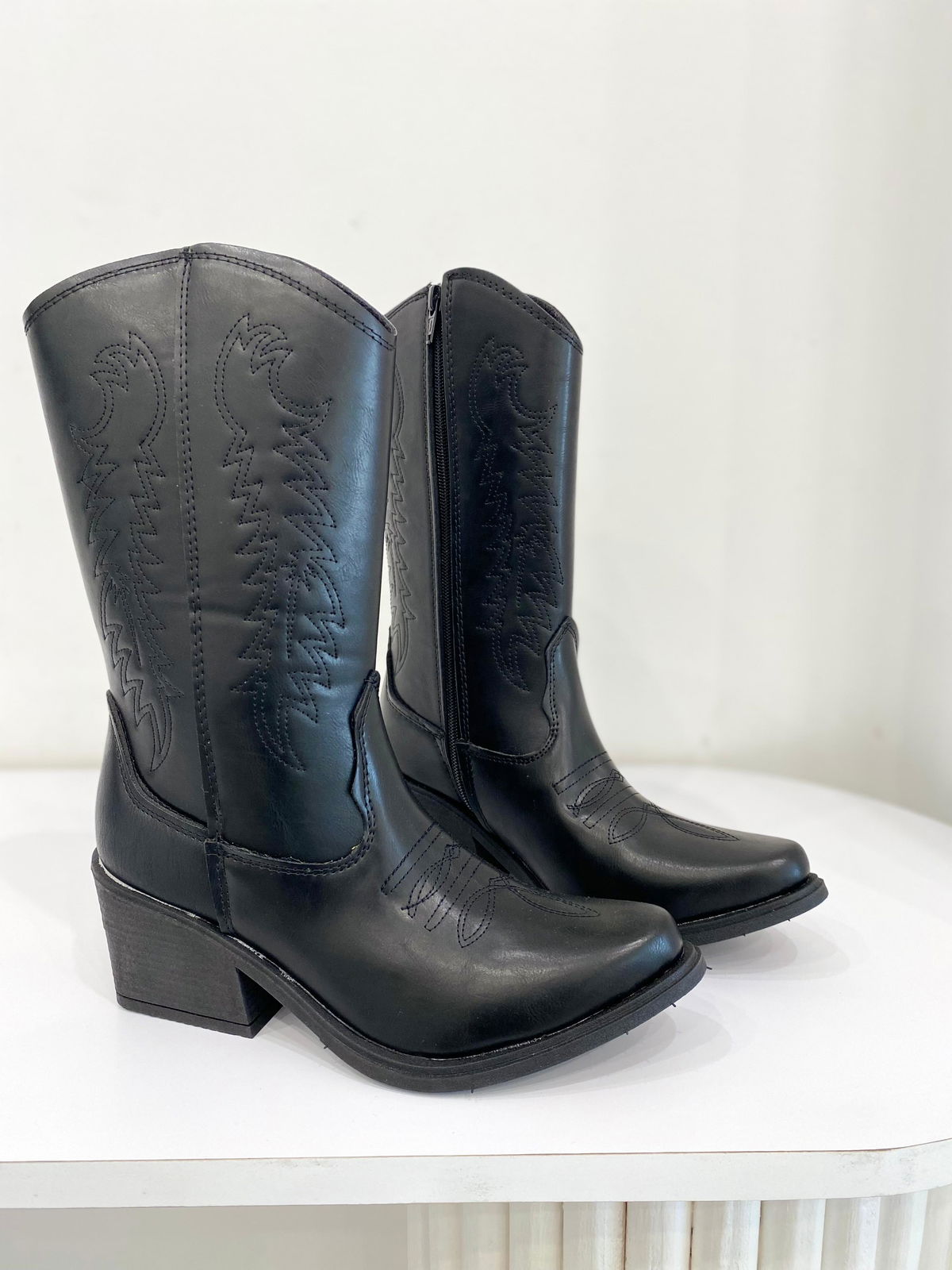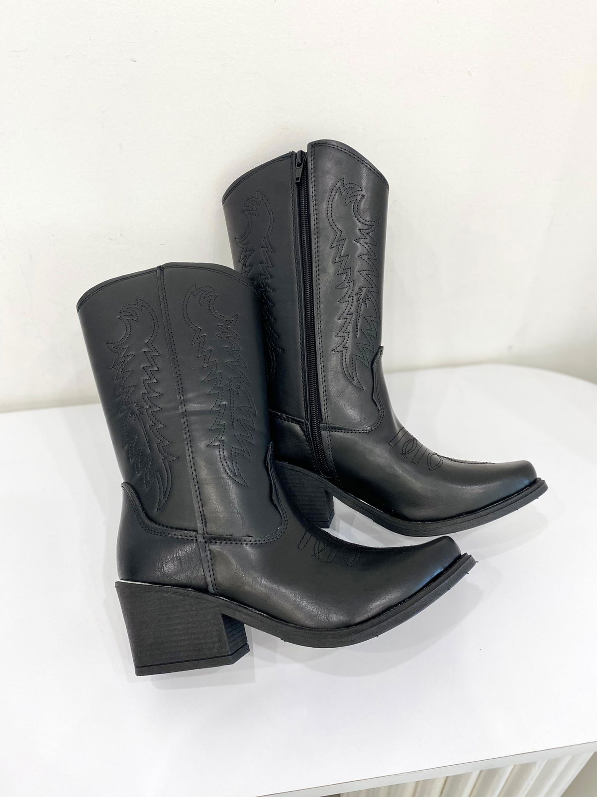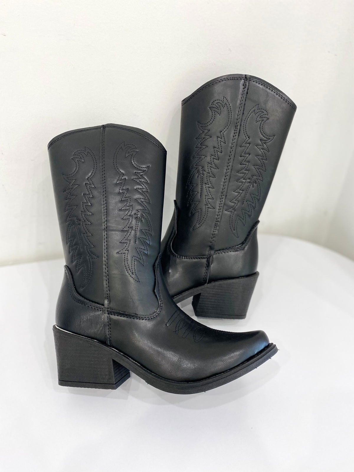 Texana de eco cuero bordada.MEDIDAS APROXIMADAS: Medidas contemplando la punta.-Plataforma: 1cm-Taco: 6cm-Caña: 22cm-Talle 36: 23,5cm