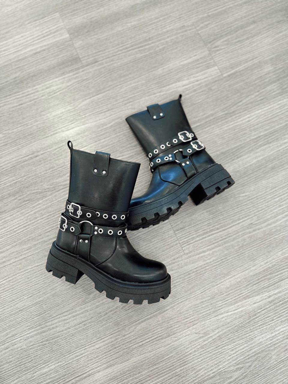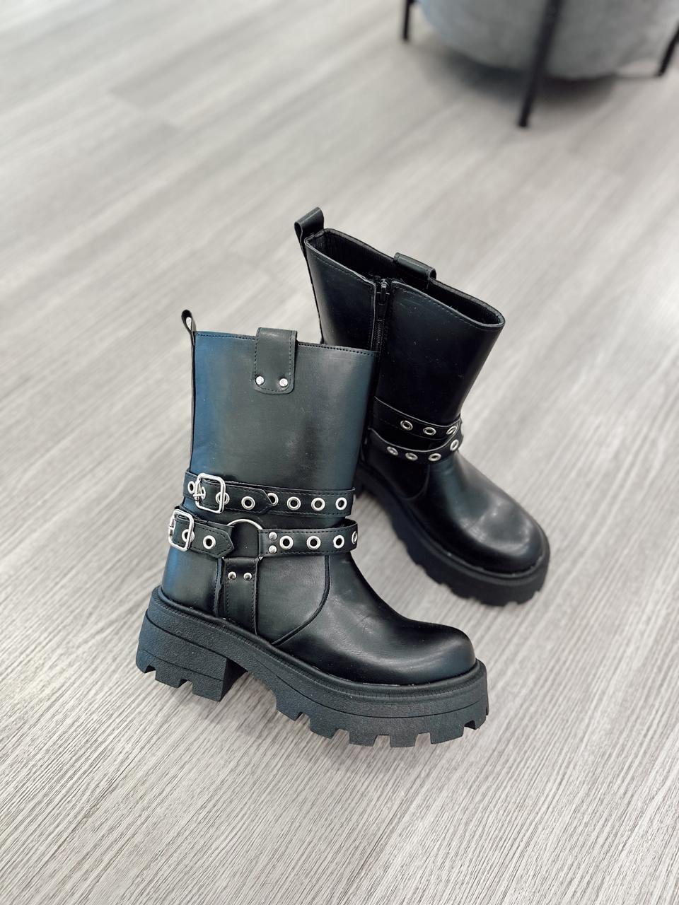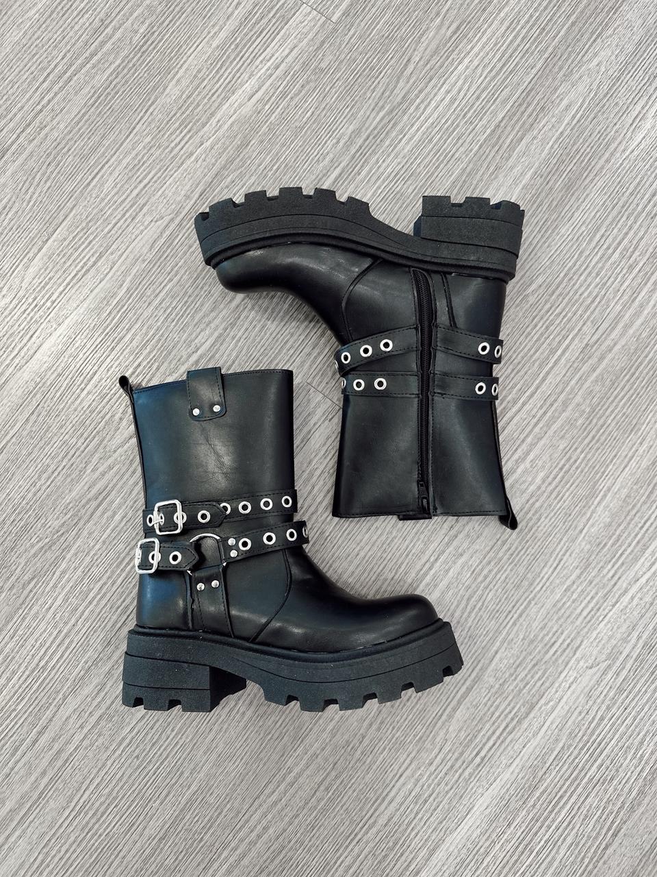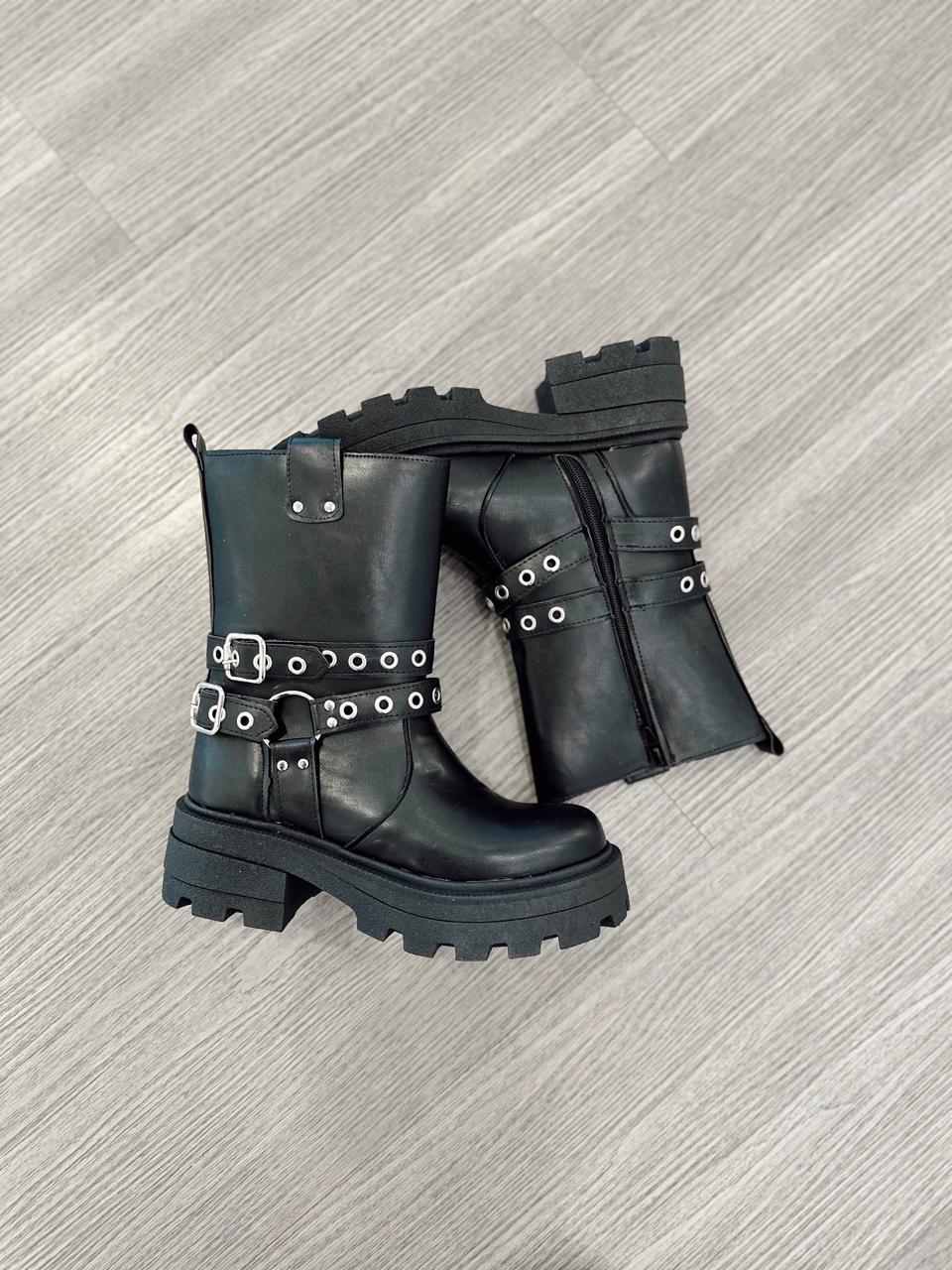Borcego de ecocuero con tiras, ojales y cintos no desmontables.